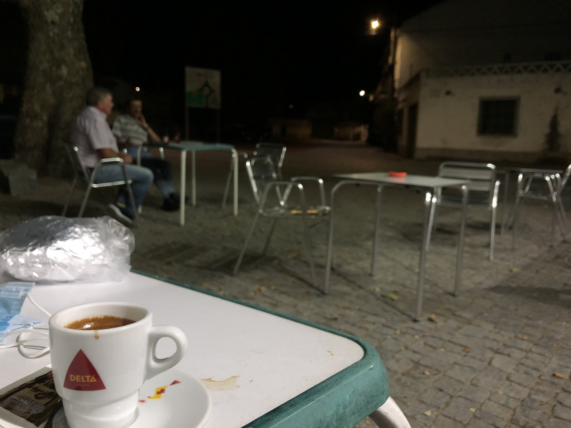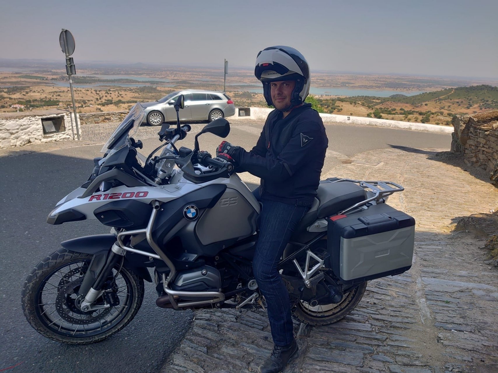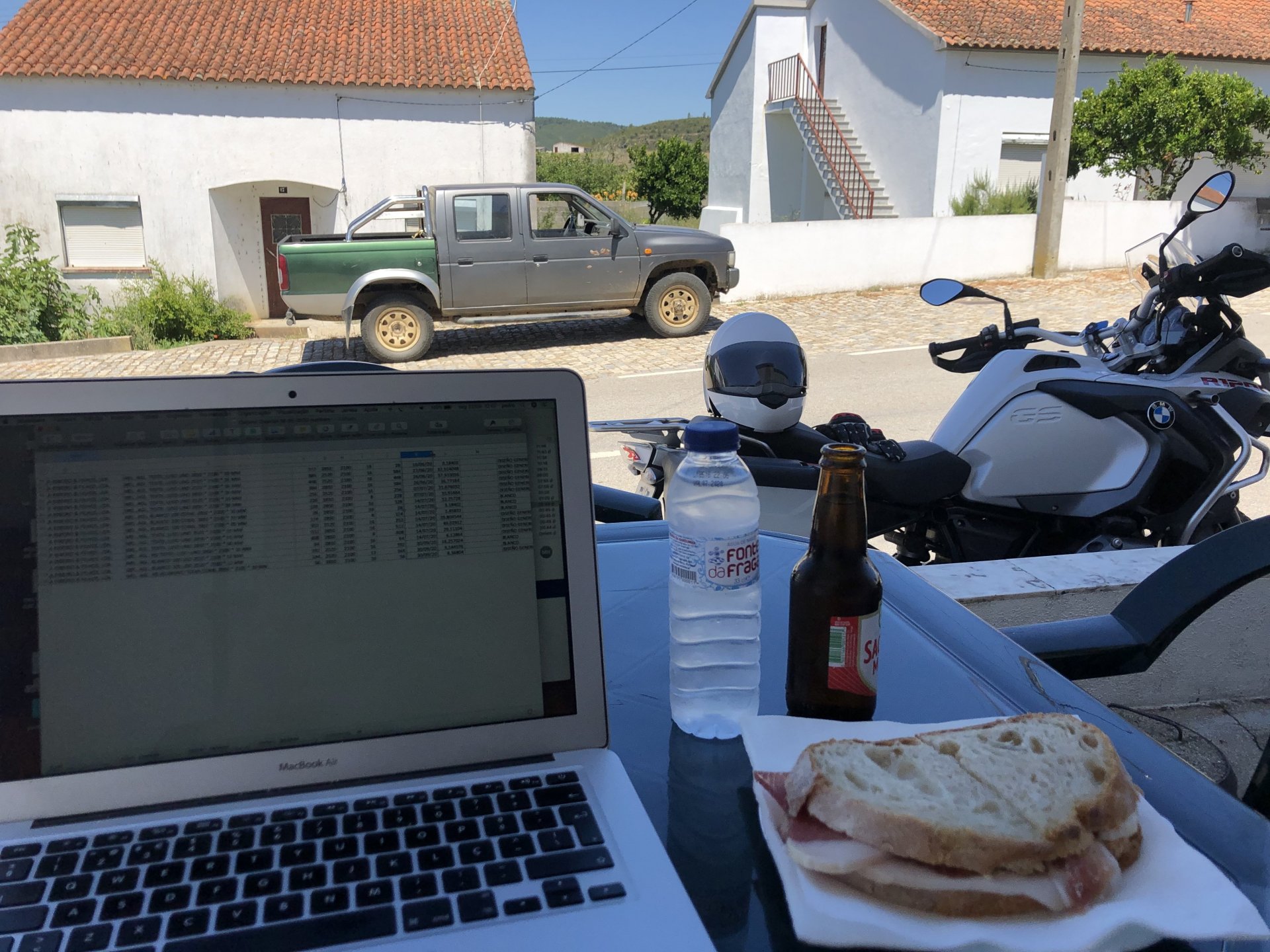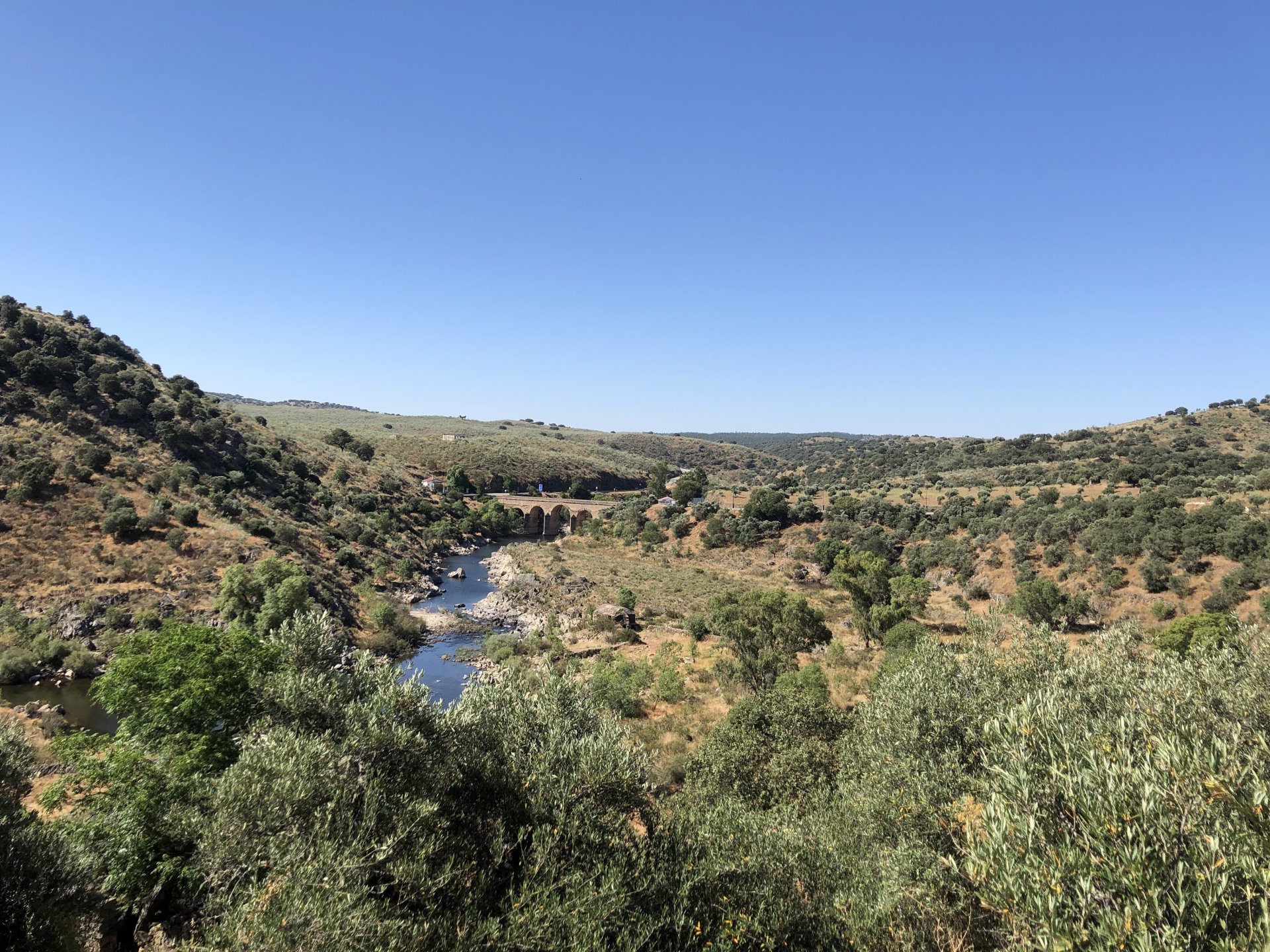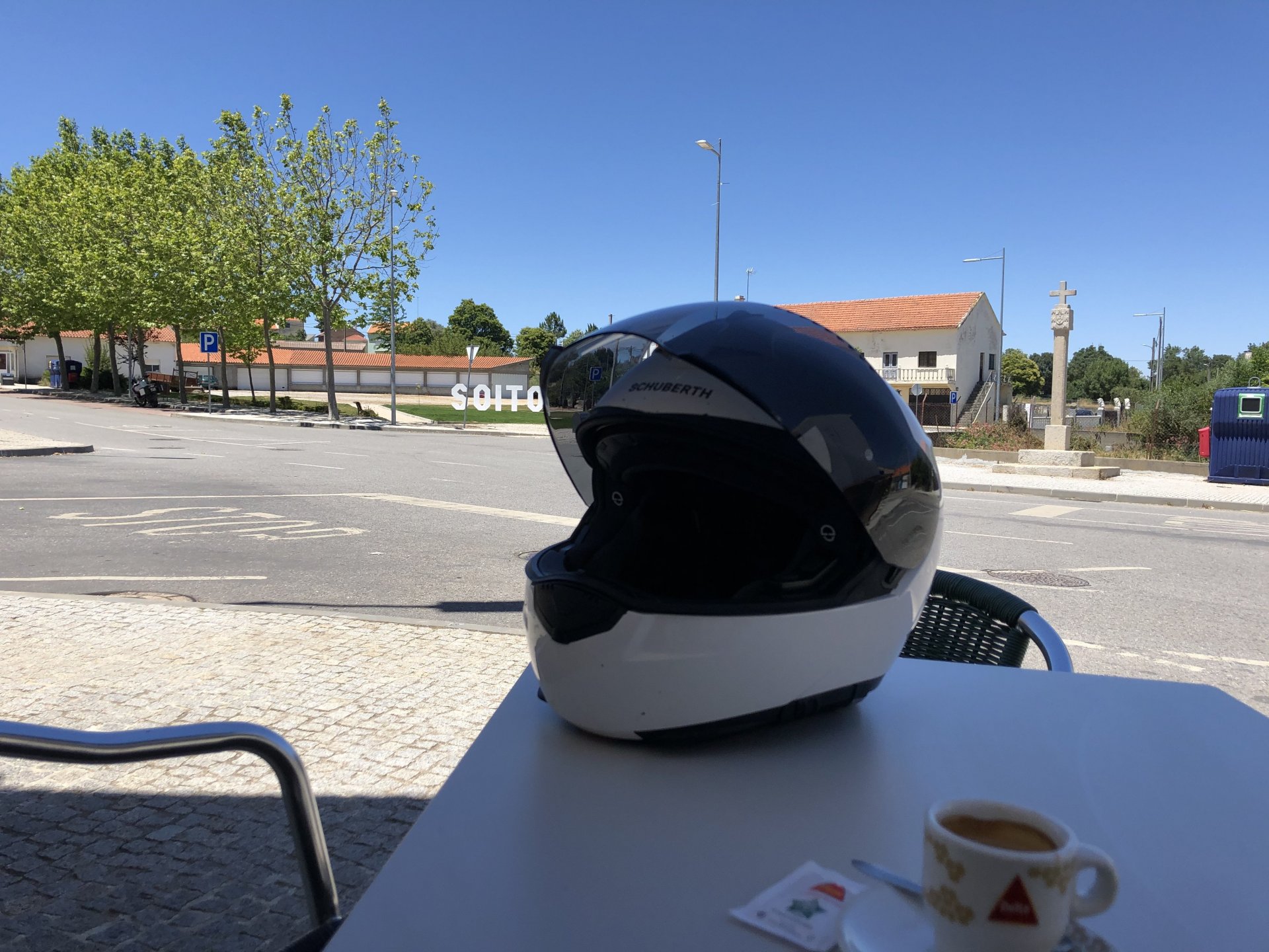 So, yesterday started well, not very warm by the time I left the hotel at around 9am, made my way to find some petrol as the bike was on reserve and in this part of the country you can ride for a while without fuel in rural areas, I mean 40km, not really such a drama. The big GS is quite frugal if you avoid motorways, and by the time I fueled up I had 600km on that tank with 50km range left. Landscape is changing now With a full tank I explore a little, there is no rush in going fast south, but I seem only be able to find dead ends, like this The grass is a little too tall for my liking, it's now getting a little hot and windy so I decide to go back to tarmac roads. A hot catalytic converter and tall dry grass is a great way to start a wildfire, and there has been enough of that over the last years. The road is good, though, I try to stick to small ones: See that on the other side of the river? That's Spain It's steeper than it looks My favourite road so far, as far as fun handling a motorcycle, it's barely wide enough for one van, and rolling and weaving through hills, with patches of dirt thrown in to keep it interesting: It was now getting hot, at around 11:30 it was over 37º, still I couldn't resist this dirt road: It only lasted for a few km, not even 15 I think. By now I am getting hot and hungry, so decide to find a small place for lunch. I stop at the first cafe that has shade outside, sit down and do a few calls and emails while I wait for my ham sandwich. Some water and a cold small beer go down a treat. Old lady in the cafe put some butter on the sandwich, "because I think this is your lunch, and you should have a proper lunch" Street scene, after these two dudes sat together having a drink inside, they proceeded to have a conversation outside while maintaining their social distancing , there's so much rural portugal in this picture ... Old lady over there in the shade with her cane is wearing full black, and it's 37º, she's got the cane ready for when the cat comes to shit on her flowers Back on the road, and a few kms later I stop to check my itinerary and a mini castle. Most common big birds now are storks: Pretty proud of myself taking this picture, and I go and put my thumb in it Half an hour later, the roads are ok but the heat is barely manageable. I stop at a fountain and wash my head to cool down. Last stop before getting to the hotel is Marvão and it's castle. It's very high up and worth it for the views alone. There it is in the distance: Make it to the hotel, and quickly make my way to the pool, to finish the day. I drank almost 1,5 liters of water just sitting there, plus a couple of beers, before starting to feel less thirsty. Sofia joined me for dinner, I had some greats cuttlefish and clams cooked in garlic and olive oil, it was amazing. Too much wine was had.