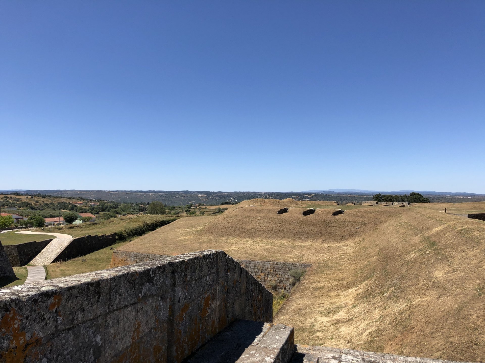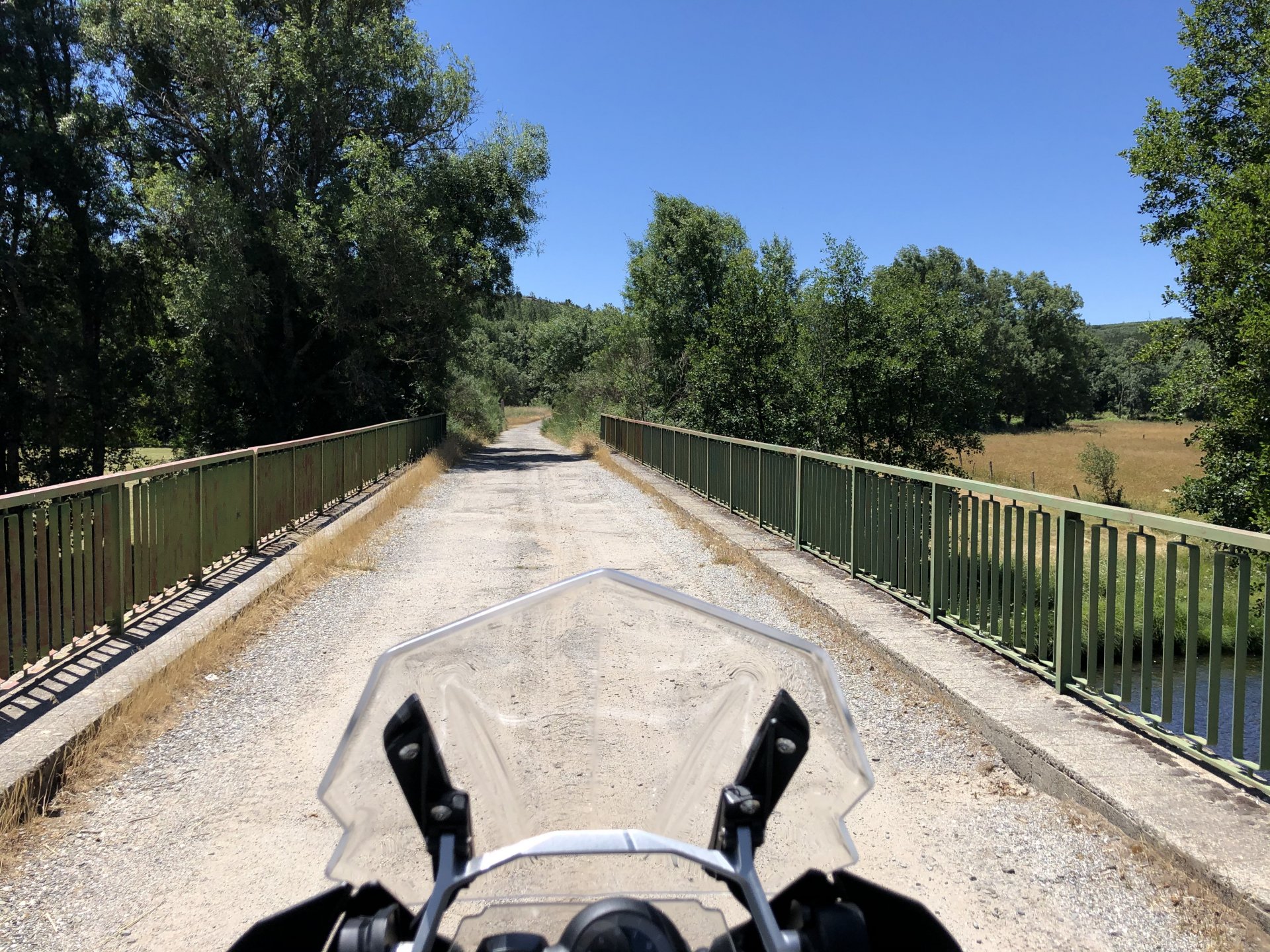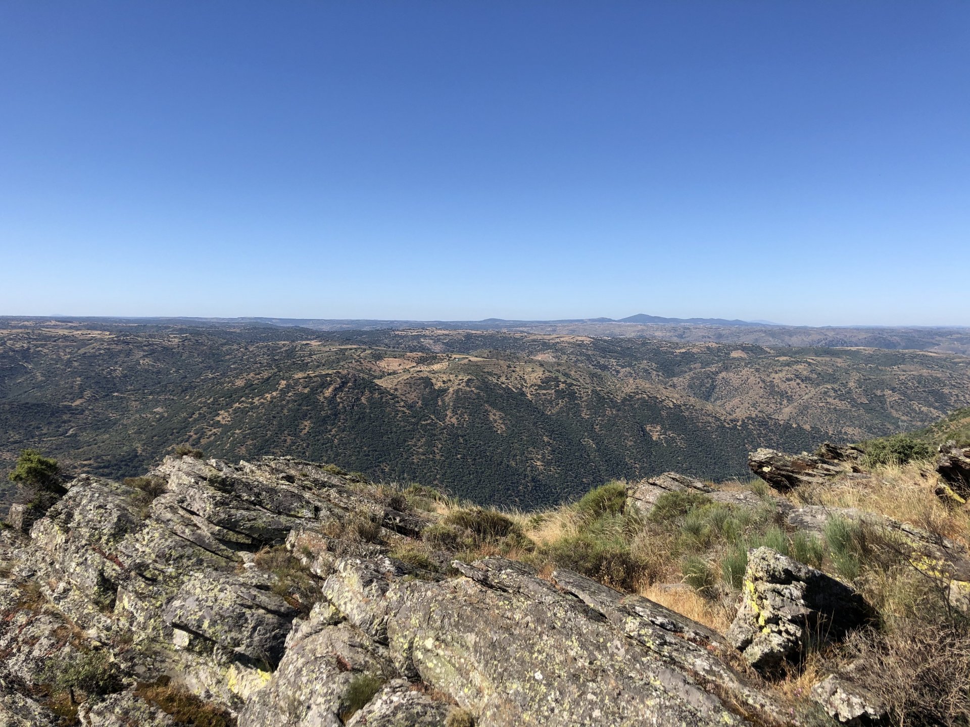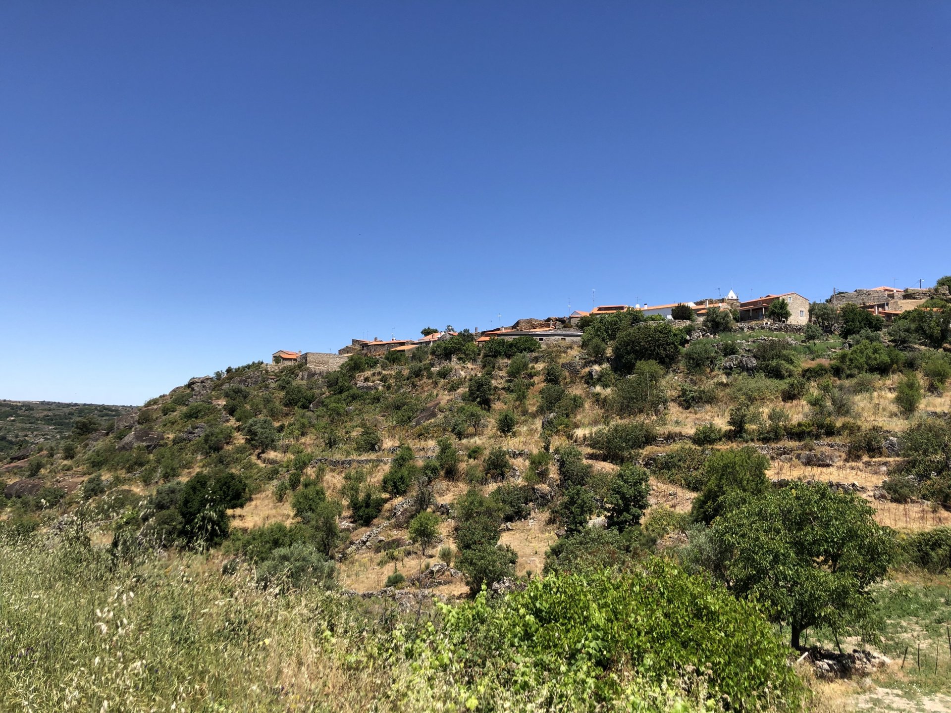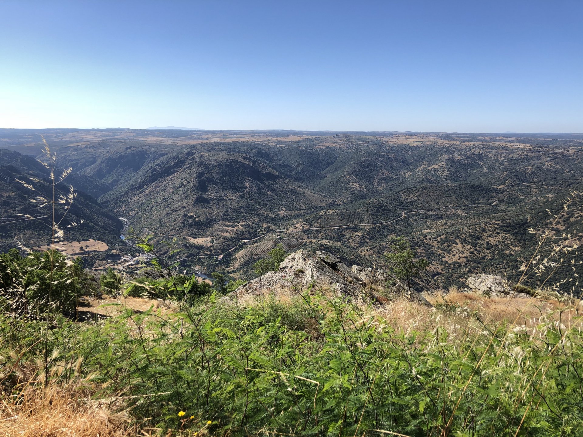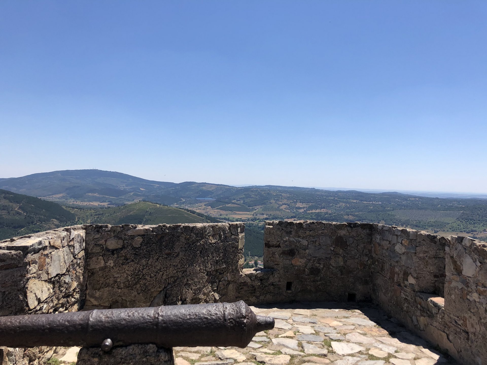 So, yesterday started well, not very warm by the time I left the hotel at around 9am, made my way to find some petrol as the bike was on reserve and in this part of the country you can ride for a while without fuel in rural areas, I mean 40km, not really such a drama. The big GS is quite frugal if you avoid motorways, and by the time I fueled up I had 600km on that tank with 50km range left. Landscape is changing now With a full tank I explore a little, there is no rush in going fast south, but I seem only be able to find dead ends, like this The grass is a little too tall for my liking, it's now getting a little hot and windy so I decide to go back to tarmac roads. A hot catalytic converter and tall dry grass is a great way to start a wildfire, and there has been enough of that over the last years. The road is good, though, I try to stick to small ones: See that on the other side of the river? That's Spain It's steeper than it looks My favourite road so far, as far as fun handling a motorcycle, it's barely wide enough for one van, and rolling and weaving through hills, with patches of dirt thrown in to keep it interesting: It was now getting hot, at around 11:30 it was over 37º, still I couldn't resist this dirt road: It only lasted for a few km, not even 15 I think. By now I am getting hot and hungry, so decide to find a small place for lunch. I stop at the first cafe that has shade outside, sit down and do a few calls and emails while I wait for my ham sandwich. Some water and a cold small beer go down a treat. Old lady in the cafe put some butter on the sandwich, "because I think this is your lunch, and you should have a proper lunch" Street scene, after these two dudes sat together having a drink inside, they proceeded to have a conversation outside while maintaining their social distancing , there's so much rural portugal in this picture ... Old lady over there in the shade with her cane is wearing full black, and it's 37º, she's got the cane ready for when the cat comes to shit on her flowers Back on the road, and a few kms later I stop to check my itinerary and a mini castle. Most common big birds now are storks: Pretty proud of myself taking this picture, and I go and put my thumb in it Half an hour later, the roads are ok but the heat is barely manageable. I stop at a fountain and wash my head to cool down. Last stop before getting to the hotel is Marvão and it's castle. It's very high up and worth it for the views alone. There it is in the distance: Make it to the hotel, and quickly make my way to the pool, to finish the day. I drank almost 1,5 liters of water just sitting there, plus a couple of beers, before starting to feel less thirsty. Sofia joined me for dinner, I had some greats cuttlefish and clams cooked in garlic and olive oil, it was amazing. Too much wine was had.