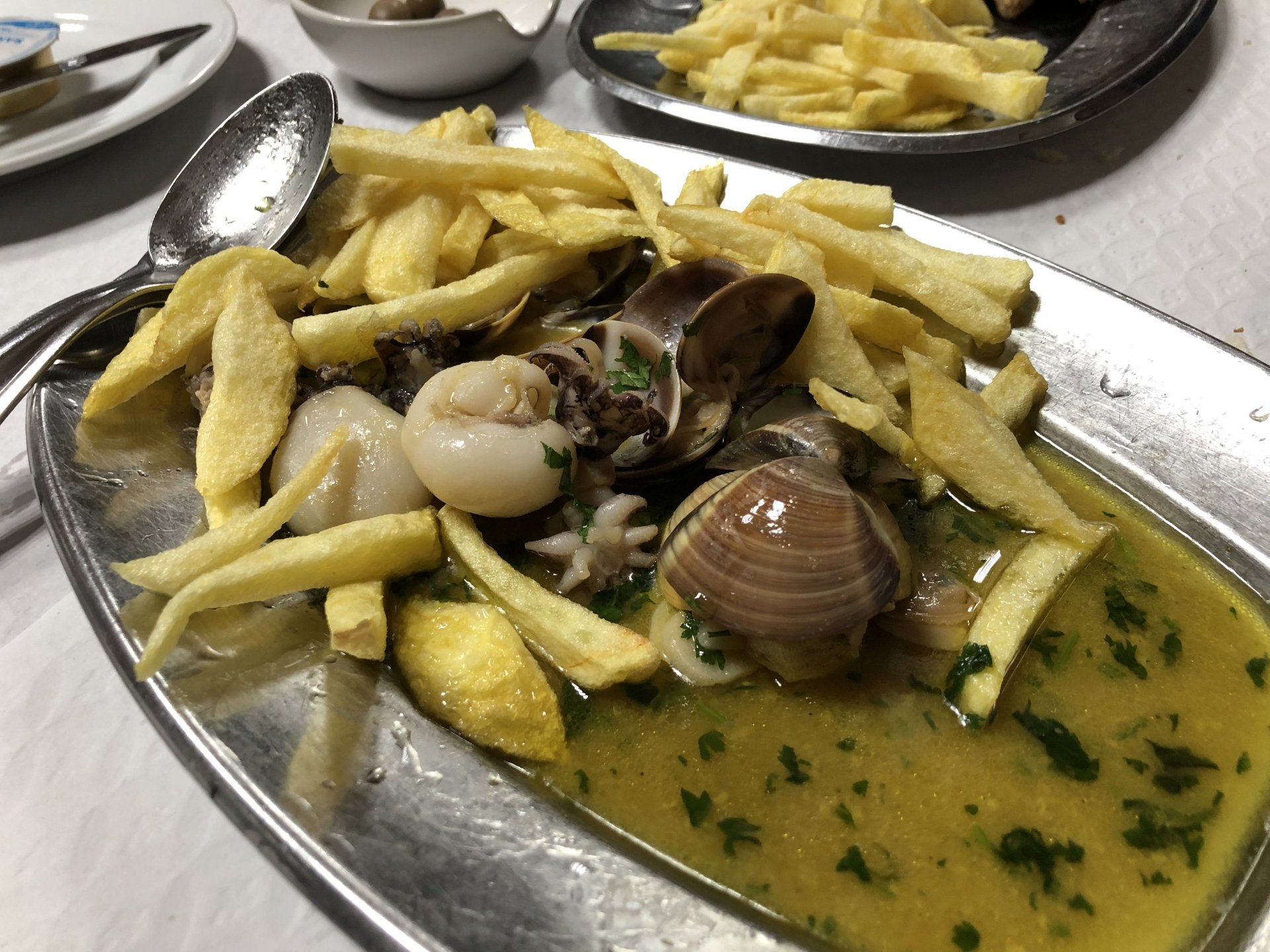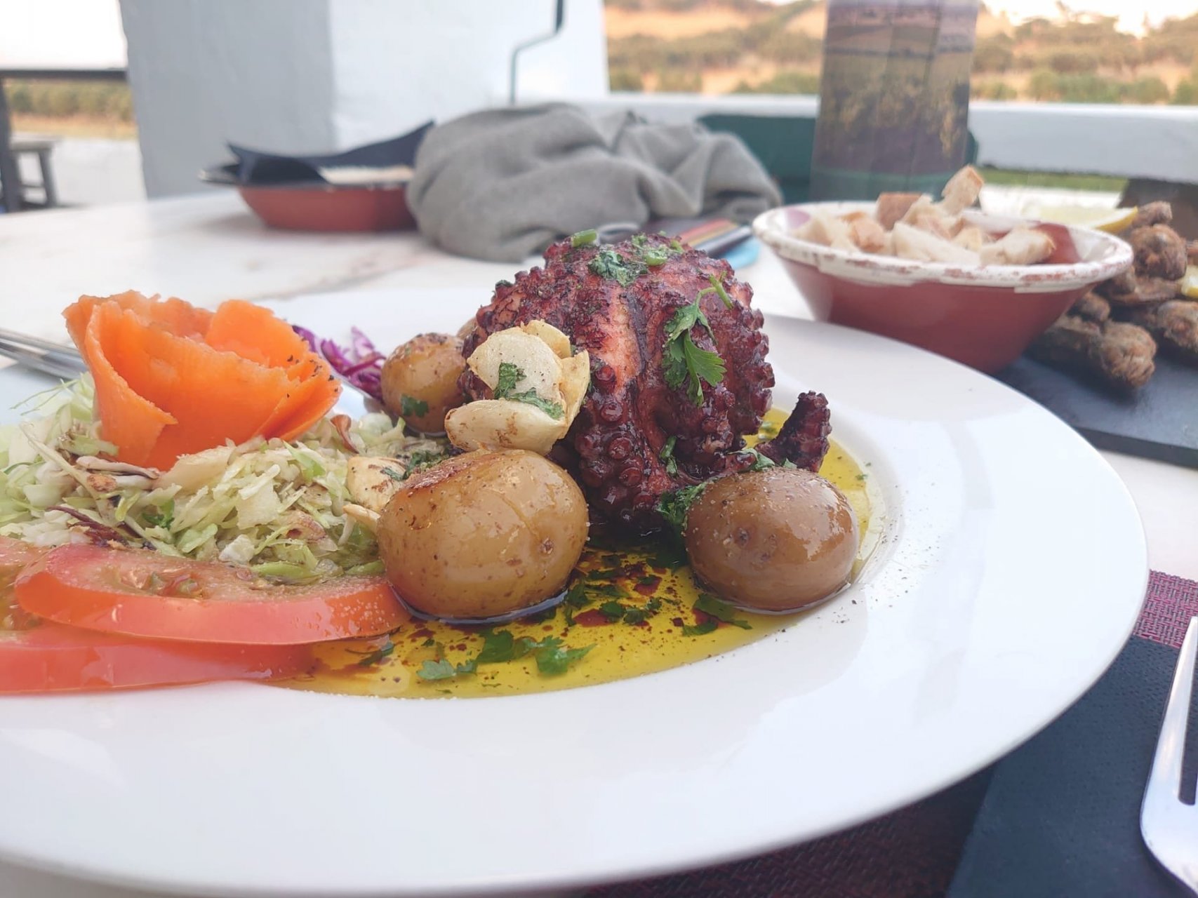 Earlier today: some nice vineyards as research for Sofia's south Portugal tour Had some average sandwich in a pretty sad looking place, which was unfortunate. However, it was very hot and we needed some food and water. Continuing on, we decided to split and meet up a little later, as I wanted to go via a nice dirt road, it started pretty smooth and great, However, ground turned to loose rocks, about the size of tennis balls, I was completely not happy with it, or confident. Bike felt too loose and I have little confidence in these tires holding their own against jagged rocks. To help things, it was now almost 40º and google maps decides to send me to a dead end. Ended up in some guy's farm, on a silty track amongst some vines. I was not a happy camper. Heard some voices so stopped the bike and went into the farm, where the dude was cool enough to point me the right way, on a nicer track that showed nowhere on my maps. Crisis was navigated successfully, and I manage to see the guy's alpaca Too bad for the bike, which is now covered in dust. All's well when it ends well We were quick to make a reservation to the nearest swimming pool, have a snack And, after resting from the extreme heat of the afternoon, going out for dinner. This is fried mackerel in one picture, and octopus in the other, you'll think it's weird, I think it's normal and yummy. Again, too much wine was needed, It's my birthday today, like I need an excuse!