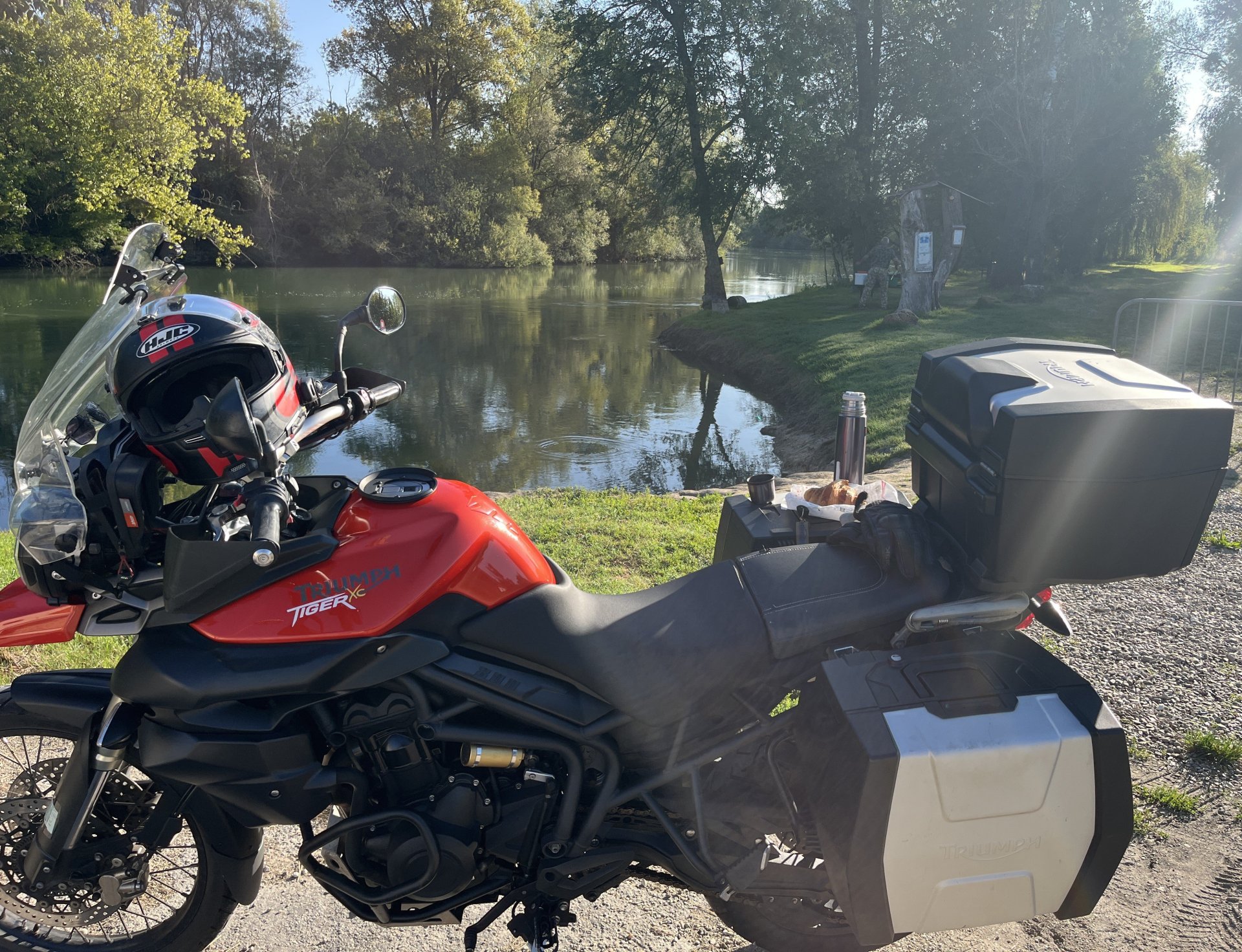 Bob's bike looks like it has snail eyes with the two mirrors pointing up. Buckster's bike has got two backrests AND a black top box, just saying. Marcel's bike can't be faulted, very cool, except for those ugly luggage bars in the back. Moon's Tiger is the prettiest color Tiger there is, and there's something cool about a big trailie being used as a breakfast table, complete with french croissant. Justapor's bike has it's own backpack, plus as far as gay tires go, those look very nice. Renegade´s Gladius, I don't know if they already came up with an excuse for it. Sir Fallsalot XTrainer, the bike's name sounds like something you buy at a sport shop to go running, and also I'm pretty sure he's exiting the house just before sunset on purpose for a BOTM shot. Six's 765, it's still got the blue plastic wrapping, and also looks smaller than his nephew's 390. I haven't got a picture for this month