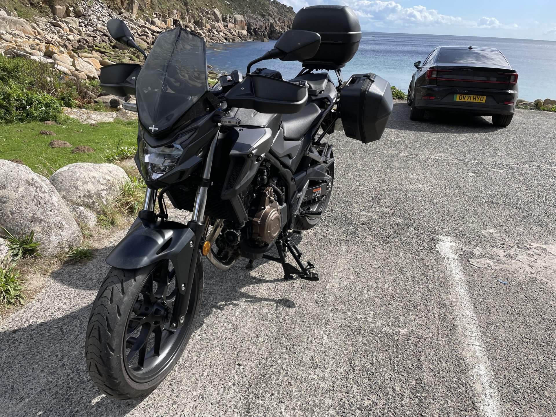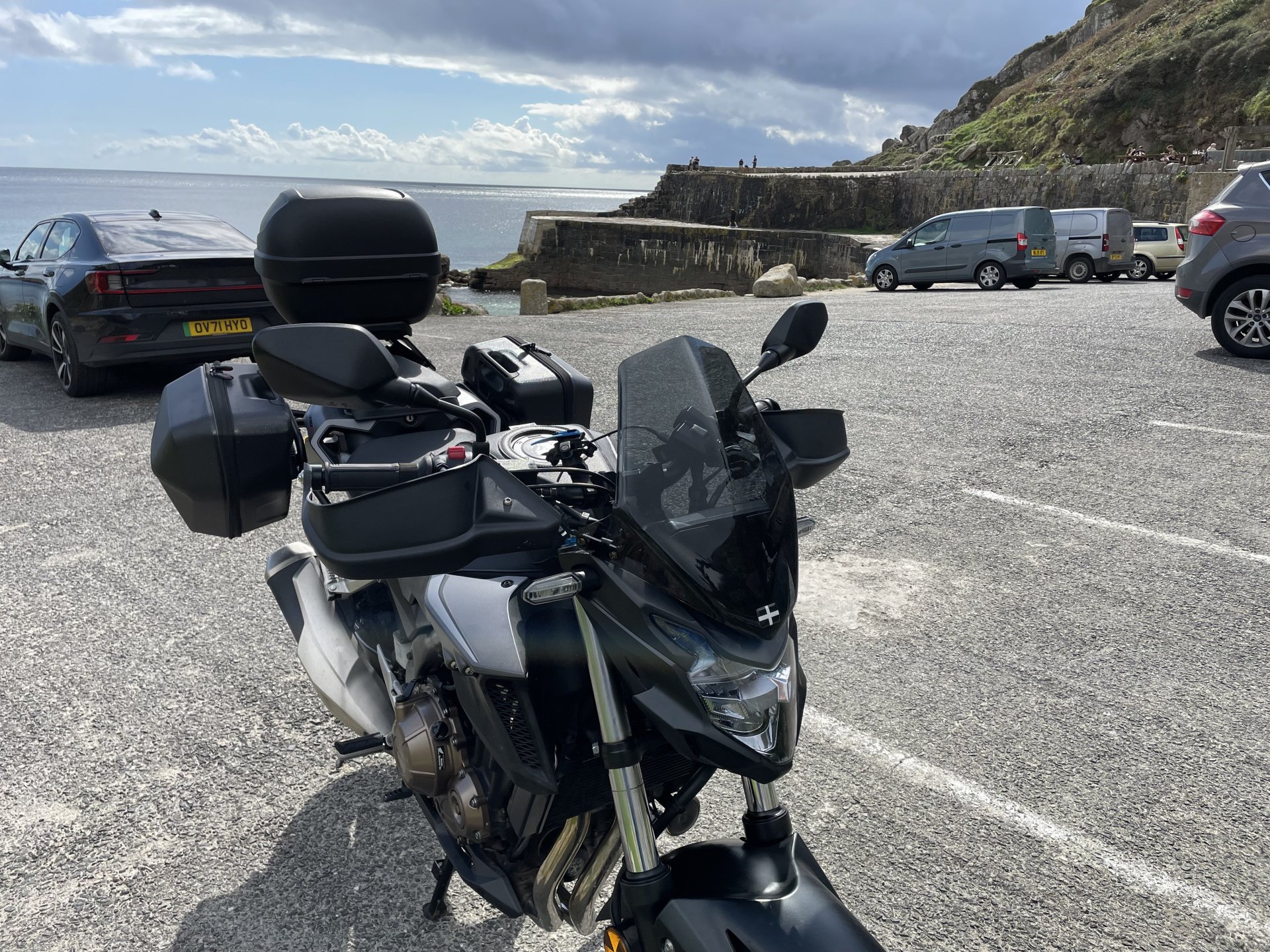 At a loose end today so thought I would pop up to Exeter to have a look at the shiny things in Bridge Motorcycles. A big multi dealership. Honda, Yamaha, Suzuki, Kawasaki, BMW, BSA and Triumph. Never been before and fancied a jolly. Really big selection of big late model bikes. I liked the look of this AT plus there a couple of Z1000’s kitted out for touring that I liked. Not that I am planning to change but it is nice to look. Also took a real shine to this Tiger 660. I wonder if they do lowering kits. I had a spud in the on-site Cafe the headed out across Devon to get to Bude on the North Coast. Really nice ride on some lovely biking roads. Bude was as lovely as ever. It made a change coming into it from the North side. Coffee ice cream went down well. Trip stats plus a sore ass. Also the Mrs has gone dark cause I said I would only be a couple of hours