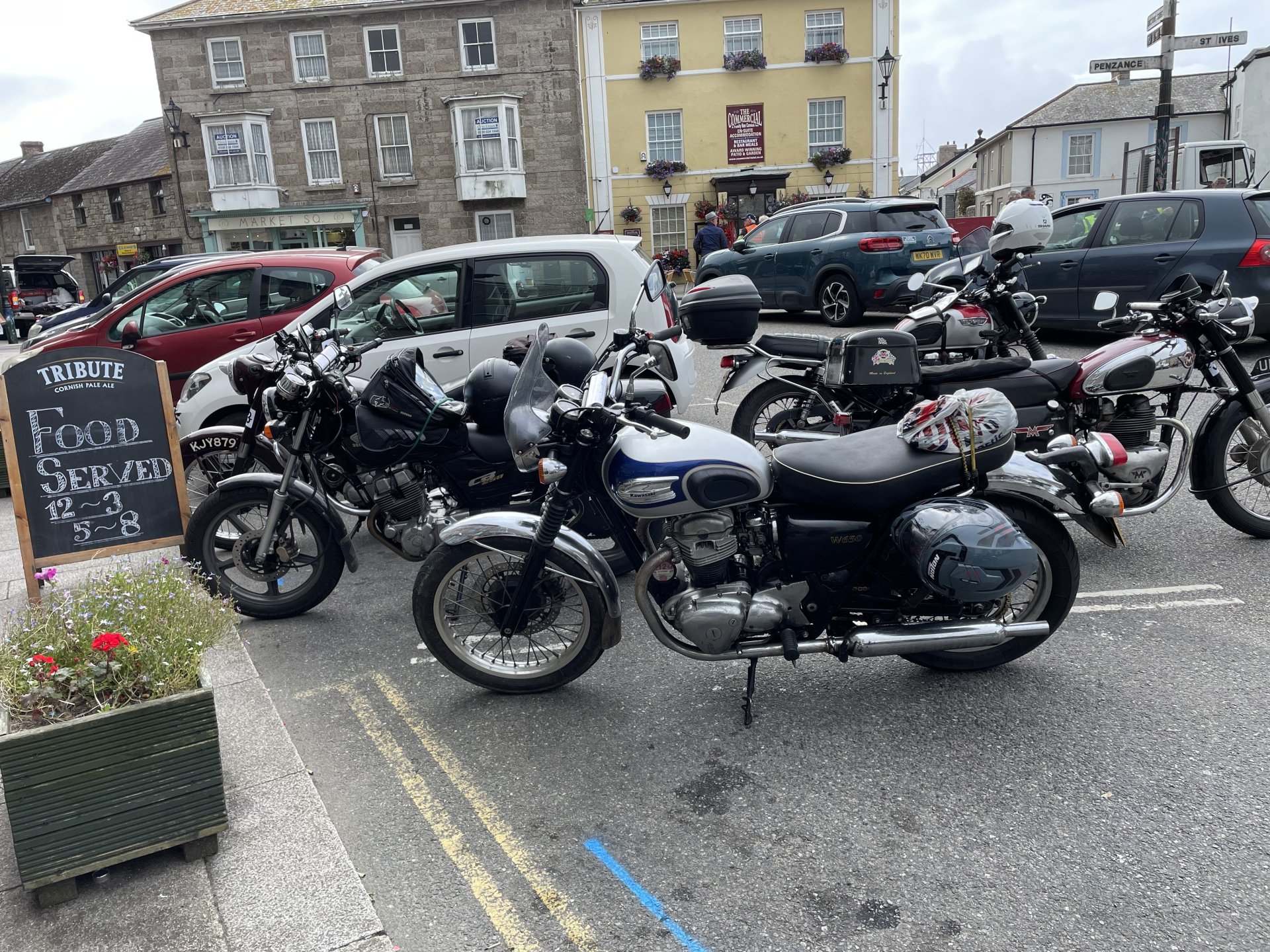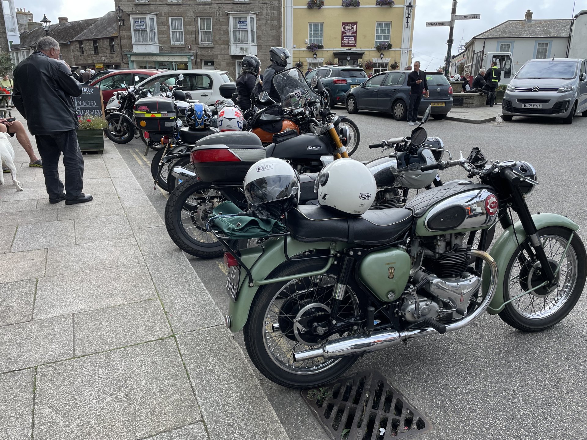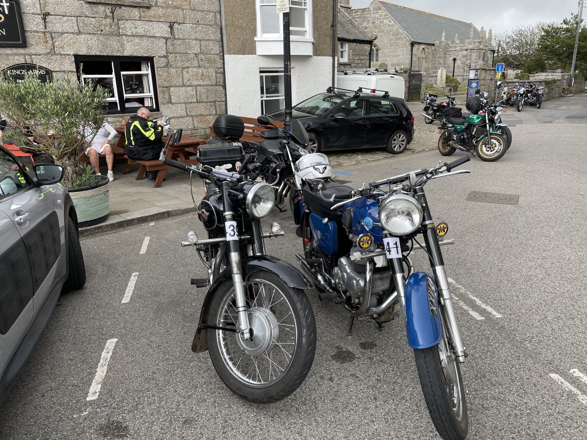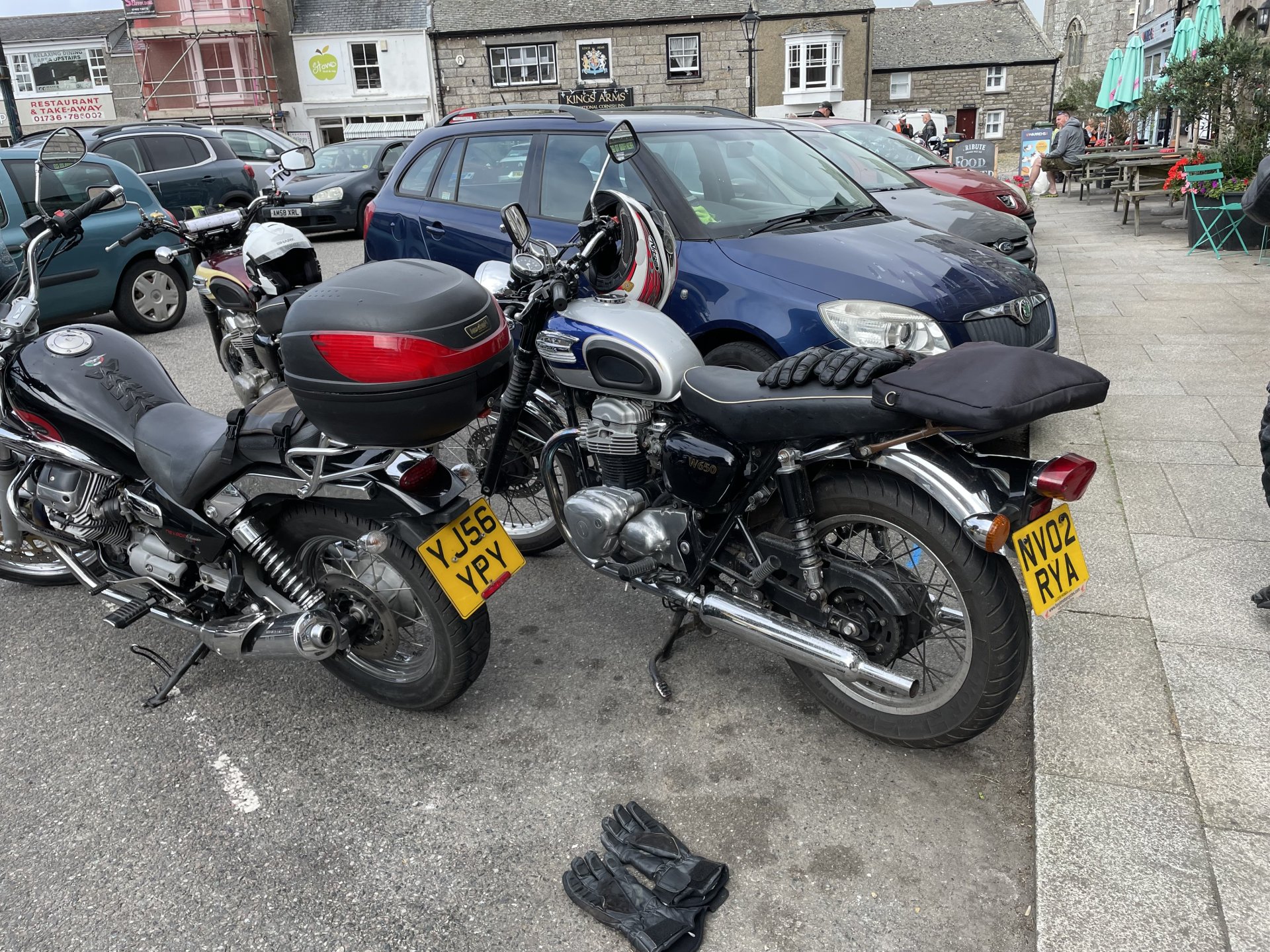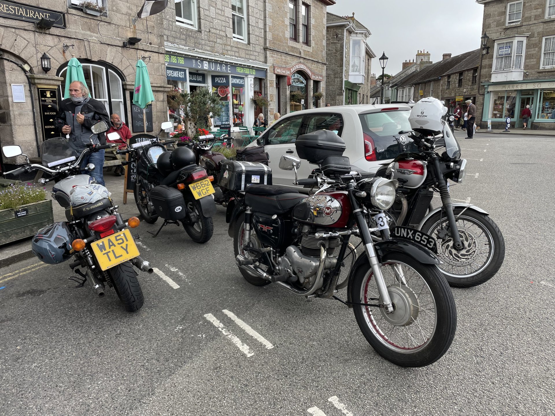 Needed to get out for a bimble to clear my head so I headed west down to Lamorna Cove, like in the song. Only about 60 miles but I chose to go down the coast via Falmouth, Helston and then Penzance. Still packed out down here. Newly Wed and nearly Dead season now the Kids are back to school. Got the full bondage gear on my bike, well panniers and shoes at least. After Lamorna I traveled back through St Buryan to St Just. Where I happened on a rally of classic bikes. Then rode back through Trencom to St Ives.