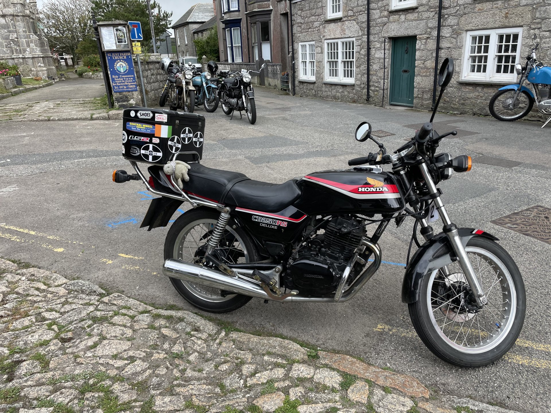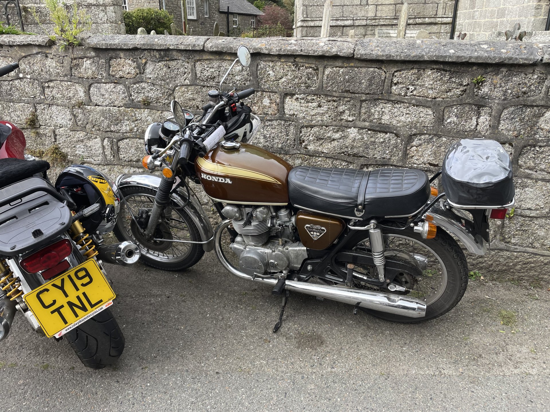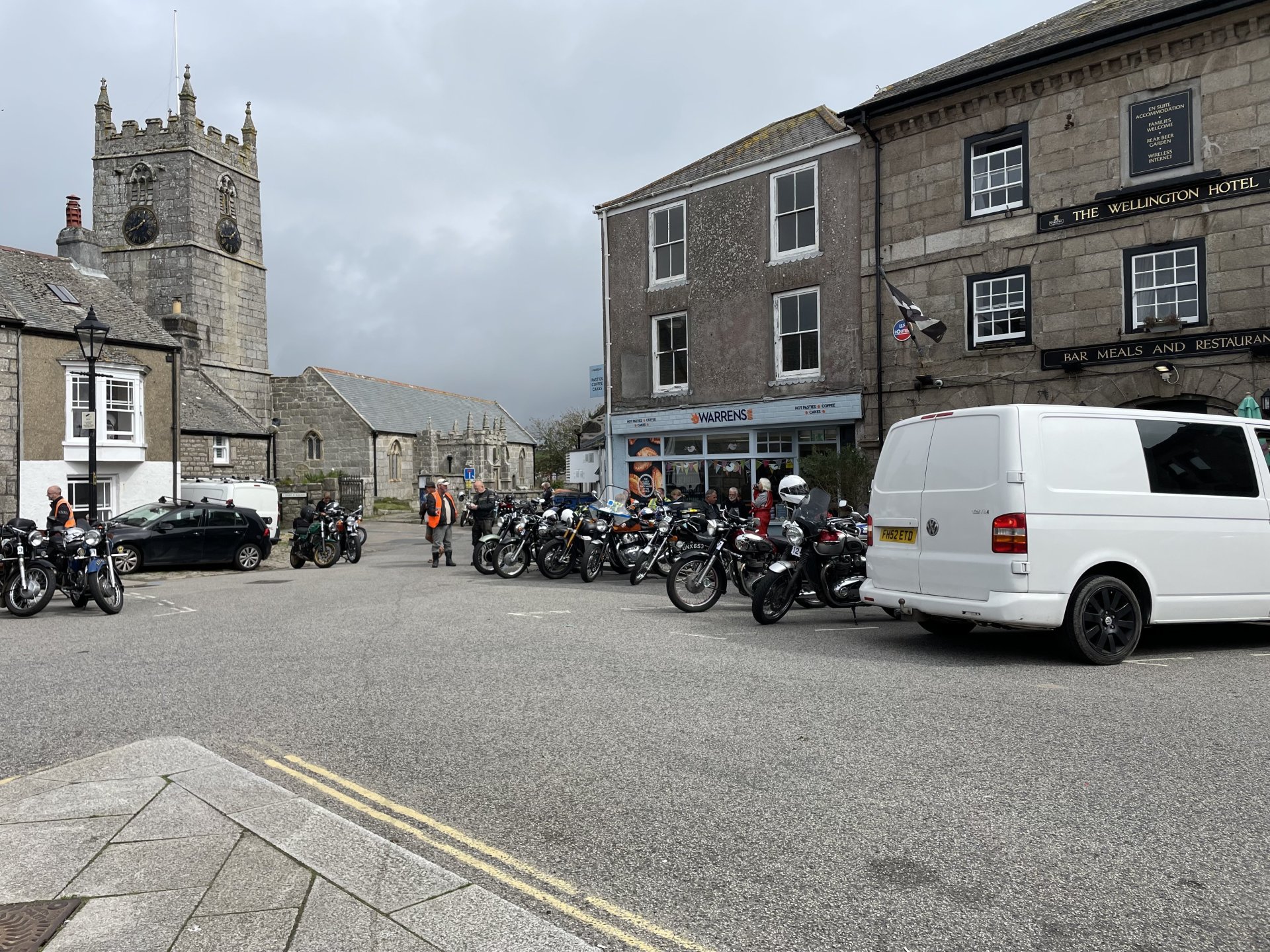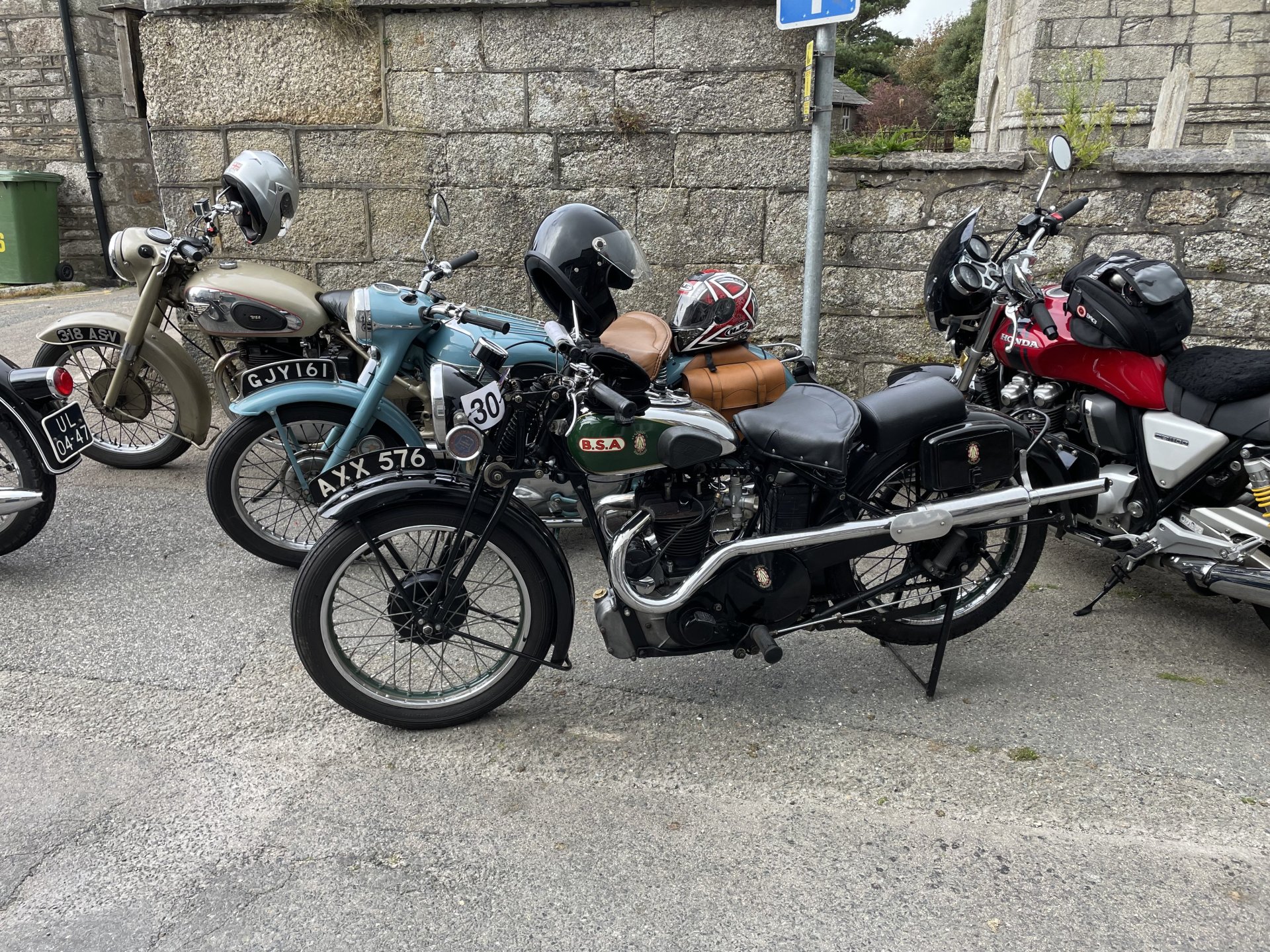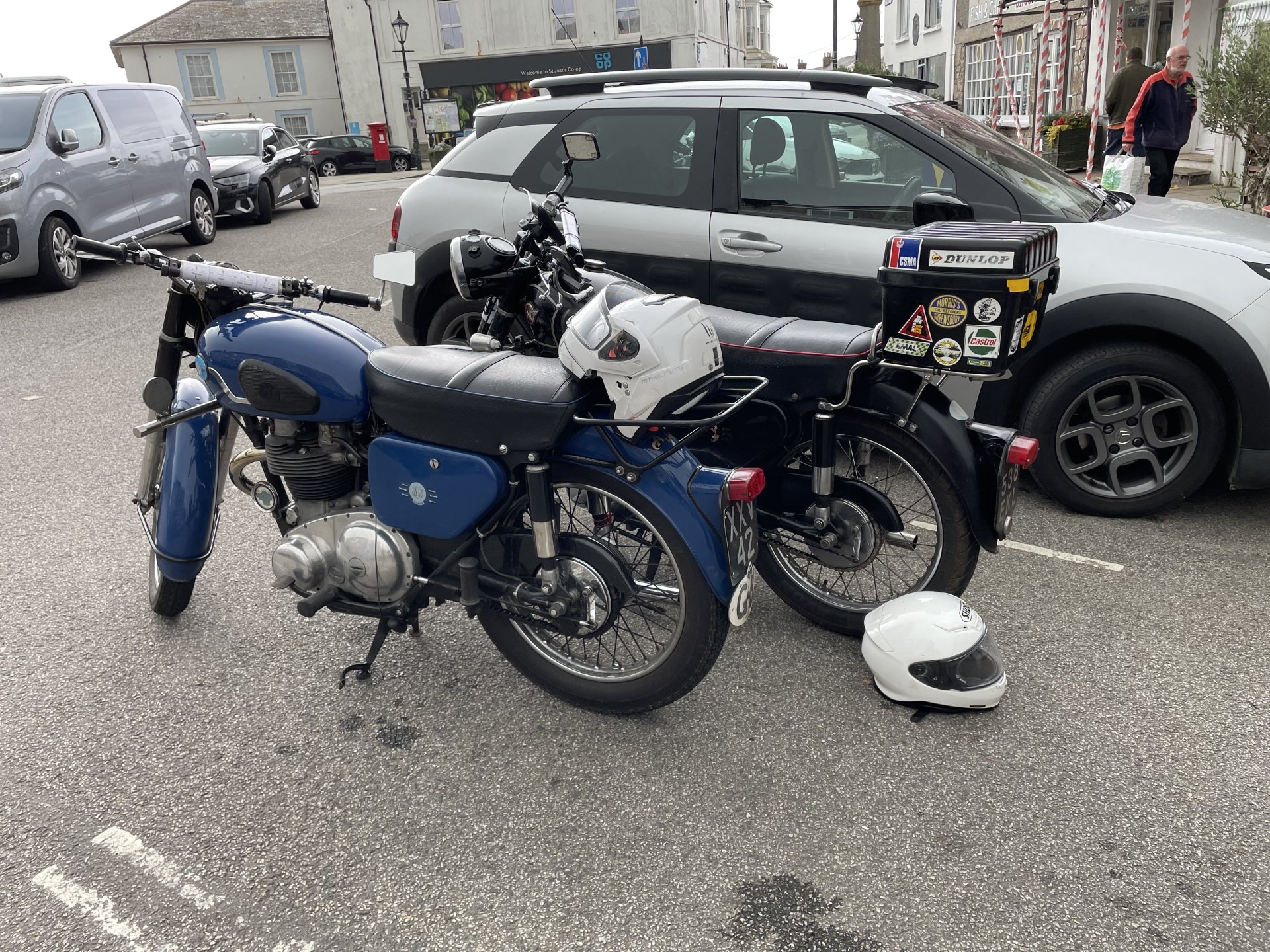 Needed to get out for a bimble to clear my head so I headed west down to Lamorna Cove, like in the song. Only about 60 miles but I chose to go down the coast via Falmouth, Helston and then Penzance. Still packed out down here. Newly Wed and nearly Dead season now the Kids are back to school. Got the full bondage gear on my bike, well panniers and shoes at least. After Lamorna I traveled back through St Buryan to St Just. Where I happened on a rally of classic bikes. Then rode back through Trencom to St Ives.