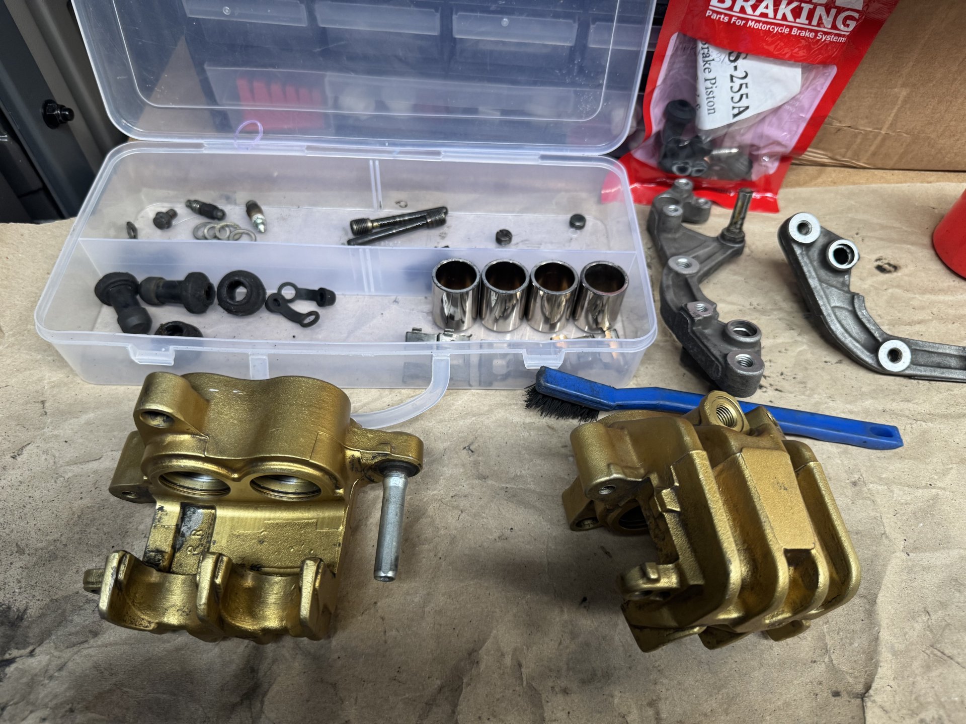 My CBF600S has the wrong colour front brake callipers. They have obviously been replaced at some point with callipers from a naked CBF600N which are black not gold. They are functionally identical and work fine but it is getting on my tits that it’s wrong. So for no other reason than to satisfy my OCD, I am going to replace them. I got a second hand set of gold callipers from eBay for £27 and at the same time I ordered a rebuild kit for them for £34 from Wemoto. I started stripping and cleaning the callipers up today and to my surprise they are pretty good. All threads perfect and pistons appear spotless. I am waiting for the tool to come to get them out and polish them up. I know there are other ways to get the pistons out but I wanted the right tool which is coming tomorrow. I would guess that I don’t really need to replace the seals but I am going to because I have the new ones on the bench. First attempt at cleaning has brought them up quite well. There are a few minors blemishes here and there but I think the callipers will look fine once they are on the bike, after all it is 18 years old. Of course there will be more cleaning before I fit the new seals. Before anyone pipes up, if this is boring fuck off and read about Marcy’s adventures. I am a bike geak and I like this sort of stuff.