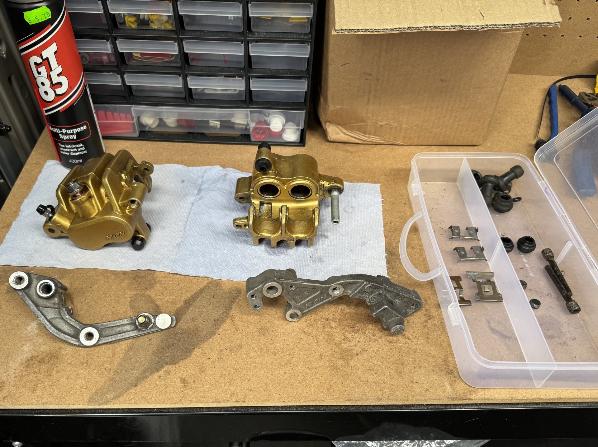 More cleaning, almost ready to rebuild. Managed to get most of the smoo off the callipers onto me. Therapeutic to do though.
