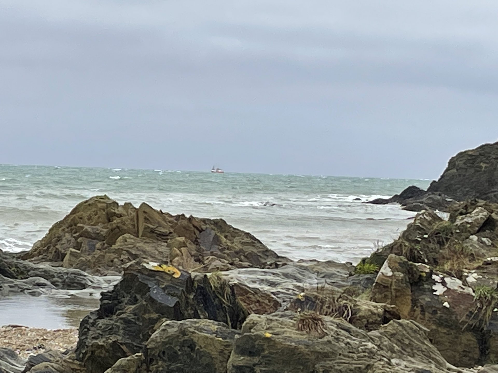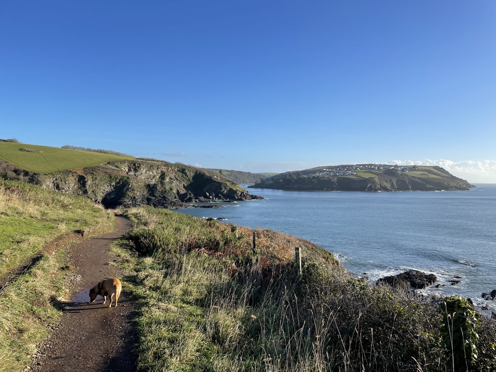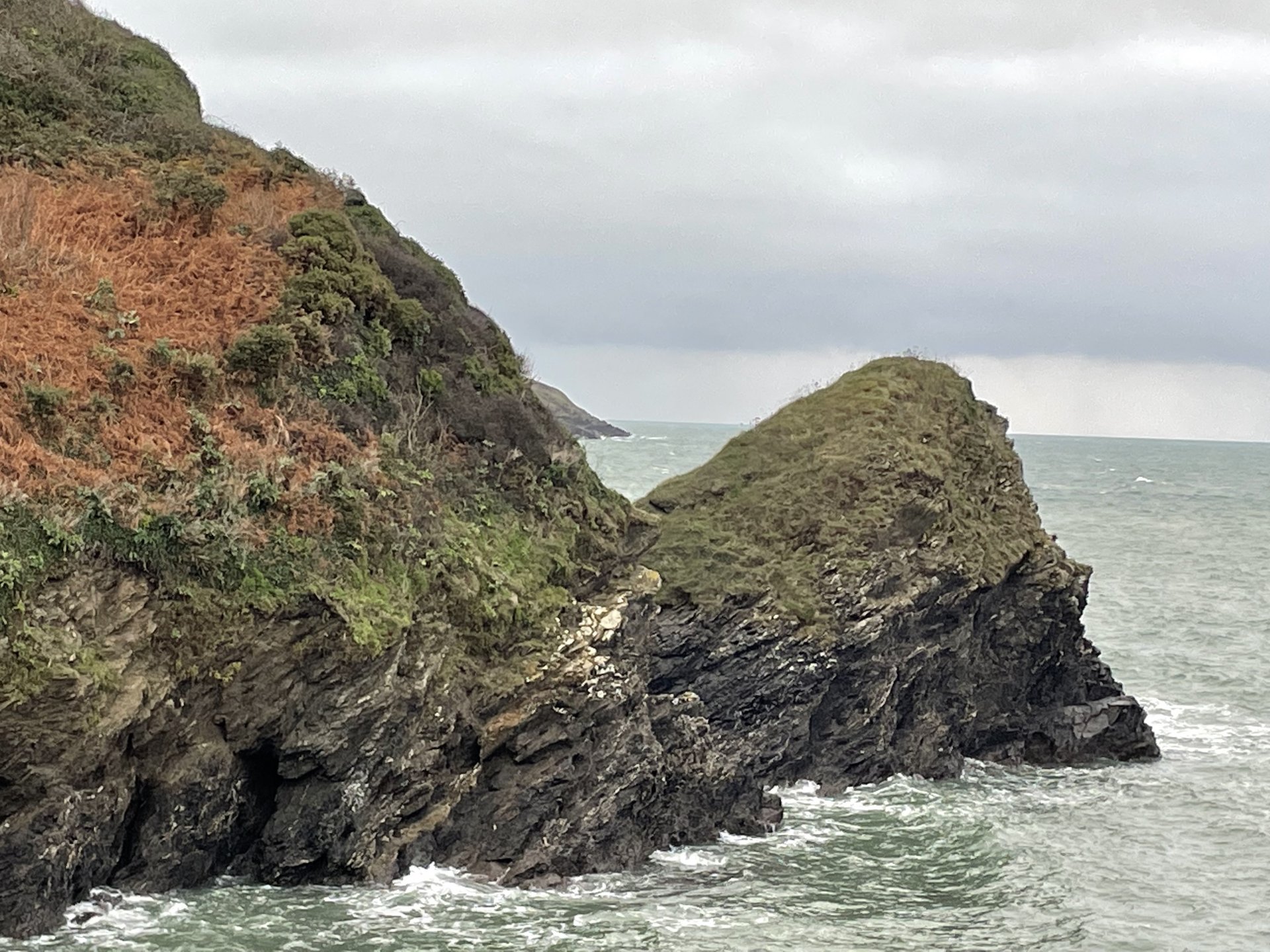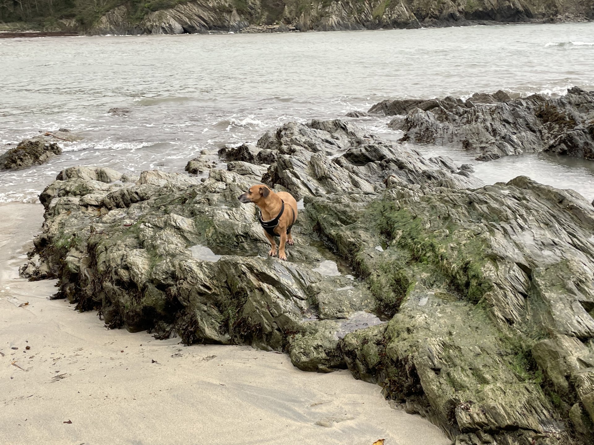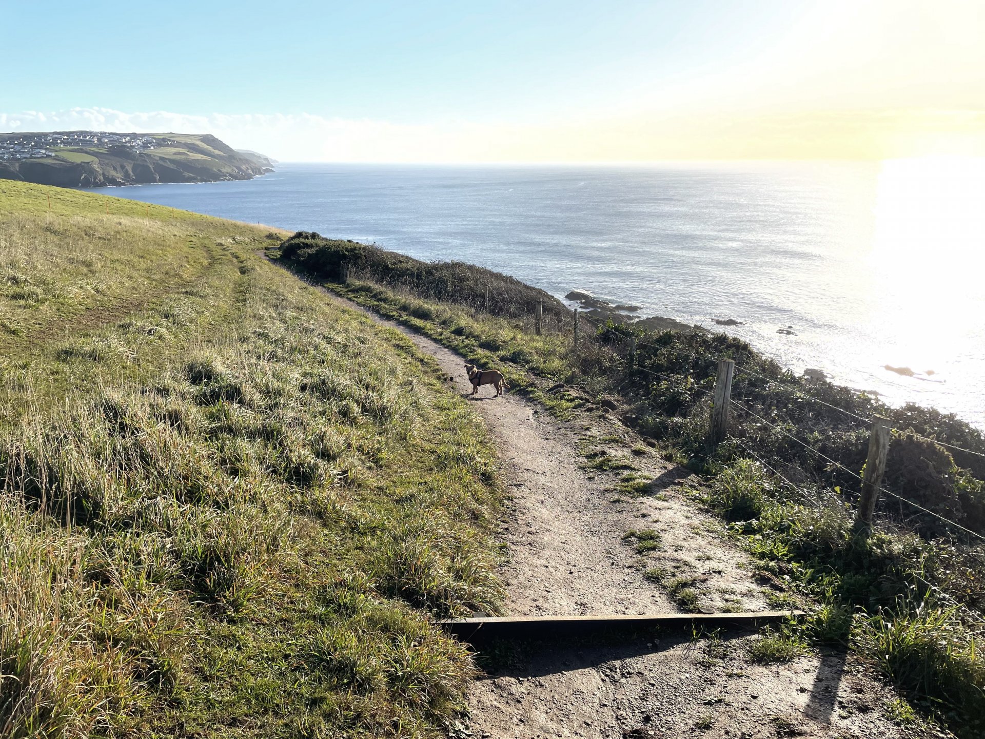 Out and about with the Dear Boy today, Did a loop around the cliffs and home, I misspoke before it was 7.7k not 7.5. Just checked my watch thing. Noticed a lone fishing boat out in the bay. On Thursday you normally see a warship out in the Bay as we aren't that far away from Plymouth. I haven't seen one for weeks now which makes me think they are elsewhere. For some strange reason Odie, the short ginger fella, loves a bit of rock hopping. He once saw a crab and has been looking for Mr Pinchy ever since. Walking up out of the beach I saw some green and pleasant land that I thought Pete would like the look of