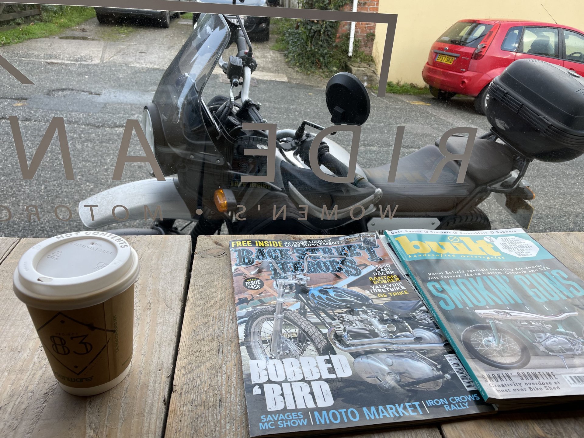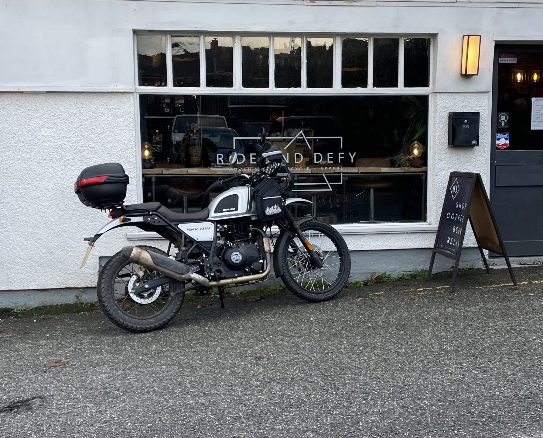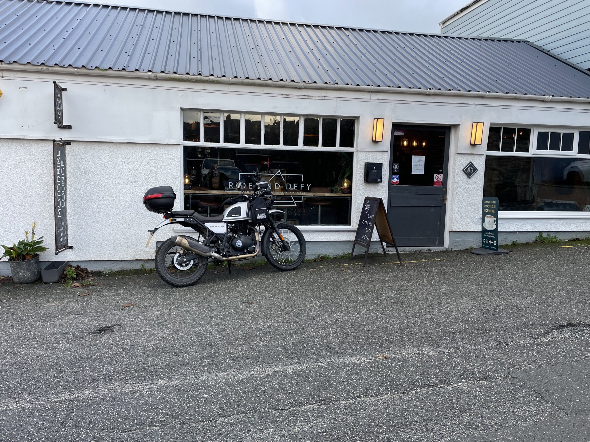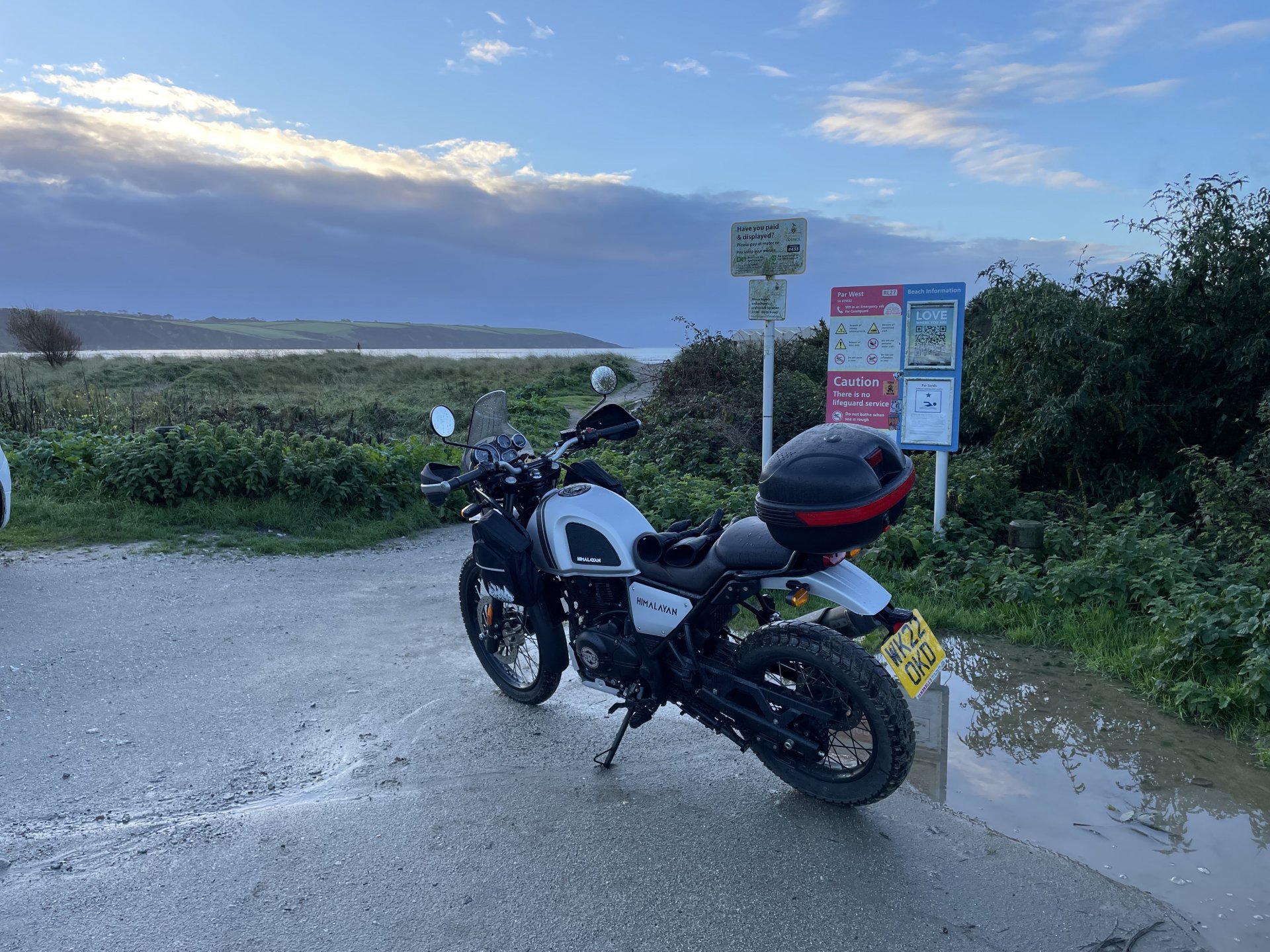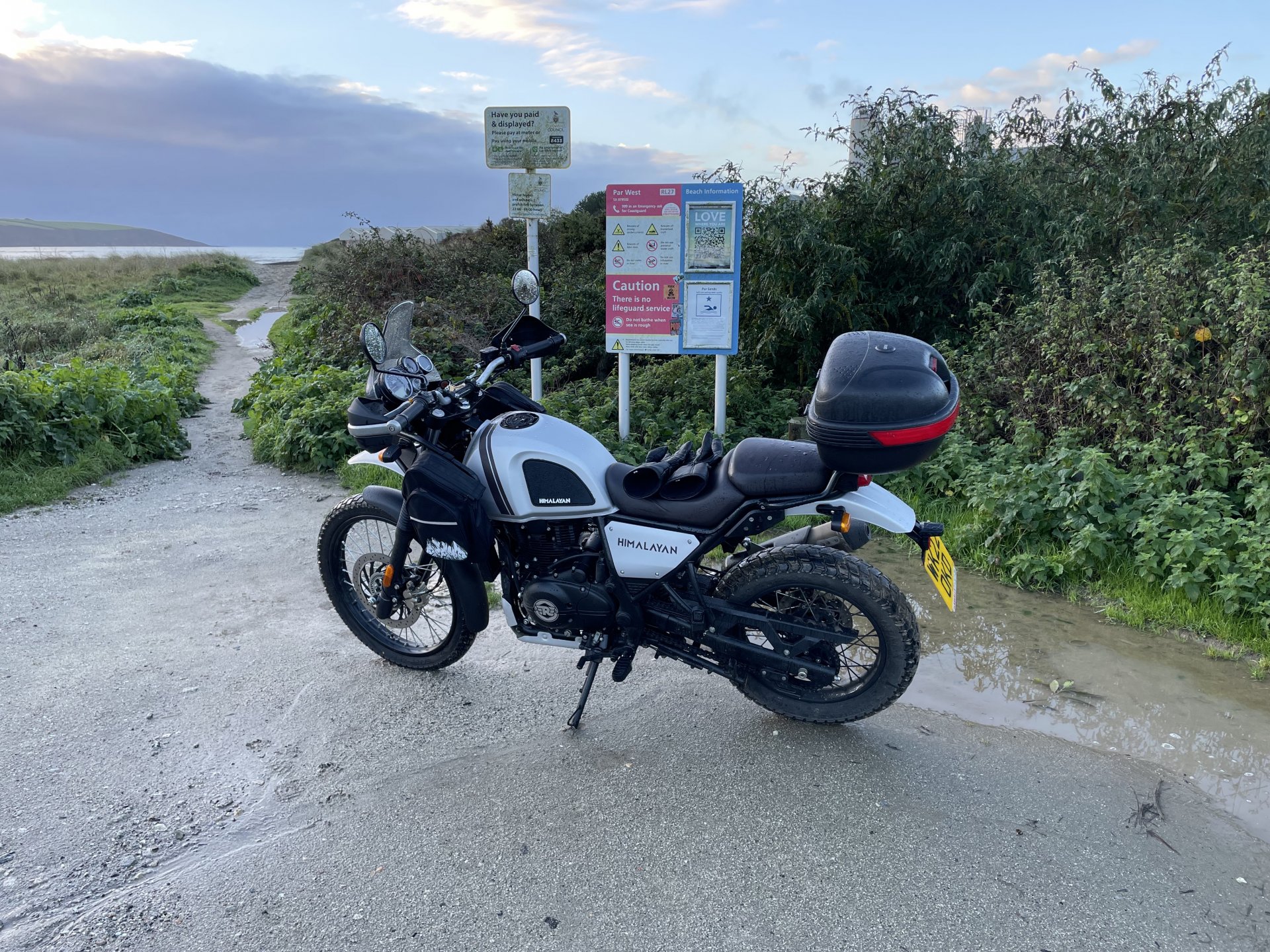 Day off today and I saw there was a break in the weather this morning so I thought a bimble on the Himalayan was on the cards. I dropped into Parbados on the way to get a photo on the beach as Xtreme suggested then carried on over to the North Coast, as my inspiration for the ride was to copy a Freddie Dobbs video on Youtube and visit Project 83. Locally it is sometimes a bit difficult to choose a destination for a quick ride. Anyway I got to Newquay and it is still as charmless as it has ever been. Sorry if you are a resident but I have never liked the place, to much arcade, public vomiting and cheap tat for my liking. Anyway enough of my old fart prejudice once I was in Newquay I fired up the Tripper nav thing on the Himalayan to find Wesley Yard, and Project 83. After two trips around the one way system I managed to actually follow the directions to Project 83, I will confess that it was user error and not the fault of the Tripper that took me around Newquay twice. Project 83, if you haven't seen the Freddie Dobbs video is a sort of posh boutique type of Biker Cafe and riding gear shop. Very nice place to be fair but quite spendy, the first pair of gloves I looked at were £239. What they had for sale appeared to very good quality but my pocket is more comfortable in a charity shop. I had a coffee, which was only £2.50 and lovely, read a magazine which funnily enough had a RE Interceptor in it that had been converted into a 650 Himalayan by Cooperbs motorcycles. I would like that if I had the cash. Then headed home. I must say that I liked Project 83 and if you are ever near Newquay, Cornwall it is worth a diversion to visit the place. I asked the owner about Freddie and said it wasn't planned and he just turned up, but the visit and Youtube video had been very good for his business. I hope he continues to do well as it is a classy welcoming place and a great destination for a ride out. 50 miles done and home before the rain.