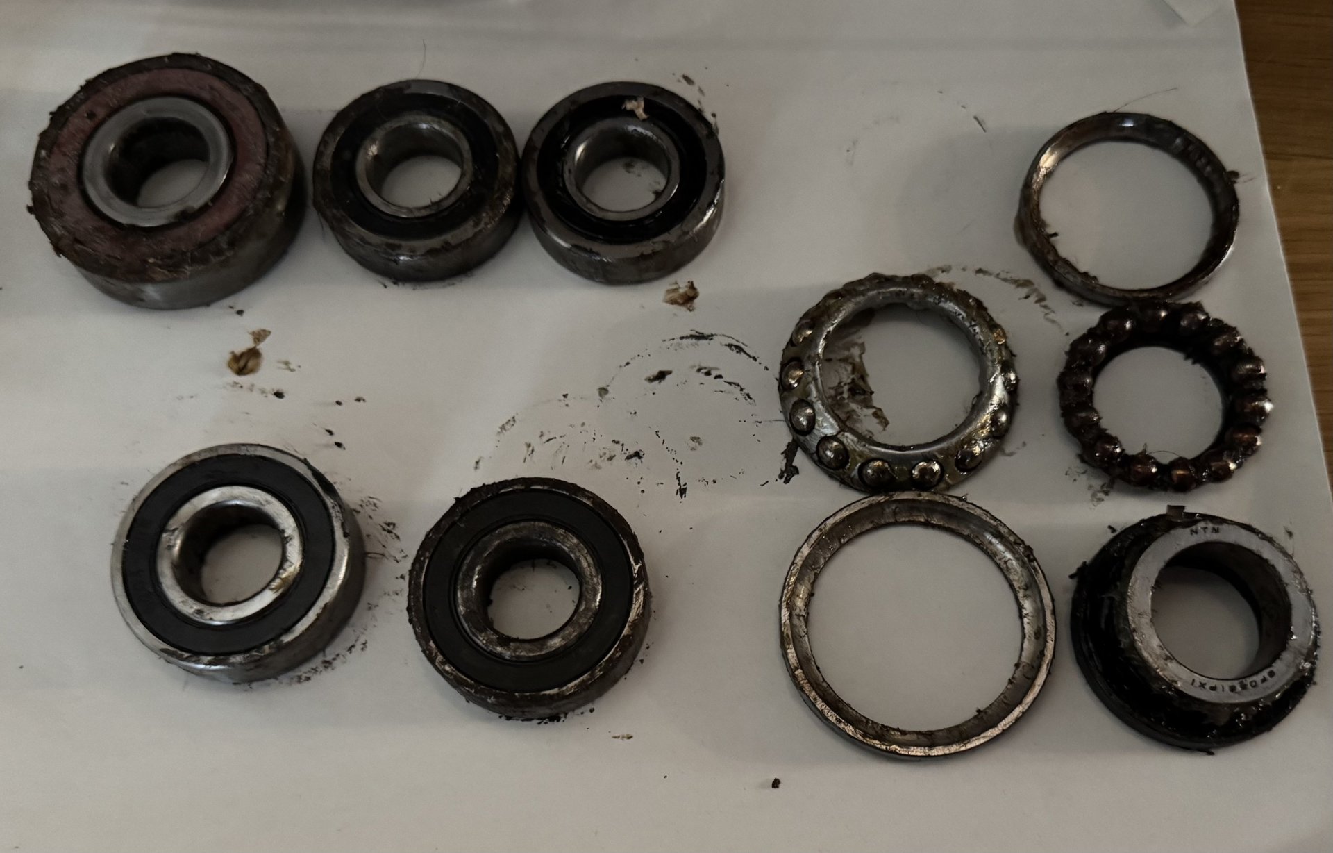 Got the bike back yesterday with all the new bearings fitted. Bike feels much better/quieter and steers well. Funny thing was I hadn't realised how much the steering was affected by the bad bearings. Because there wasn't any notch when riding I just didn't notice it deteriorating over time, but there was a noticeable notch when I put the bike on the main stand and moved the front wheel side to side. It feels much better now though and that may also be going from ball race to tapered bearings as well as the old bearings on their way out. Also had a good look at the old bearings, one of the fronts was noisey and two of the three backs were stiff to turn. So it was due time to change the lot. -