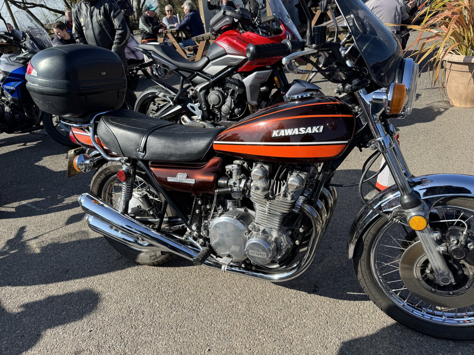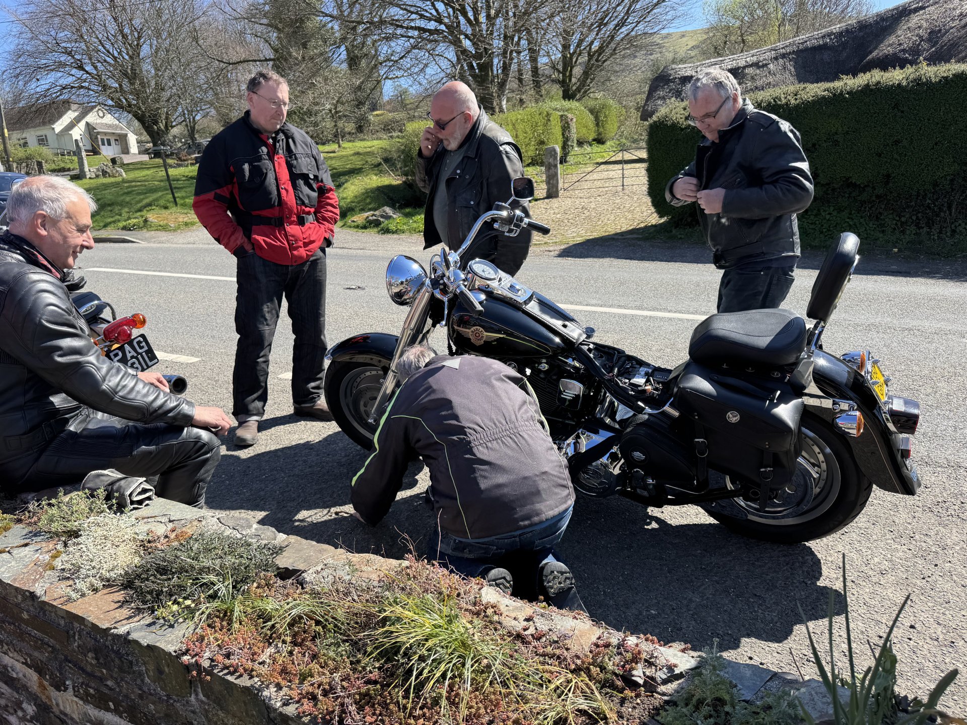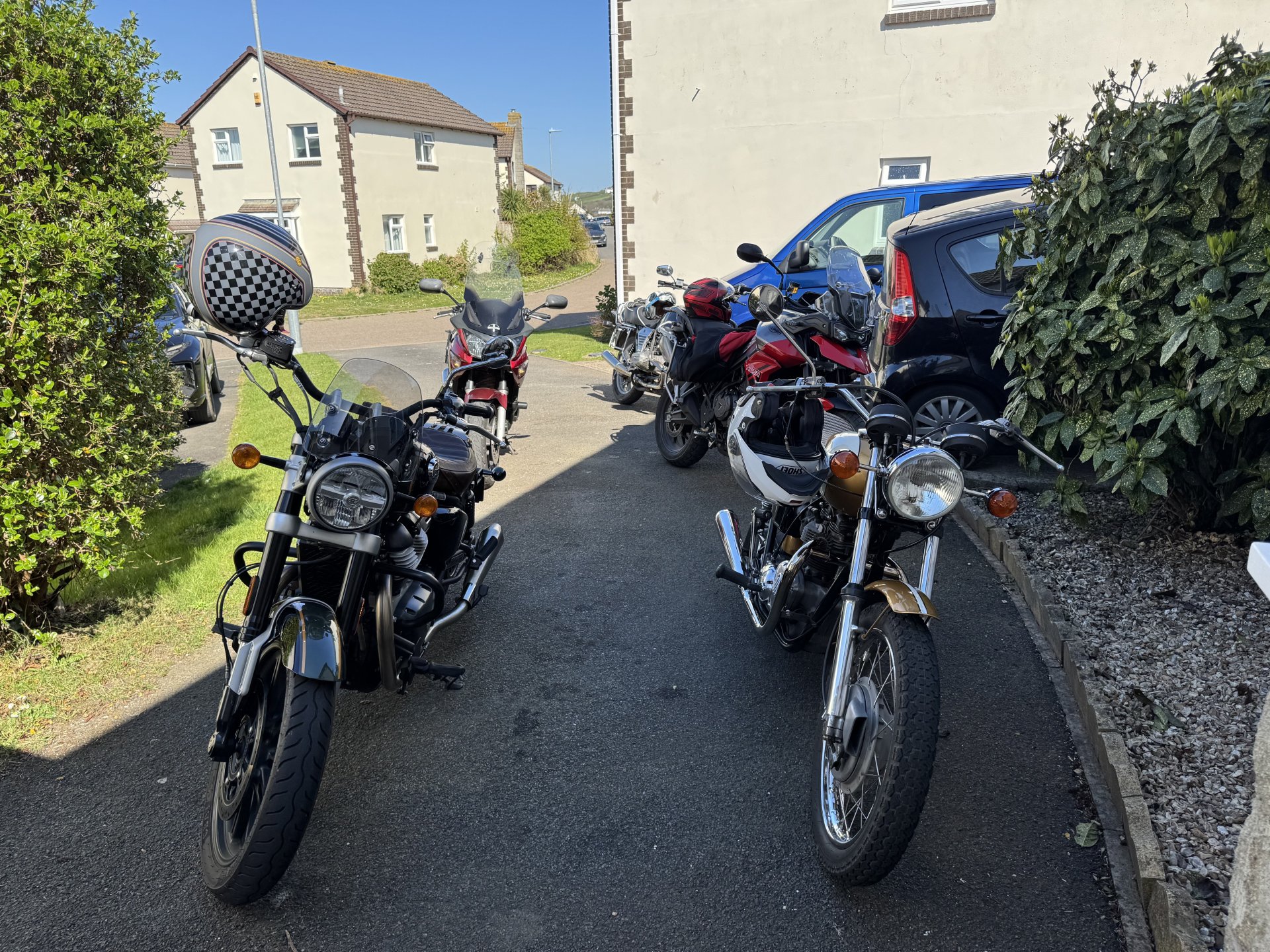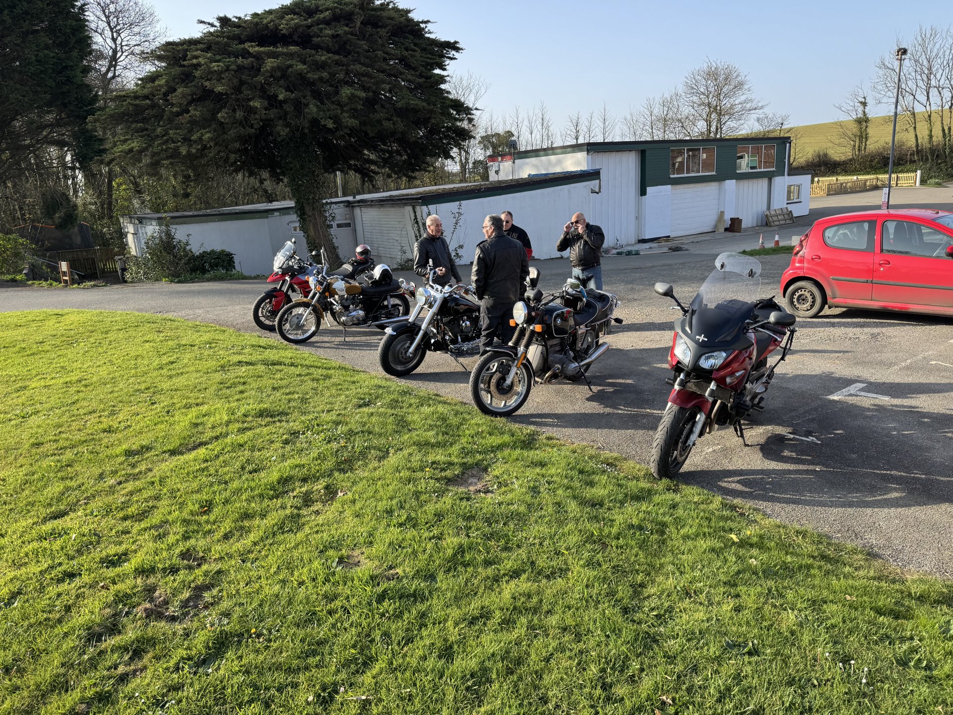 It was Kitt Hill bike meet this morning so we Fowey geriatrics met at 9:00am and set off. Five in the photo but one more arrived and we picked up one on route. Me Honda CBF600 Andy BMW R80 Martyn BMW R100 Gary Triumph Bonnie 650 Paul Triumph Tiger 850 Mike HD Fat BoB? Summin like that anyway and we picked Steve with his RE Super Meteor on route. One route we saw loads of bikes all going our way. Suppose the weather and time of year meant it was bound to be busy. When we got to Louis I was shocked we are normally in the first 10 to 15 bikes there. Must have been a good 100 there already today. Anyway breakfast ordered and eat then had a look at the many bikes. I didn’t try to photo many but there was loads of everything thing from vintage to brand new. Anyway after an hour Andy had to go so the 6 of us set off to got to Kev’s place for a cup of tea, I thought Kev lived in Plymouth but it turns out he had moved to Bideford the opposite coast from where we were. No problem as the roads were glorious and pretty quiet. We travelled out through Tavistock then on across Dartmoor to join the A386. Again lovely quiet roads in stunning sunshine. Doesn’t get much better than this. Anyway we got to The Highwayman at Sourton. (Yes that one Six30). When Mikes Harley died. The engineer and electrician decided, after some fettling, that the bike wasn’t charging and the battery was dead. Anyway after an hour messing we gave up and Mike called the RAC to rescue him. So we carried on to Kev’s place again on through some glorious roads through Torrington and then Bideford. All good. Tea drunk, some chat and we then headed down the A39 to Bude for fuel. Then to Camelford, Bodmin and home to Fowey. Steve left us at Camelford, A stunning day out day out with some entertaining mates, Shame the Harley didn’t make it, I felt for Mike as he was gutted his shiny pride and joy let him down. Covered 157 miles, @60mpg, one thing about having the vintage boat anchors with us you do save fuel.