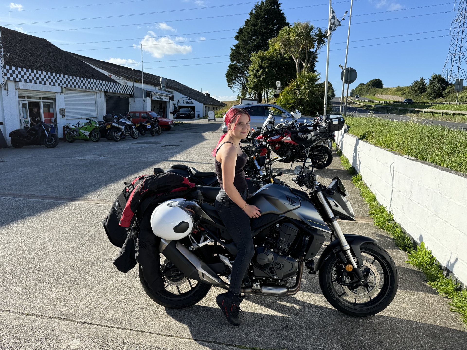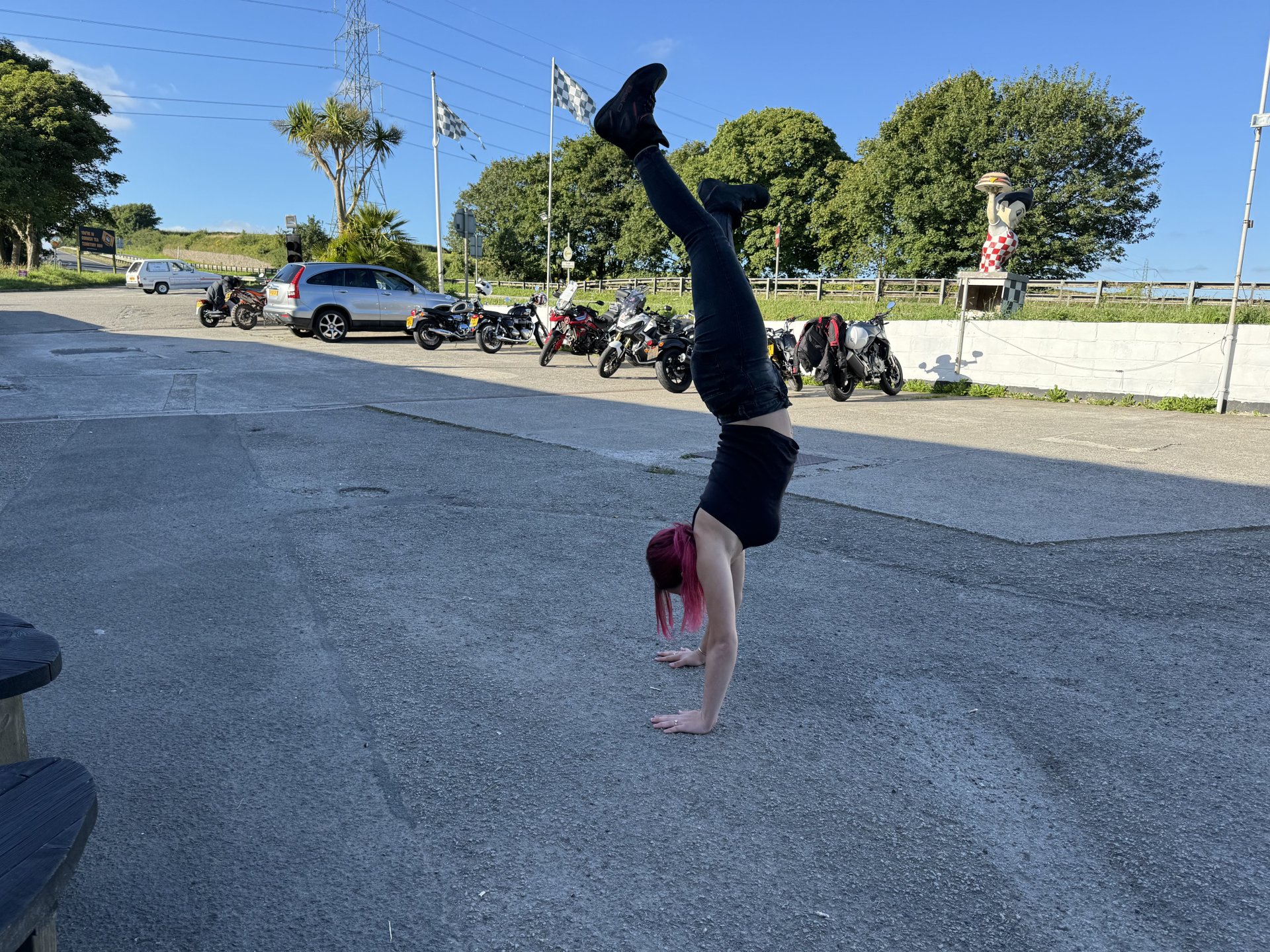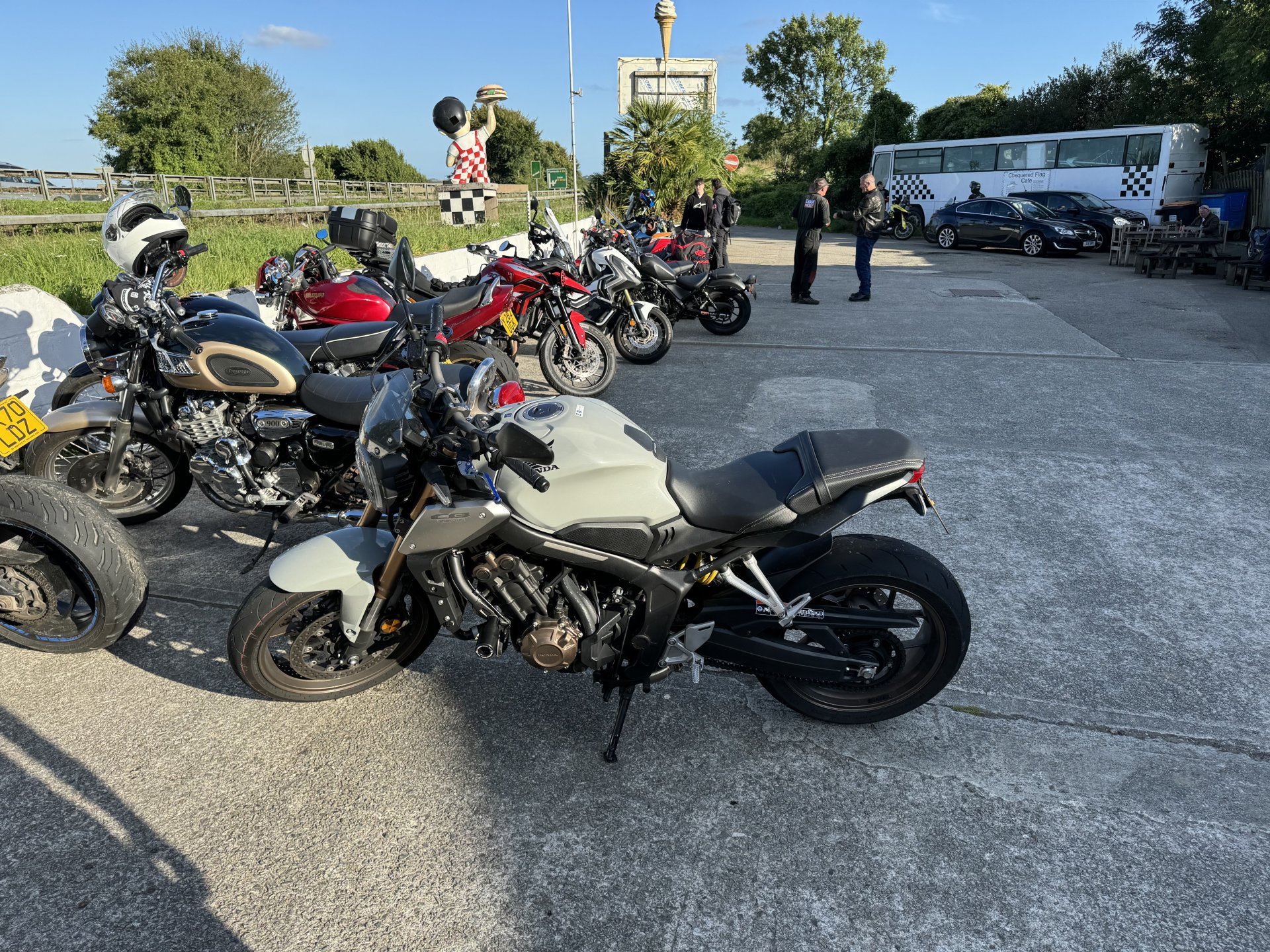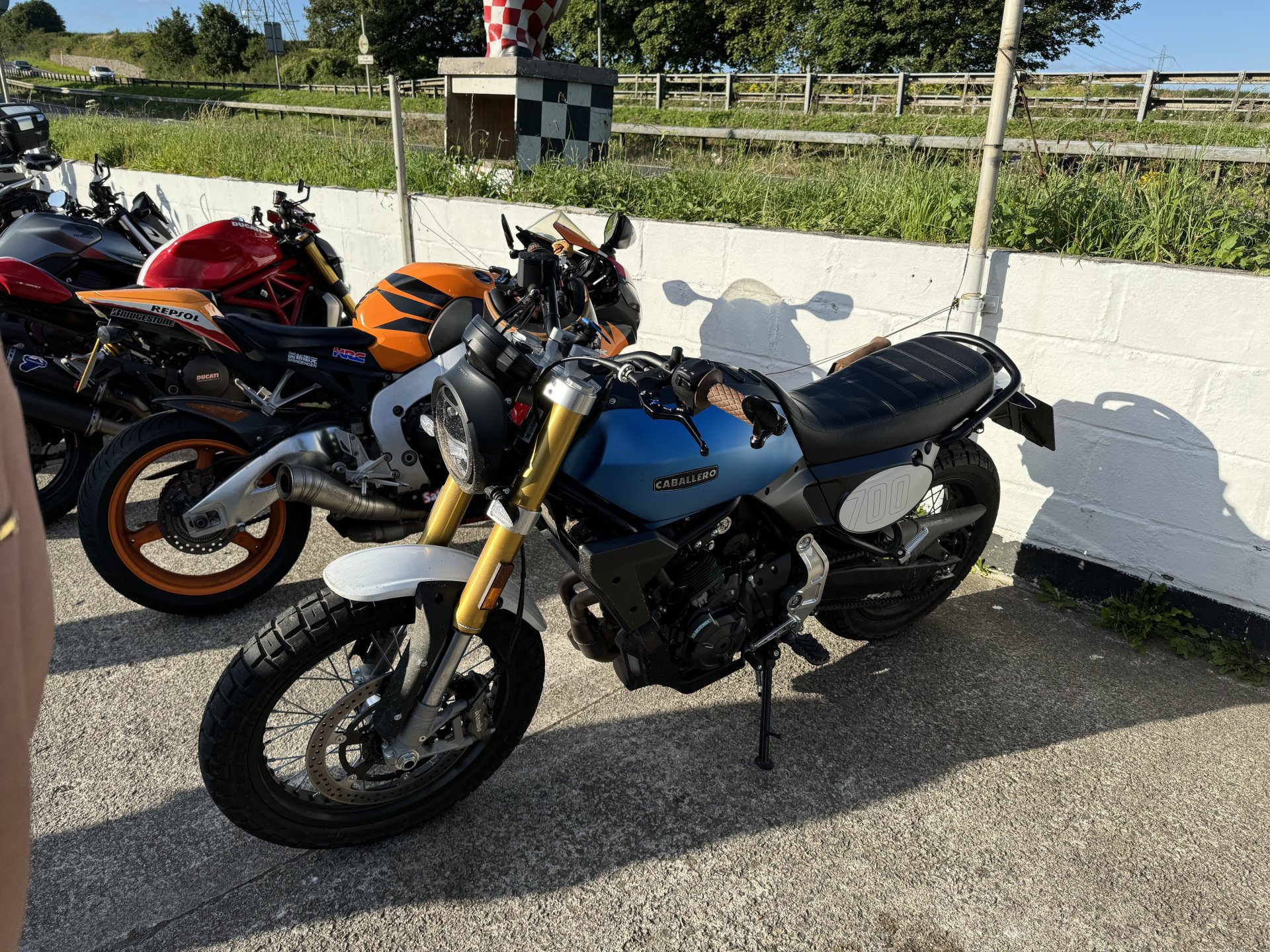 Popped up to Liskeard for chequered flag bike night. Only stayed long enough for a coffee and a quick. Chat only about 15 bikes when we were there but more were pulling in as we left. Couple of Vicars turned up with big white crucifixes on their backs. Load of women from Plymouth behaving like arseholes all drama and fuss. Few normal guys but don’t know if I will bother again. Of course no show without punch performing Nice Panzer, I like that, especially that it is single seated Cool blade, but had to explain to Shadow it was a Honda not a Repsol. Fantic 700 Vicars ADV750 scoot CBR 650, I could see one of those in Shadow’s future I didn’t mind the red VFR. The hands are Shadows, she was sticking with me and dancing, her ADHD was kicking in because of the noise. When the biker chicks turned up with their pantomime I took Shadow home as their carry on spiked her anxiety and she got really stressed. Not used to adults behaving like that.