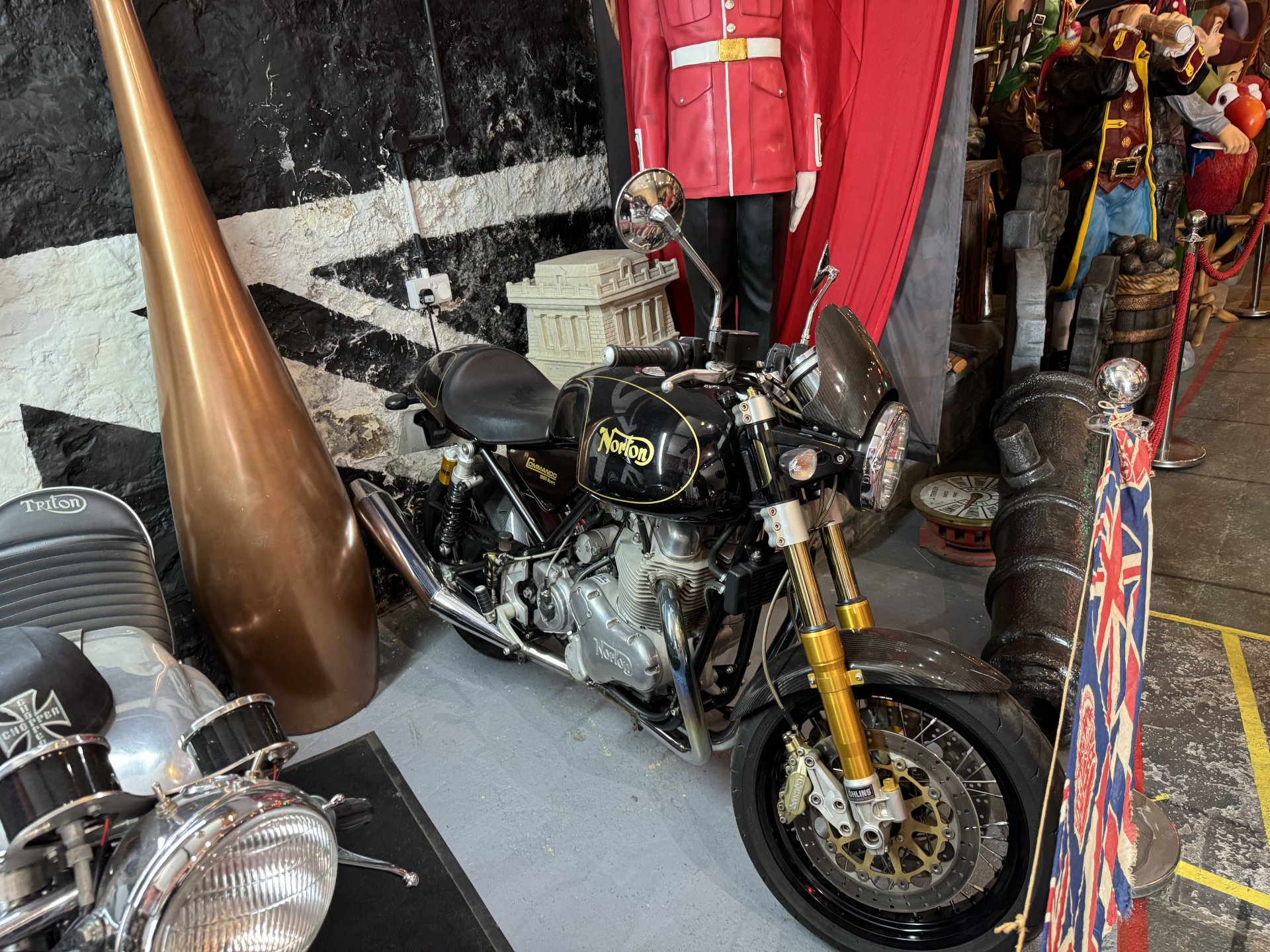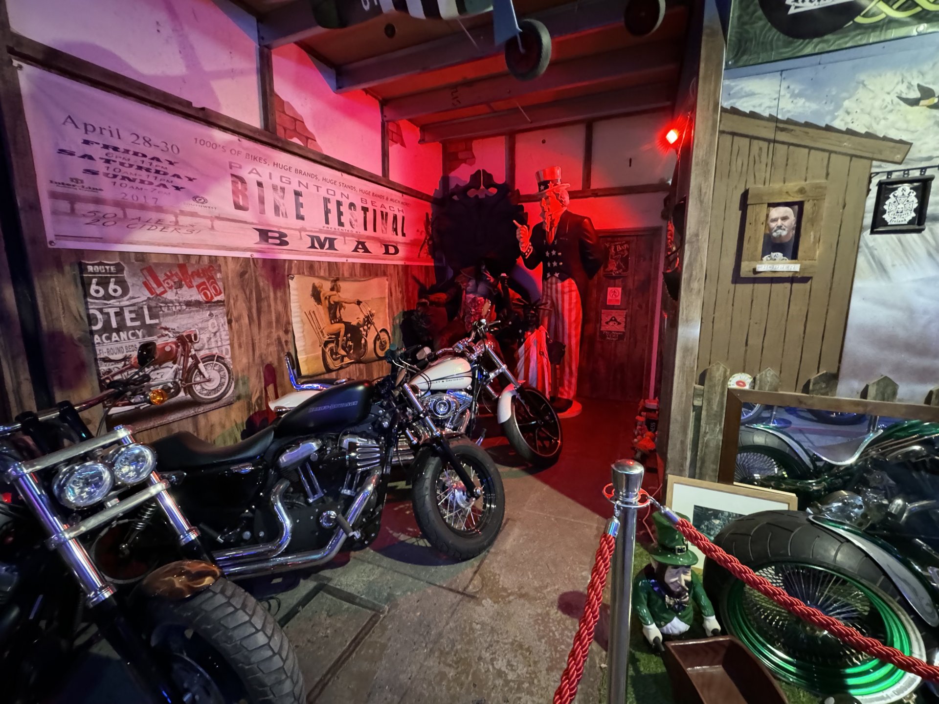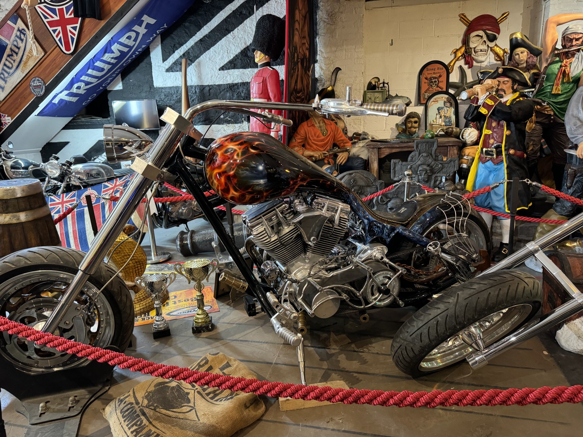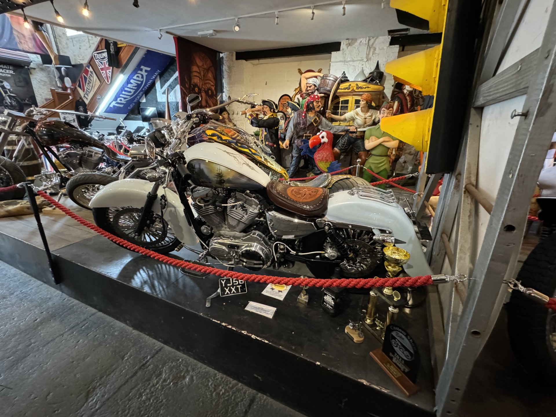 I wanted to head off early to go to Jollys Bike Shop in Bovey Tracey this morning. But of course life is never that easy. By the time I walked the dog took number one daughter to the stables and got Shadow out of her pit we didn’t get away until 11:00. Nothing much on the way out over to Bodmin to pick up the A30 to Sourton. Cruised at 80 mph most of the way apart from a couple of jams for breakdowns, but we filtered and never actually had to stop. I am surprised how accommodating all the drivers were making room for us to filter through. Unexpected. Anyway once we got to Sourton it was time for fuel. Of course by the time I had paid she had taken residence moaning how much more comfortable my seat was. Anyway with a full tank and 25 miles to go I used Google maps for voice directions through my headset. Now let me tell you now Google was not on form today, what should have been 25 miles turned into 30 with a couple of farm tracks with foot high grass in the middle thrown in. In fact at one point it looked really dodgy. Anyway eventually we made it to Jolly’s. We had lunch there and it was lovely and actually pretty reasonable. £12 to feed both of us. I think Jolly’s main business is as a prop shop, but they have a stunning collection of bikes to. Even got a Gandalf. And a spooky ghost encounter which freaked Shadow out Much darker than the photo and she actually wanted to hold my hand, first time in years Some bikes Stunning custom’s, real quality workmanship if a bit gay according to Shadow Yet more Harleys. A Honda After we did Jolly’s which we both really liked, I headed over Dartmoor which was absolutely stunning. Never fails to impress. Next stop was Princeton with its Prison. Still a stunning town despite the HMP. Big centre for walkers , some good pubs. Been there singing a few times. After Princeton on to Tavistock, Gunnislake, Callington, Liskeard, Lostwithiel and home. Trip stats, 6.5 hours and 145 miles We did stop on Dartmoor for an ice cream and I did laugh at Shadow. She went up to order her ice cream and lost the ability to speak to the rather handsome young man serving. I had to step in as she went to pieces Of course she denied it when I told her mother when we got home.