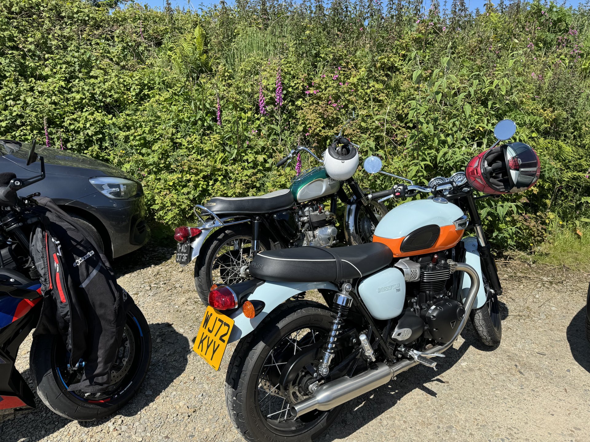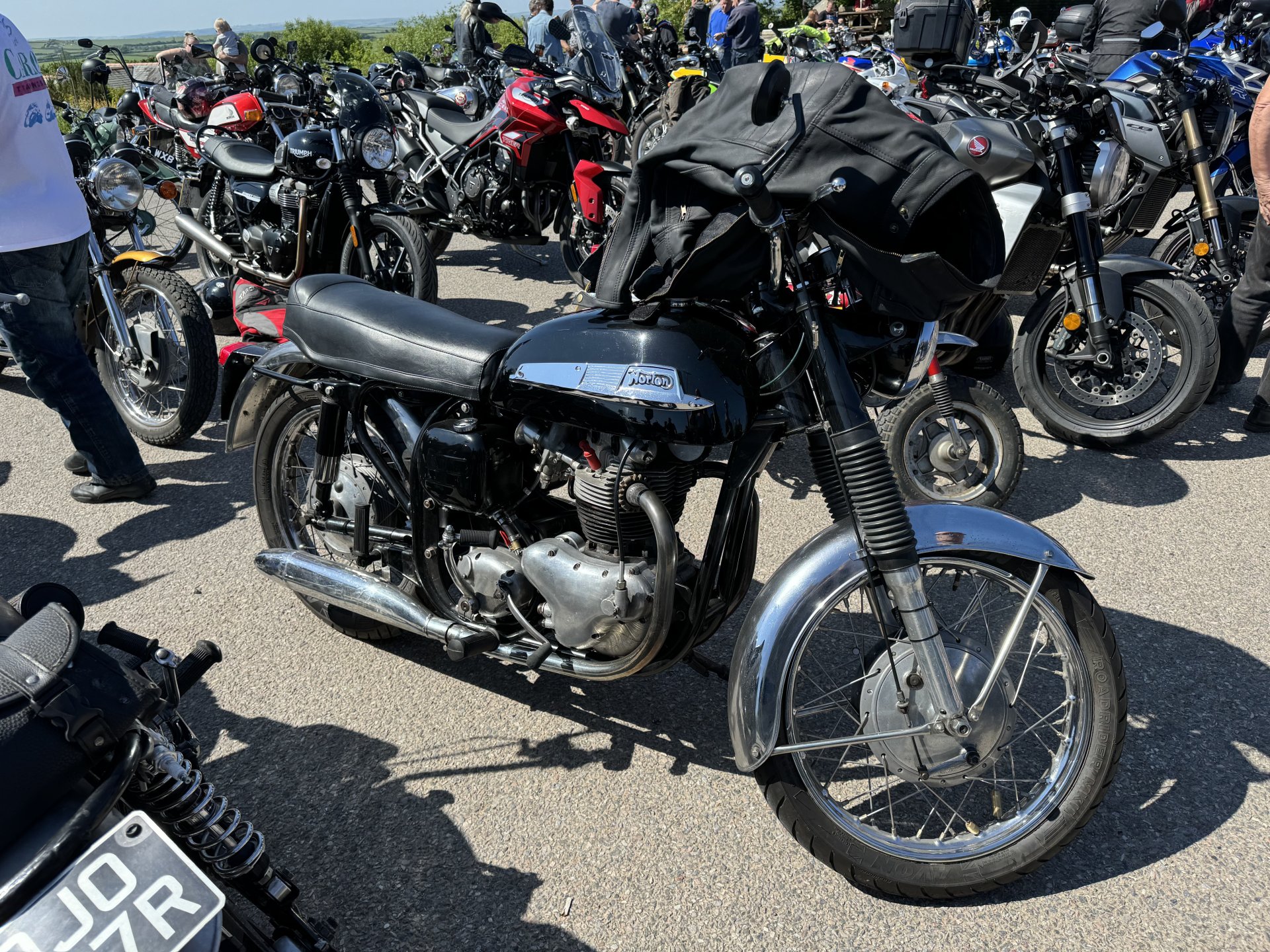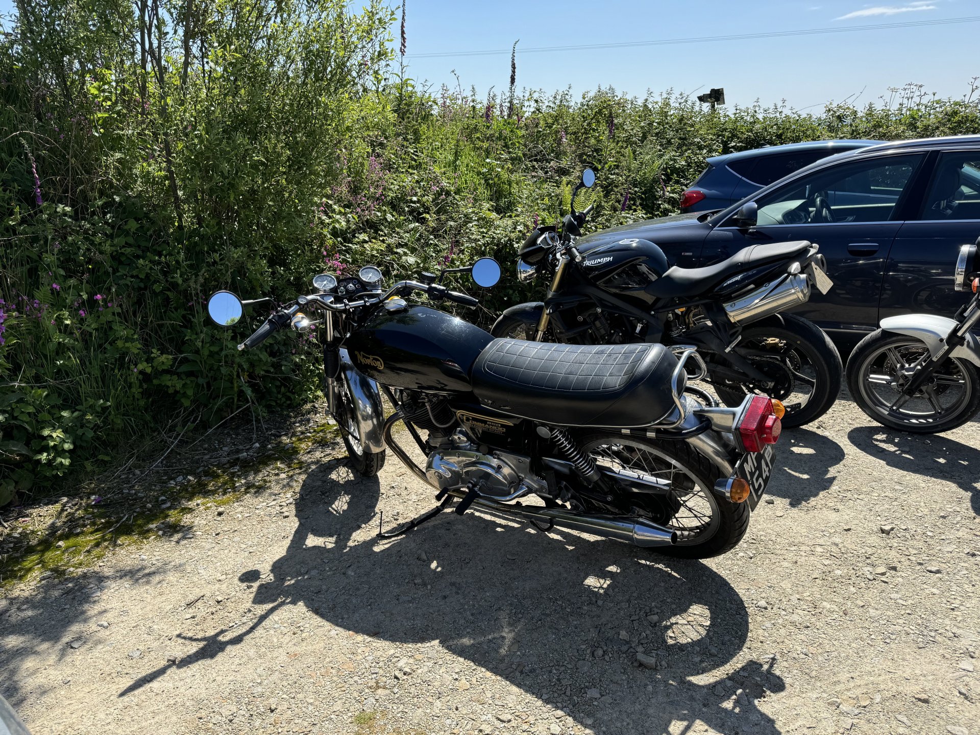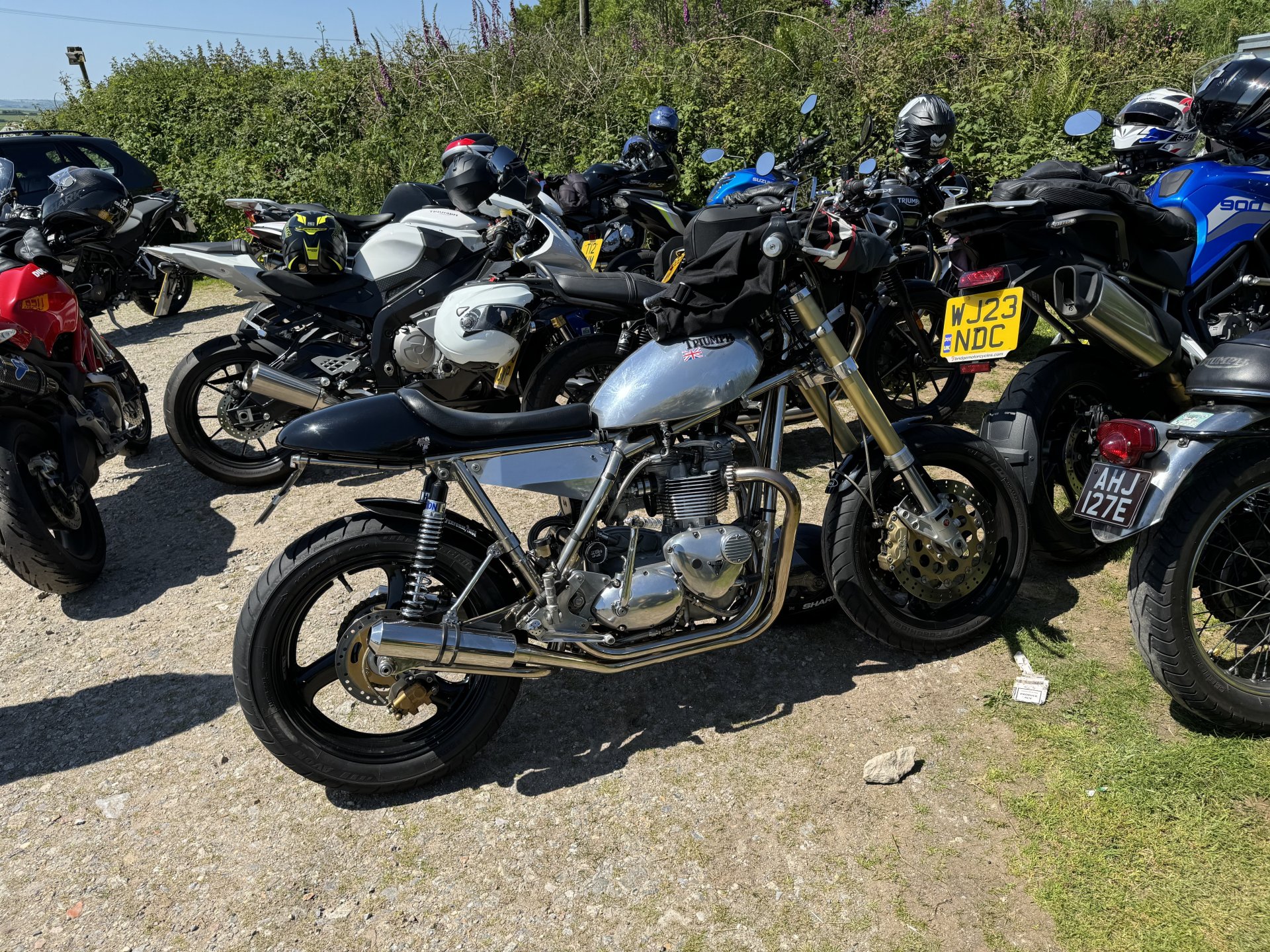 Been working overnight Friday and Saturday plus again tonight Sunday, not moaning but it does make getting out on the bike more difficult as I do have to sleep at some point. Anyway finished work at 8:00 am in Launceston getting it home, changed and my bike out and up at 4 Turnings garage for 9:00 am to meet up and go to Kit Hill this morning. Bit of a rush but made it. 6 of us today, me and Hornet, Steve and Super Meteor, Martyn and V85s, Gary one and 1974 Bonnie, Bob and 1975 Commando, Gary two and 1200 Sportster, Chris and 900 Triumph Scrambler. We made 3 miles and Bob’s Commando died, made another mile and it died again then again but started the fourth time. This time after an Italian tune up it ran fine for the rest of the trip up the Kit Hill. Don’t know about the trip back as I headed home before the rest to sleep at midday. Much as I think his Commando is the mutts nuts that there is why I haven’t got one. Fuck that. It’s around 30 miles to Kit Hill, it was a great run in beautiful weather. Loads of bikes out and about. Bimbletastic It seemed to be Commando and Brit bike in general day today. Some really nice stuff there, loads of UJMs, Harleys, Indians and even a couple of Himalayan’s. Not one chinky bike though Bob’s ‘Bastard Commando’ his term not mine The sound this made was awesome I know they aren’t a thing any more but I like the look of that Victory Overflow parking Triple Brick, I nearly bought one of those back in the day, in fact still have a hankering. I always thought they were small back in then but I suppose my perspective has changed Old a new Bonnie’s side by side, old Bonnie for looks for me. If it were my money it would be the newer bike don’t want the vibes Lovely old Honda Yes please Bantam D1, belongs to a friend’s brother.