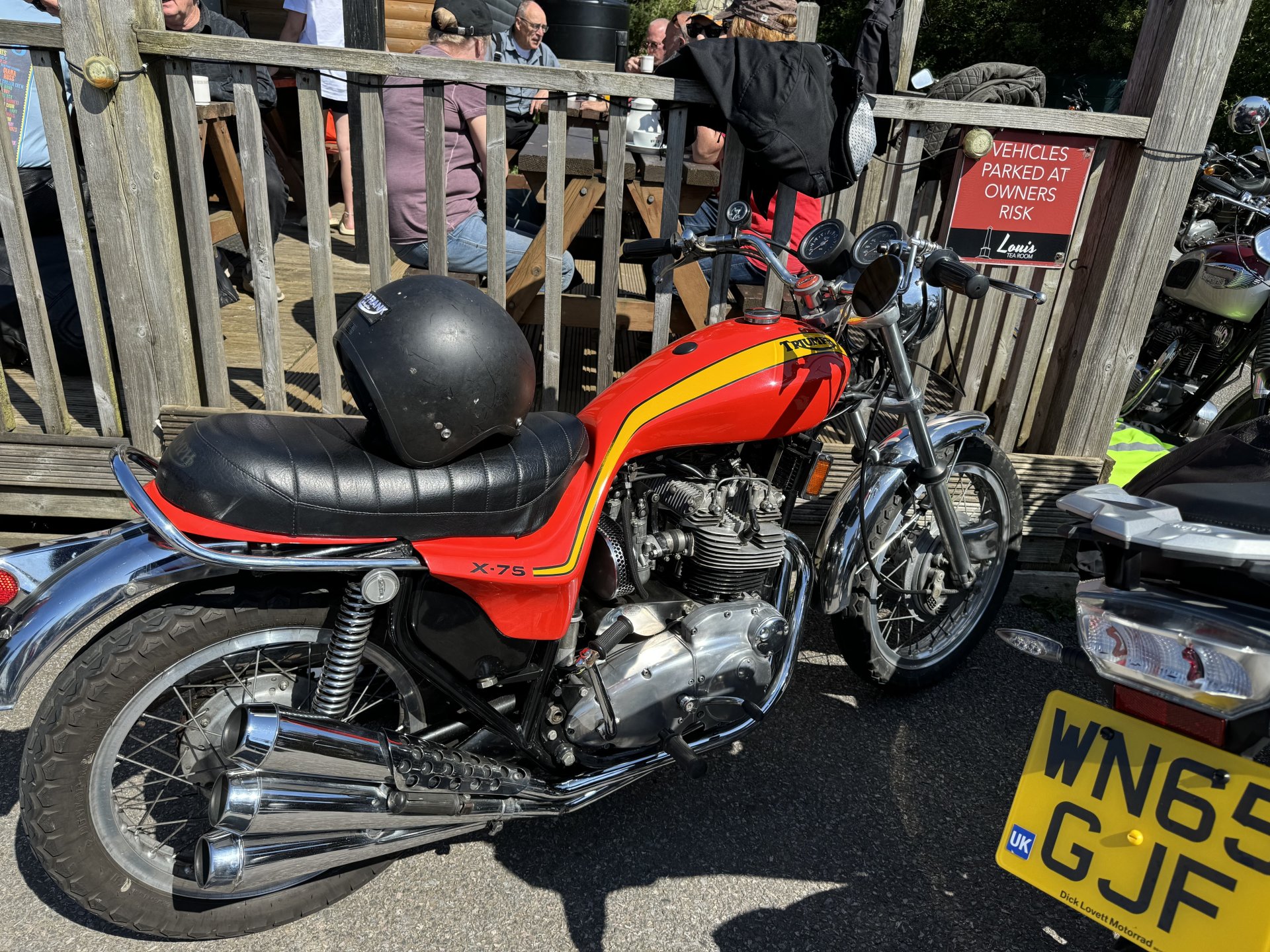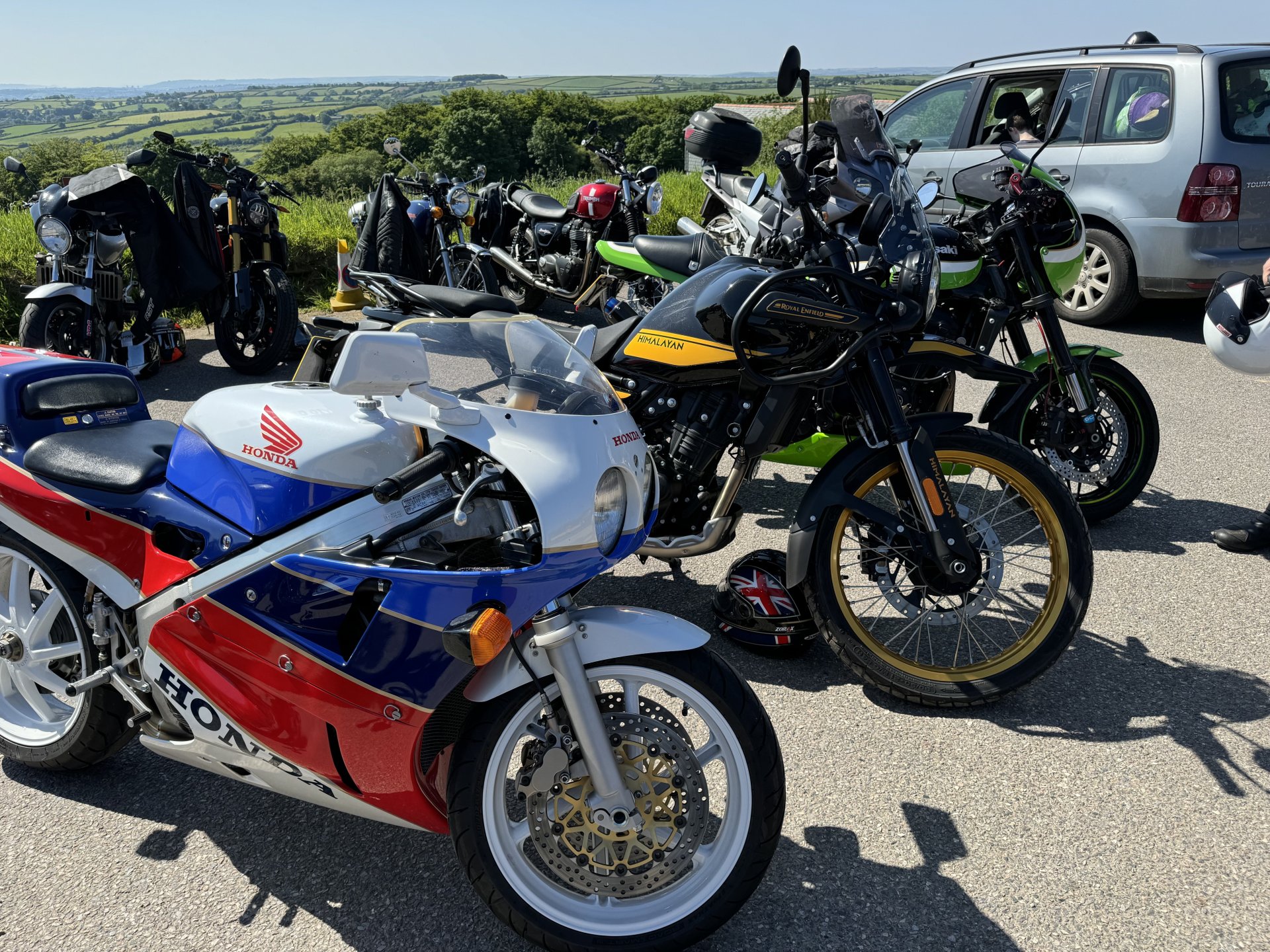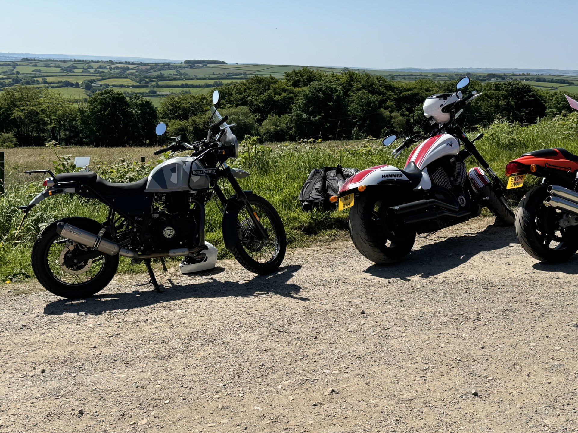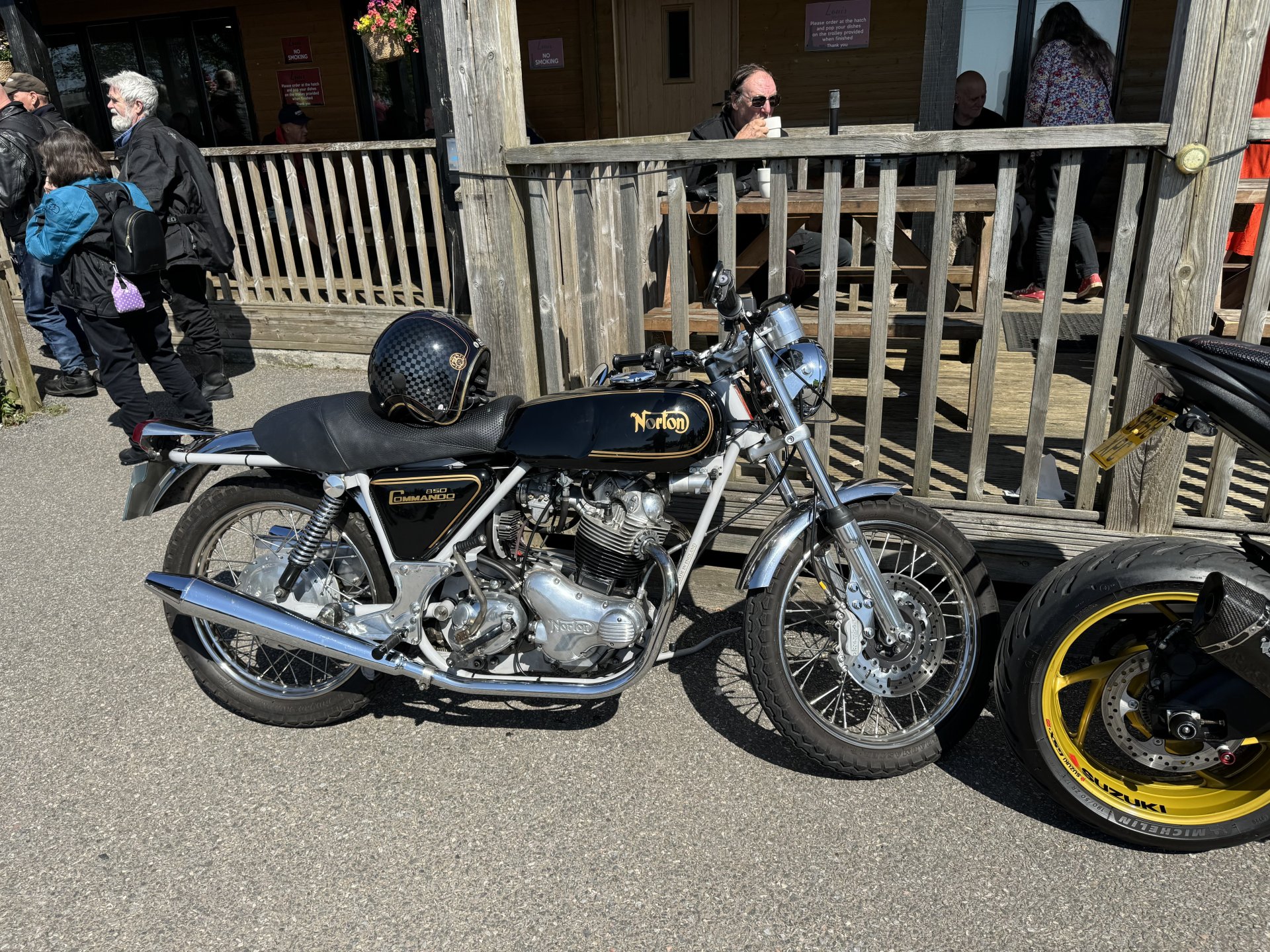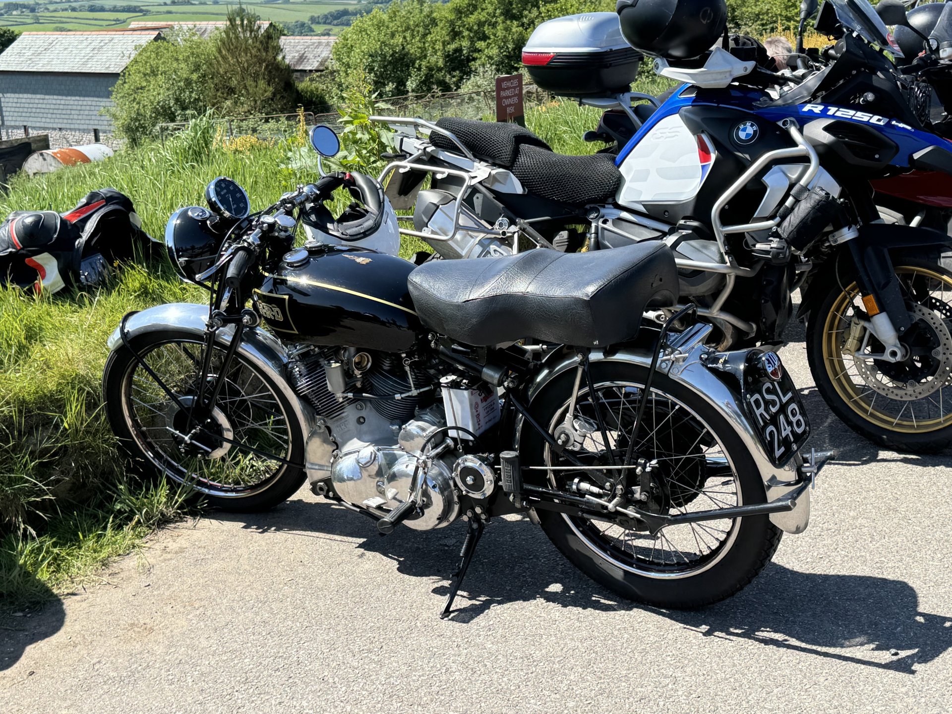 Been working overnight Friday and Saturday plus again tonight Sunday, not moaning but it does make getting out on the bike more difficult as I do have to sleep at some point. Anyway finished work at 8:00 am in Launceston getting it home, changed and my bike out and up at 4 Turnings garage for 9:00 am to meet up and go to Kit Hill this morning. Bit of a rush but made it. 6 of us today, me and Hornet, Steve and Super Meteor, Martyn and V85s, Gary one and 1974 Bonnie, Bob and 1975 Commando, Gary two and 1200 Sportster, Chris and 900 Triumph Scrambler. We made 3 miles and Bob’s Commando died, made another mile and it died again then again but started the fourth time. This time after an Italian tune up it ran fine for the rest of the trip up the Kit Hill. Don’t know about the trip back as I headed home before the rest to sleep at midday. Much as I think his Commando is the mutts nuts that there is why I haven’t got one. Fuck that. It’s around 30 miles to Kit Hill, it was a great run in beautiful weather. Loads of bikes out and about. Bimbletastic It seemed to be Commando and Brit bike in general day today. Some really nice stuff there, loads of UJMs, Harleys, Indians and even a couple of Himalayan’s. Not one chinky bike though Bob’s ‘Bastard Commando’ his term not mine The sound this made was awesome I know they aren’t a thing any more but I like the look of that Victory Overflow parking Triple Brick, I nearly bought one of those back in the day, in fact still have a hankering. I always thought they were small back in then but I suppose my perspective has changed Old a new Bonnie’s side by side, old Bonnie for looks for me. If it were my money it would be the newer bike don’t want the vibes Lovely old Honda Yes please Bantam D1, belongs to a friend’s brother.