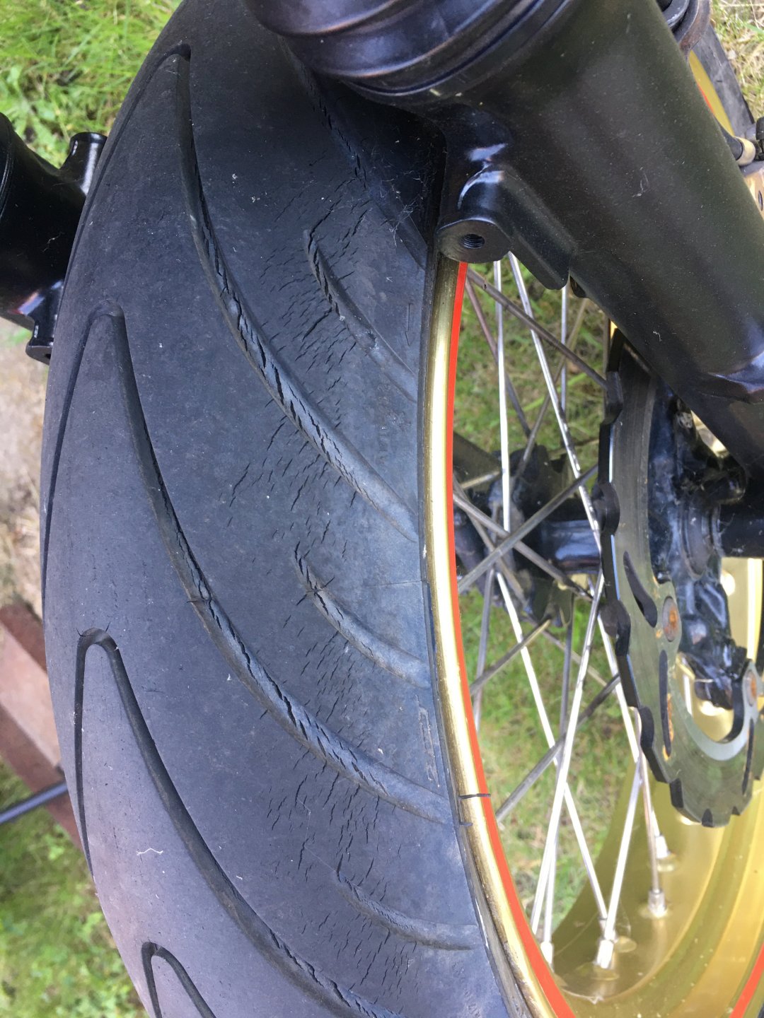 I have pilot road 2s on the dominator which have cracked up something rotten and now looking at replacing. This was the front which I've replaced with something else I found in the shed, rear is going the same way fast. Looking for something which will handle some easy off road lanes. Loved the TKCs I had on the xl600 but they may be to far off road for what I'm after and they're bloody expensive now. Avons seem to crack up quick so I've ruled any of them out. Both wheels are 17' by the way so very limited.