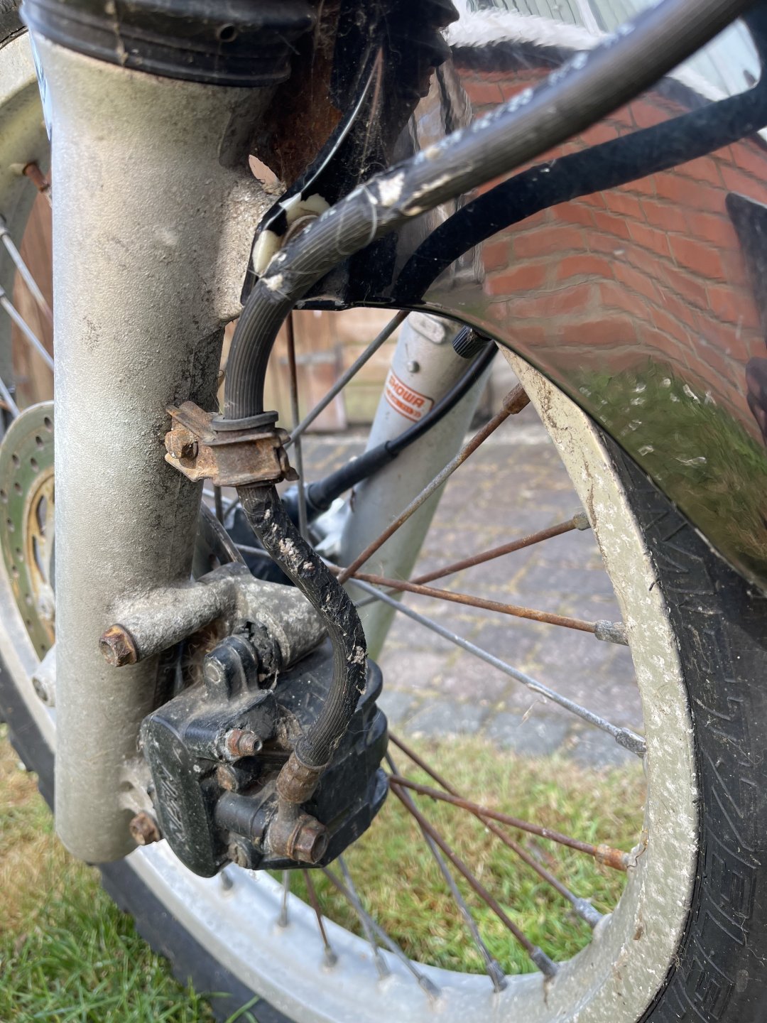 Decided to pull it from the side of the shed. A quick wash to get the leaves and spiders webs off and a quick look over. Rear brake lever's seized up along with a throttle that won't turn. It's a mess with rusty fittings and spokes and the bloody rabbits have been busy again.