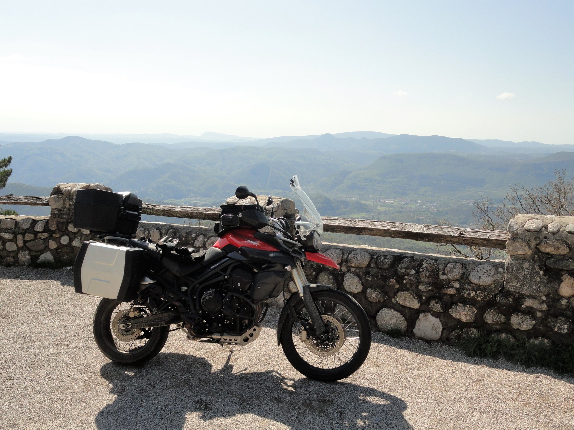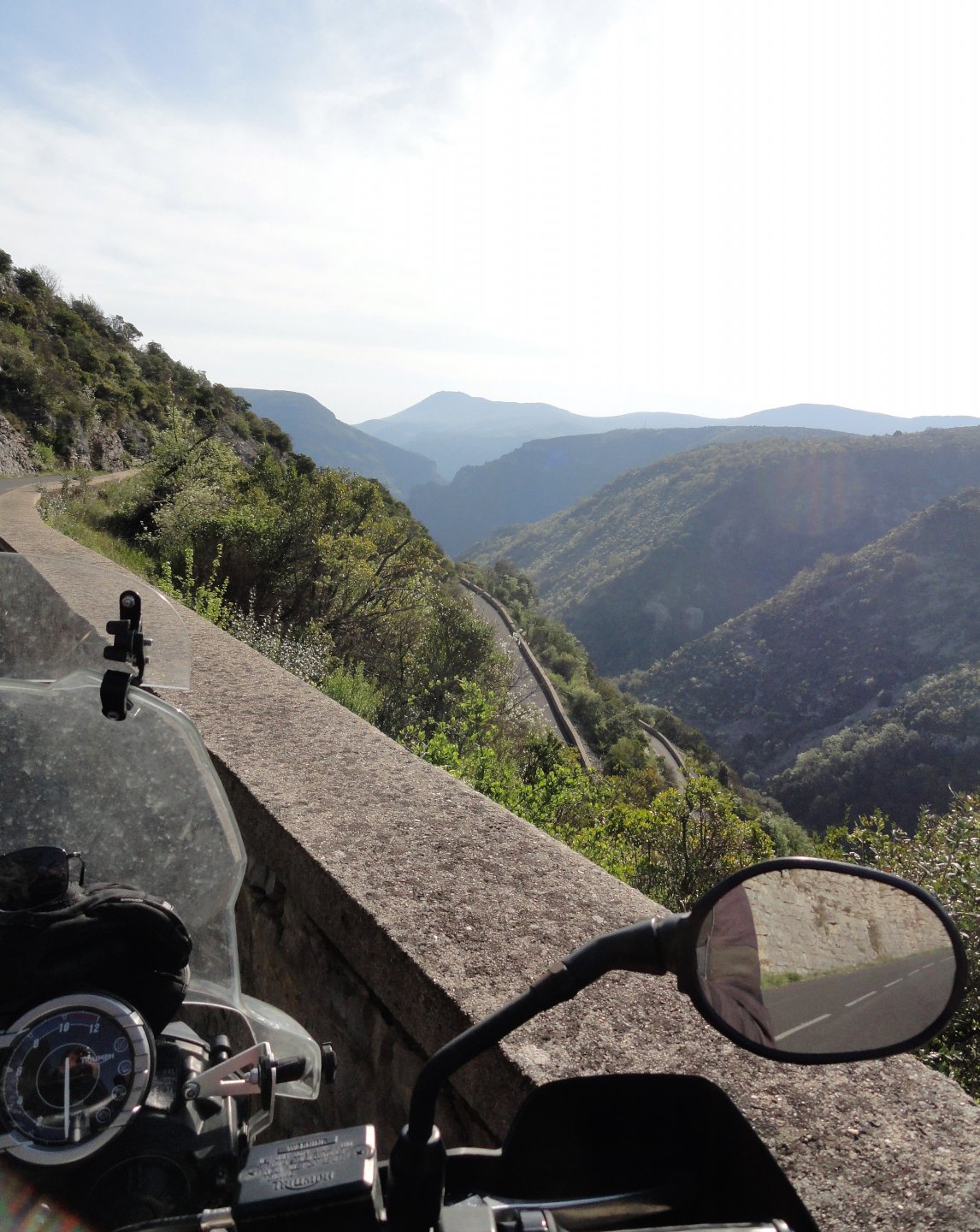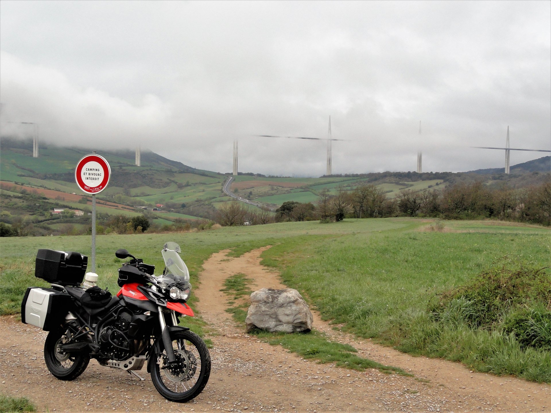 I think I had planned 1500km for this trip and door to door was 1508km according to the trip meter on the bike. it also showed 24h50 minutes riding time ( a little less in reality as I don't always switc the engine off when stopping for a pic or slapping the sat nav or whatever but call that "saddle time" and it'd be about right) fuel consomption was around 5,8L per 100 km. I left home on wednesday morning under clear skies and temps of around 8 to 10 deg c. The first stage was south to Clermont Ferrand on roads that I have ridden many times before. Crossing the Loire, westbound at Pouilly sur Loire I rode south on the left bank of the Loire for a while further before stopping for a coffee break. Budget restrictions being what they are ( and I'm something of a cheapskate at the best of times...) coffee from a flask was the order of the day and I just stopped at a convenient spot at the roadsiide by the river. Tigger in full touring Mode: despite the sunshine, I still had thermal liners in jacket and trousers at this point. I picked up the A75 southbound shortly after this at Monmarrault and as the weather rapidly deteriorated I hunkered down and concentrated on "making progress", switching from the "scenic" gps app to "Coyote" which warns of any speed cameras or dangers on the road as well as basic navigation. I really didn't need any avigational aids as I simply had to run south untill junction 37. This was a boring, if reasonable short interlude just concentrating on the road ahead and despite the rain keeping the speed needle around 140km/h ( the French Autoroutes are limited to 130 under normal circumstances, but in rain are limited to 110 and 140 on the tigers clocks gives a real speed of around 135, hence the usefulness of advance warning of any speed cameras, mobile or otherwise. ( it's not an infallible system, but for 50€ a year it only has to avoid 1 10 km/h exess speed fine to be viable. ) Once off the Autoroute, the road eastwards from Marvejols to Balsieges, before joining the Gorges du Tarn proper was superbe. The weather was still cold and damp, with 10/10ths cloud cover but only actually raing in brief showers. These showers are much easier to deal with wearing waterproof riding gear rather than having to stop and clamber in and out of rain gear every half hour. then the start of the Gorges du Tarn proper. riding down the Gorges was stunning, I can honestly say that I have never seen anything like it, there's certainly nothing on this scale in the Uk. Having the road to myself, mostly due to the bad weather was a bonus cos I imagine it would be heaving with bikes and camping cars during the summer. The main problem was actually staying on the road which winds seemingly endlessly downwards hanging onto the edge of the mountainside, on a balcony to go around a buttress, through a tunnel from time to time, squeezing through a gap between the cliff face and an outcrop, never straight or level or of equal width for more then a dozen yards and all this on a wet surface whilst gawking open mouthed at the incredible scenery. Wow! just... Wow. Once it was over and I was nearly at the bottom I realised I had taken no pics, just too gobsmaked by it all to function normally. It was about 18:30 when I rode into Millau from the west. I had provisionally booked a bed in a local "Gite d'Etape" ( bit like a youth Hostel) which, using my sleeping bag and sorting myself out food wise, would only cost me 15€ ( remember what I said about being tight fisted?) It was raining steadily now and when I stopped at a supermarket to grab a salad and sandwich for my supper, I phoned ahead to tell him I was about 15 minutes away. I mentioned I was just getting some food and he said " you can't eat here." I new that they weren't doing food cas I was the only guest, but I had previously said that I would grab a sarnie on the way in. He now decided that he wasn't happy with me eating a sandwich in my room either! Bearing in mind it was now pissing down I told him he could fuck off and hung up. ooopsss... Google to the rescue ( much as I hate to admit it the smartphoe is a very useful tool in this sort of situation, it took me about 3 minutes to find the nearest hotel mercure / Ibis ( 800m away) and book a room for the night with free undercover secure parking for the bikeand breakfast included for 80€ ( tight fisted up to a point...) I already had food for the evening and the welcome and service at the hotel were excelent and I mad good use of the facilities which were far superior than I would have found in a gite d'etape. The view from the hotel room window It was too late to go and look at the viaduct / suspenders bridge and as I had planned a short easy run the next morning I decided to leave it till then.