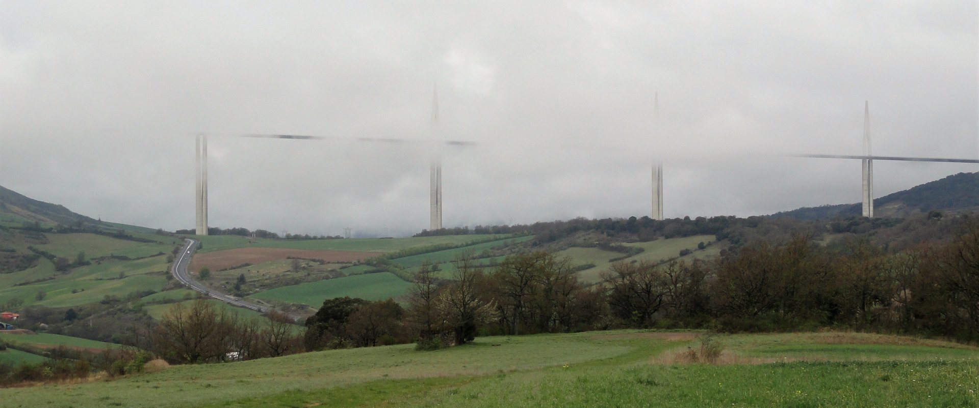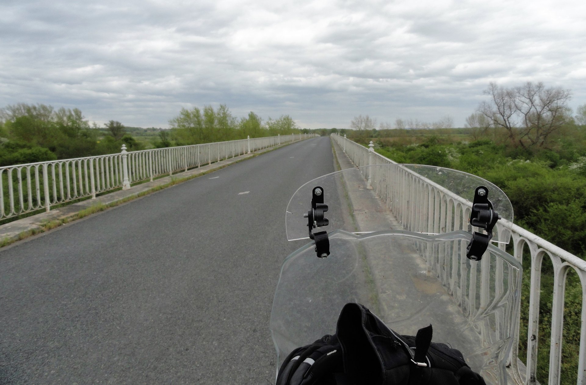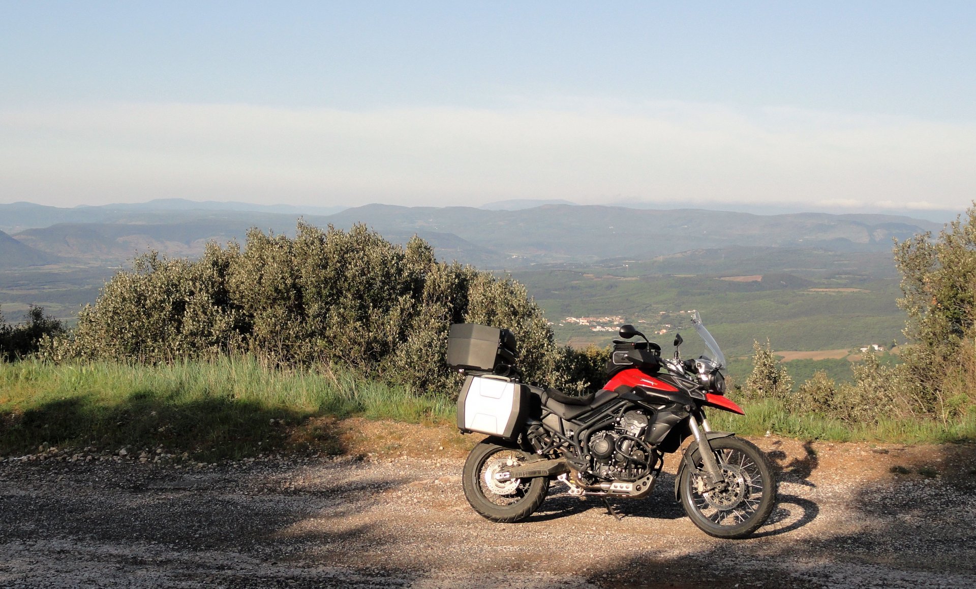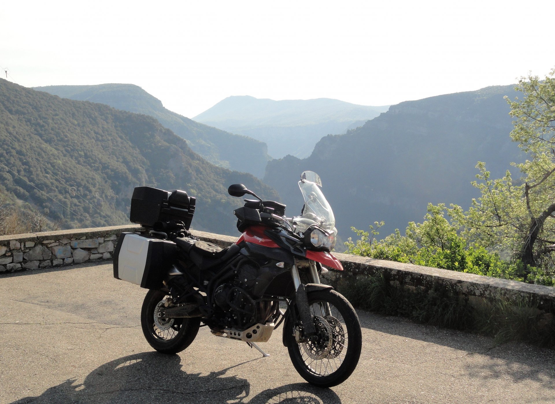 I think I had planned 1500km for this trip and door to door was 1508km according to the trip meter on the bike. it also showed 24h50 minutes riding time ( a little less in reality as I don't always switc the engine off when stopping for a pic or slapping the sat nav or whatever but call that "saddle time" and it'd be about right) fuel consomption was around 5,8L per 100 km. I left home on wednesday morning under clear skies and temps of around 8 to 10 deg c. The first stage was south to Clermont Ferrand on roads that I have ridden many times before. Crossing the Loire, westbound at Pouilly sur Loire I rode south on the left bank of the Loire for a while further before stopping for a coffee break. Budget restrictions being what they are ( and I'm something of a cheapskate at the best of times...) coffee from a flask was the order of the day and I just stopped at a convenient spot at the roadsiide by the river. Tigger in full touring Mode: despite the sunshine, I still had thermal liners in jacket and trousers at this point. I picked up the A75 southbound shortly after this at Monmarrault and as the weather rapidly deteriorated I hunkered down and concentrated on "making progress", switching from the "scenic" gps app to "Coyote" which warns of any speed cameras or dangers on the road as well as basic navigation. I really didn't need any avigational aids as I simply had to run south untill junction 37. This was a boring, if reasonable short interlude just concentrating on the road ahead and despite the rain keeping the speed needle around 140km/h ( the French Autoroutes are limited to 130 under normal circumstances, but in rain are limited to 110 and 140 on the tigers clocks gives a real speed of around 135, hence the usefulness of advance warning of any speed cameras, mobile or otherwise. ( it's not an infallible system, but for 50€ a year it only has to avoid 1 10 km/h exess speed fine to be viable. ) Once off the Autoroute, the road eastwards from Marvejols to Balsieges, before joining the Gorges du Tarn proper was superbe. The weather was still cold and damp, with 10/10ths cloud cover but only actually raing in brief showers. These showers are much easier to deal with wearing waterproof riding gear rather than having to stop and clamber in and out of rain gear every half hour. then the start of the Gorges du Tarn proper. riding down the Gorges was stunning, I can honestly say that I have never seen anything like it, there's certainly nothing on this scale in the Uk. Having the road to myself, mostly due to the bad weather was a bonus cos I imagine it would be heaving with bikes and camping cars during the summer. The main problem was actually staying on the road which winds seemingly endlessly downwards hanging onto the edge of the mountainside, on a balcony to go around a buttress, through a tunnel from time to time, squeezing through a gap between the cliff face and an outcrop, never straight or level or of equal width for more then a dozen yards and all this on a wet surface whilst gawking open mouthed at the incredible scenery. Wow! just... Wow. Once it was over and I was nearly at the bottom I realised I had taken no pics, just too gobsmaked by it all to function normally. It was about 18:30 when I rode into Millau from the west. I had provisionally booked a bed in a local "Gite d'Etape" ( bit like a youth Hostel) which, using my sleeping bag and sorting myself out food wise, would only cost me 15€ ( remember what I said about being tight fisted?) It was raining steadily now and when I stopped at a supermarket to grab a salad and sandwich for my supper, I phoned ahead to tell him I was about 15 minutes away. I mentioned I was just getting some food and he said " you can't eat here." I new that they weren't doing food cas I was the only guest, but I had previously said that I would grab a sarnie on the way in. He now decided that he wasn't happy with me eating a sandwich in my room either! Bearing in mind it was now pissing down I told him he could fuck off and hung up. ooopsss... Google to the rescue ( much as I hate to admit it the smartphoe is a very useful tool in this sort of situation, it took me about 3 minutes to find the nearest hotel mercure / Ibis ( 800m away) and book a room for the night with free undercover secure parking for the bikeand breakfast included for 80€ ( tight fisted up to a point...) I already had food for the evening and the welcome and service at the hotel were excelent and I mad good use of the facilities which were far superior than I would have found in a gite d'etape. The view from the hotel room window It was too late to go and look at the viaduct / suspenders bridge and as I had planned a short easy run the next morning I decided to leave it till then.