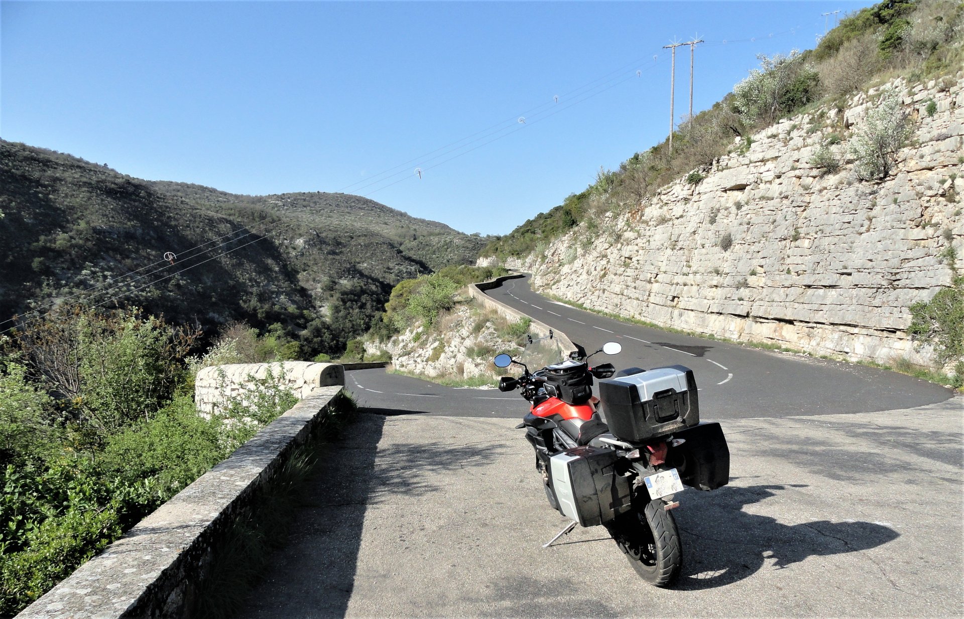 Day 2 With an easy mornings ride planned for today I had a bit of a lie in and wallowed in the luxury of a a hotel for a while, which then included numerous visits to the breakfast buffet where their strategy of supplying mini croissants and pain au chocolats in the hope that people just take one failed miserably. I also managed to sneak my flask in for a passage under the spout of their coffee machine... I looked up how to get to the viewing area for the famous Millau viaduct but the only answer seemed to be via the autoroute and the bridge tolls. Not happy about that ( tightwad!) i determined to get my paper map out and work a route where I could get close to the viewing area without paying. As I loaded the bike in the garage, the hotel handyman came out of his little workshop in the courtyard so I asked him. " of course," he replied, " you go up to Le Cavalerie, but you'll see nothing today..." The cloud base was effectively low in the valley, but I decided to try anyway. The road going on from that view point had a sign saying " narrow road. passing dificult. Use passing points." That sounded like fun, and as it went in the right direction I decide to give it a go. Steep and narrow it was, and at the top there were some lunatics preparing to leap off the hill top with a tent strapped to their backs ( parasailing I believe they call it) but in almost zero visibility!? Nutters I tell you! I mahaged to get one pic of the scenery through a break in the clouds but the rest of the mornings ride was done in miserable conditions, cold, wet and at an average of about 30km/h as the visibility was at times down to about 50 metres and these mountain roads don't have barriers... I eventually ended up in Capestang around half 12, having had an interesting jaunt off road when the road leading into Capestang had a big barrier across it saying " Road closed for maintenance" no other information and no deviation signs. I turned left and let the Scenic nav app re calculate the route. I had, unfortunately NOT ticked the box marked "avoid gravel or dirt roads" which wasn't a problem usually as I had the planned route prgrammed in but once off the planned route... nothing difficult or nast, just gravel and dirt for about 5 km whilst we boxed round the closed section, and then we arrived at the port in Capestang as the sun came out. This was my nights lodgings, and a handy restaurant right on site provided a Burger, chips and salad Lunch for 16€. The plan was to raid @Tango's larder and fridge for evening meal as he had, perhaps foolishly, suggested he feed me that evening. Unfortunately my oppo who runs the base here and who was not working today had left a message to say that he'd be coming in specially this evening so 's we could go for a meal. I couldn't decently refuse, so had to indecently turn down Tango's very kind offer of turkey curry. Once I'd fed and watered, i rang Tango to see where he was at but the phone number he'd given me didin't work... My immediate thought was " shit, somebody's warned him...". Well I had plenty f time so I left him a PM on here ( wonderful clever things these 'ere smart phones) and rode the 30 odd minutes into Narbonne where I'd stop and see if he'd replied, if not then I'd go see the sea. He had replied and still denies he gave me a duff number on purpose... I spent a pleasant couple of hours drinking his tea and grubbying his sofa with my roadstained person and I can safely say he's another person off this forum who's a thouroughly nice bloke and meeting him was a bonus to the trip. Thanks @Tango. I had to run out on him before his Mrs came home and was predictably late for meeting my colleague but hey, I'm supposed to be on holiday right? At least this way the company paid for a feed.