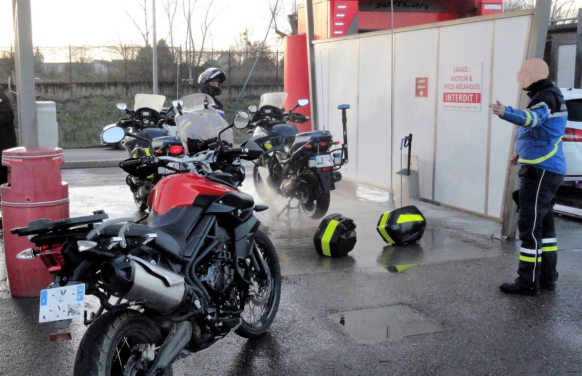 I don't have a garage Pete and the temperatures all week have been steadily below freezing, the car washes all shut down and there's no point washing it in the dark at home. The only reason thee was an empty spot is coz the car drivers are thick as pigshit and from the end of the queue you can4t see if there's someone in the end bay or not, I hapenned to notice that rotary arm of the pressure washer that you can see above the walls wasn't moving... the gendarmes came past that end before turning in so obviously saw it was empty. They are TDM's. 900's i believe but the back end is adapted specifically to accomodate the Gendarme's equipement ( radio antenna, lights, pole light, fire extinguisher etc.