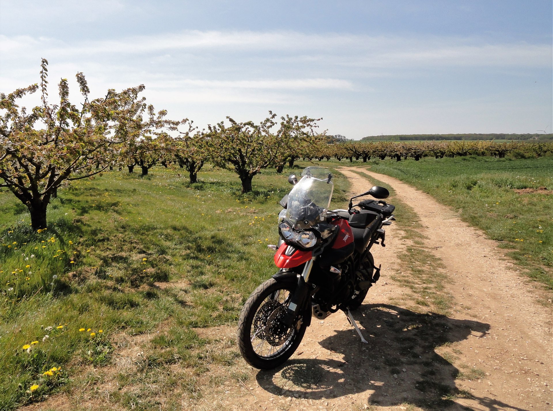 how to ride nearly 3 hours whilst remaining within 10km of home. something like this: nearly all pretty minor roads, which is what we like, and the dark brown bits on the trace are unpaved sections. Sun shining, spring in the air and 20 odd degrees forcast for the afternoon. I had to take N01 daughter back to uni in the afternoon so did this in the morning, set off about 10h30 up through St Bris le Vineux and on to St Cyr les Colons the village itself is "out of bounds" so cut north back under the autoroute, twice, and on to montallery and Bleigny le Carreaux. It had taken me a while to find a way out of Bleigny le Carreaux without crossing the 10km line, but a shot dirt track liason sorted the problem allowing me to cut back westwards through to Moneteau and cross the river there. There was no way to hug the northern edge of the circle without crossing out of it, so I had to work back south a little before heading towards the western sector. and some cherry orchards. soon be scrumping time... time ws getting on and I knew N01 would be getting her knickers in a twist if I didn't get back soon so from here, above Coulanges la Vineuse, I pushed on a bit down through Vinvelles, back across the river, up and down the hillclimb course at Chitry le Fort, back to St bris, cuting left up over the Col Du Cremant and back to the river at Vincelottes and thus home along the riverbanks. Got home with impeccable timing ( as always) at 12h30 just as Lunch was coming out of the oven. 100km almost exactly with a moving average of almost 50km/h . scoffed lunch, jumped in the car and did 3 hours of Autoroute taking N01 back to Dijon.