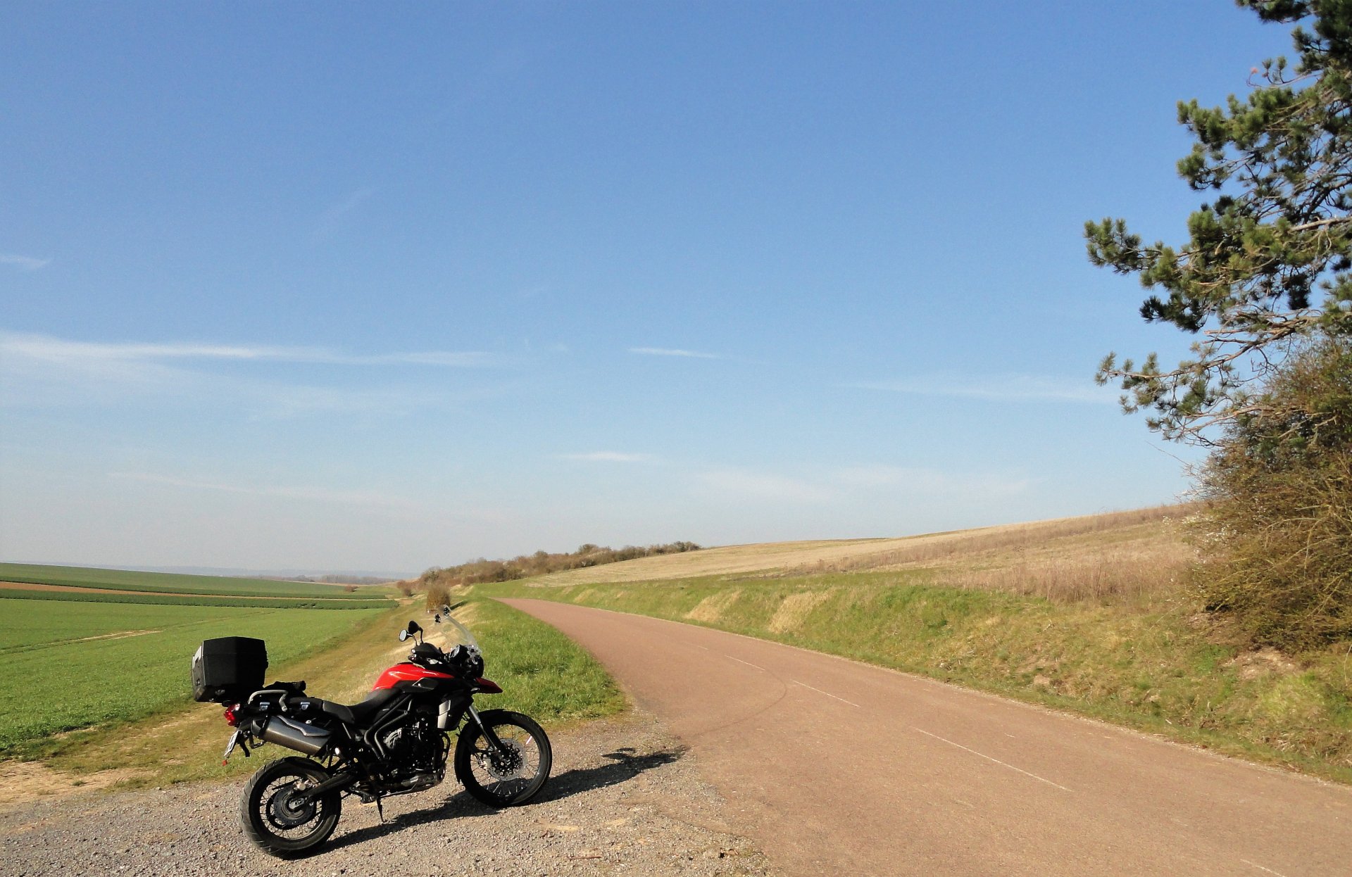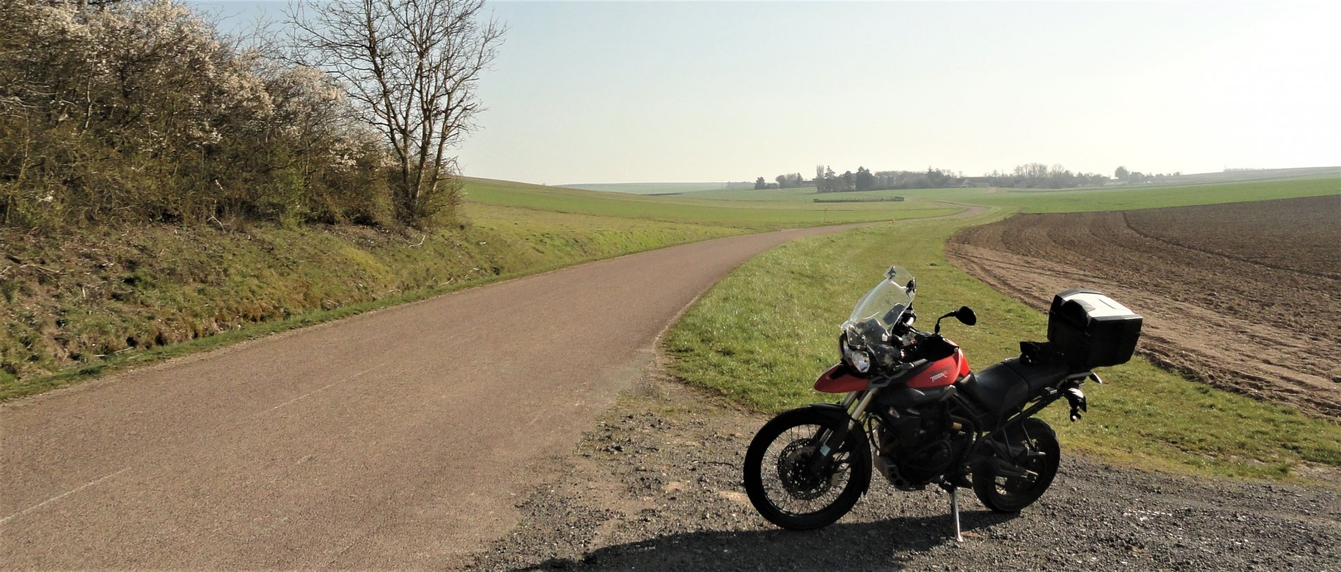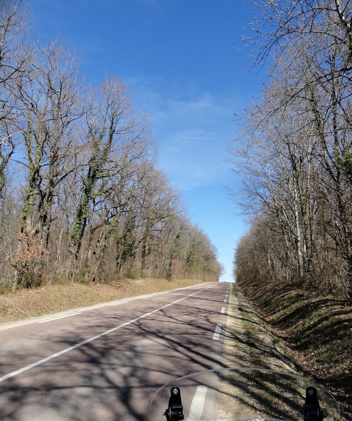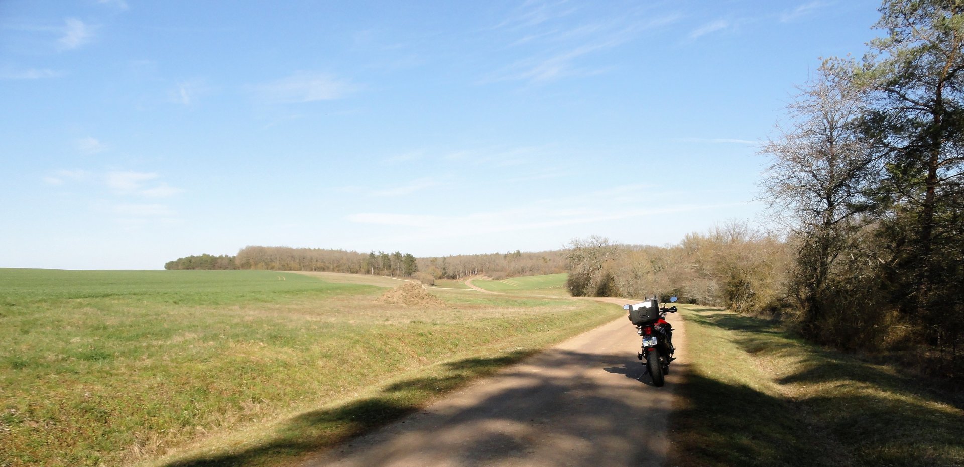 I would, of course, really like to ride to the 4 corners of the earth. Not doable for myriad reasons. A four corners of europe trip would be fun, and is an idea put away for later but not forgotten. The four corners of France Is kinda on the cards, but the plan has turned into more of a "all the way round, passing through the cardinal points" idea and is still in the planning stages. This is the first one of a "cardinal points" or 4 corners of the departement idea ( hey, start small right!) and it might very soon be the limit of travel anyway. So, North, East, South and West. Starting with the Northen most point of the Yonne department accessible by road. a round trip of 180km which took me 2h30 minutes + a couple of stops. Clear blue skies and warm, I dunno what the temp was but I stopped here to remove thermal liner from my jacket. The northern Limit of the Yonne department ( as opposed to the Yonne river) is just south of Fontaines Fourches on the D147 at 48:23'54"N 3:33'16"E. Here; beyond this is the region "Ile de France" which is in lockdown and into which I dare not go for fear of dropping down dead instantly from the dreaded lurgy... Looking south into our clean and healthy non confined department... Then I rode home. I am hoping the 3 remaining cardinal points of the Yonne are more photogenic, or at least more interesting to look at. good ride though?