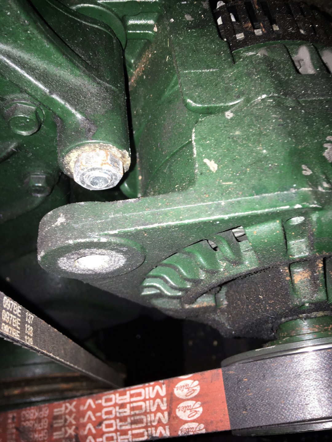 Interestingly, or not, I had another Busted bolt yesterday but at work and when I discovered it it was lucky thay my "Technician" is off sick ( skiving since 6th June 2020) or he would have a) got punched and b) got an official warning for " Faute professionel" (three af them and you're out). This is what I was working on. planned oil and gearbox oil change, oil filters, fuel filters, air filter and belts, then sort the oil leak which I have traced to the oil pressure guage senders on the side of the block then clean the whole thing properly which obviously hasn't been done for some time. Note the excellent designof the hydraulic pump on the front of the main pulley, you have to remove the bloody thing to change either belt...( that's why the bolts are half out) When I looked at changing the alternator belts, I found this set up on the lower alternator: The whole thing was waaay out of alignement and clearly not correctly fitted. A while back I found two green painted bolts and a bush on my desk, with no explanation of where they came from... now I know. This is clearly a large dose of taking the piss and "don't give a shit'ism and means that my "technicien" if he ever returns to work, clearly cannot be trusted and is therefore worthless to us. I retrieved the bolts from my box of " That looks specific, I wont throw it away" bits and spent an hour removing the sh!t, changeing the belts, refiting the correct bolts and spacer and realigning the whole. ( all torqued down to "two white knuckles" ?) this is what it should look like