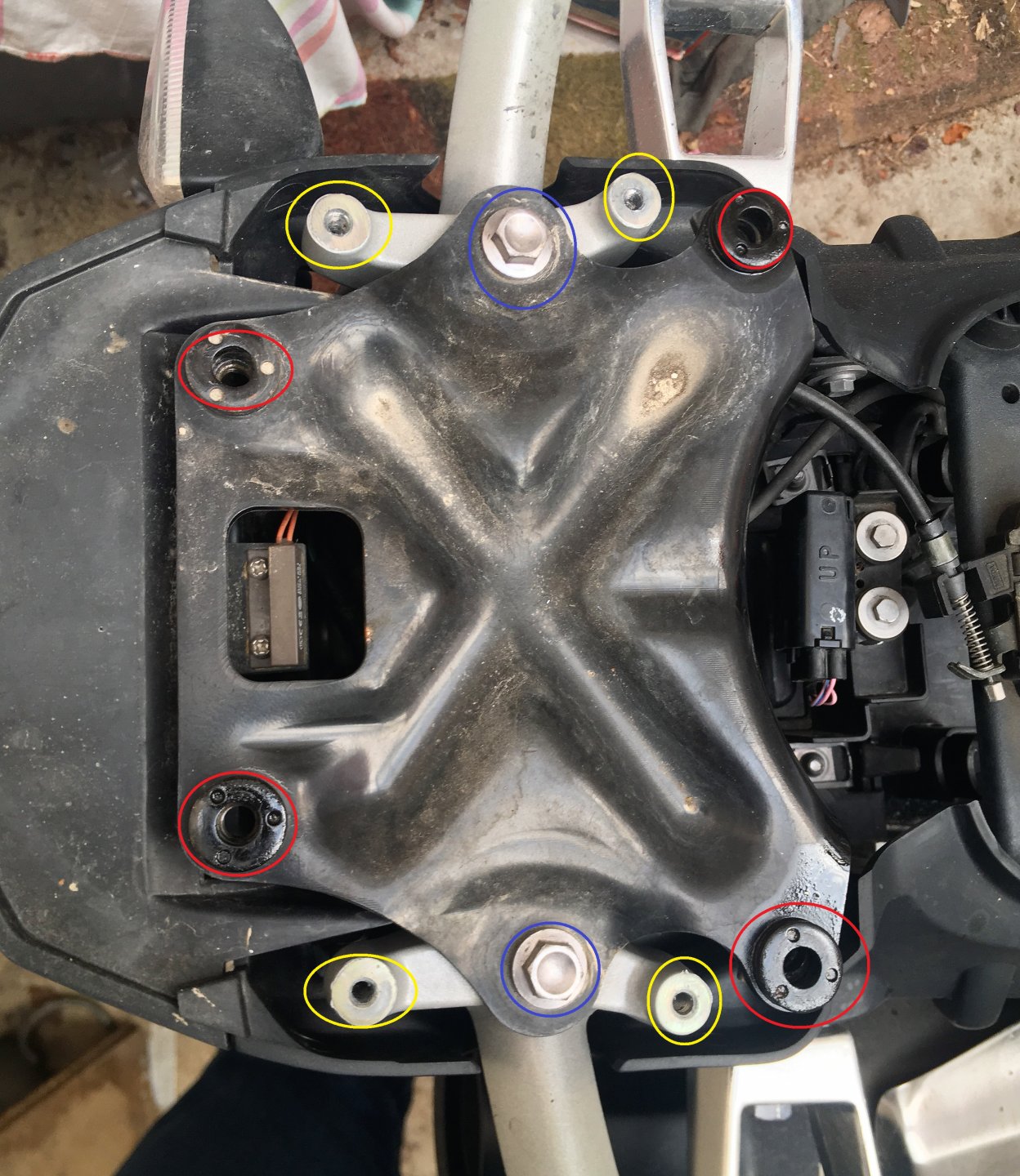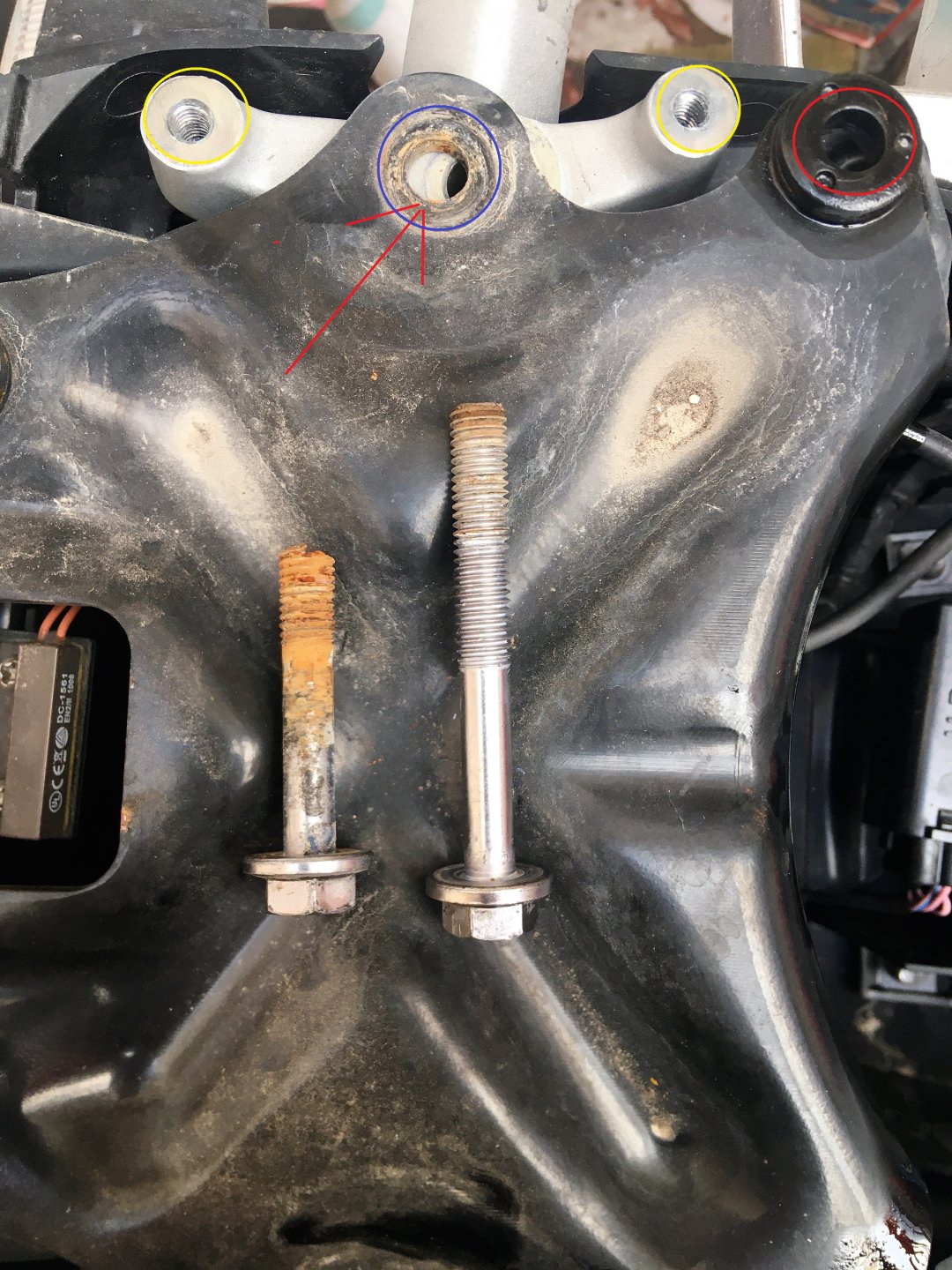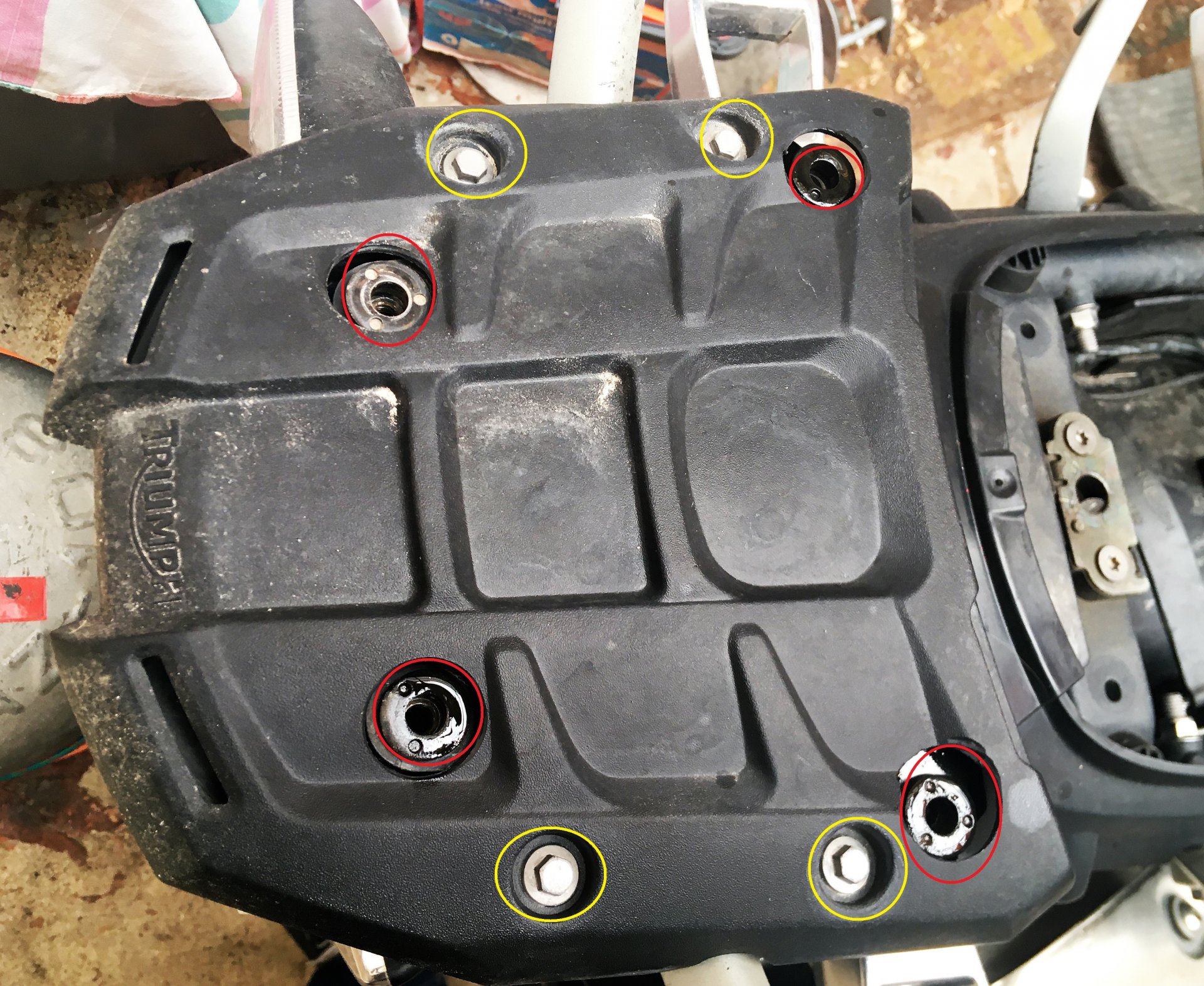 That's the 4 bolts out then... yep, but wait...what's this? below the sliding rack for the topbox is the original rack, with 4 more bolts ( ringed in yellow) 10mm this time and though dry and tight they drew with some progressive force but only needed the little socket and drive.