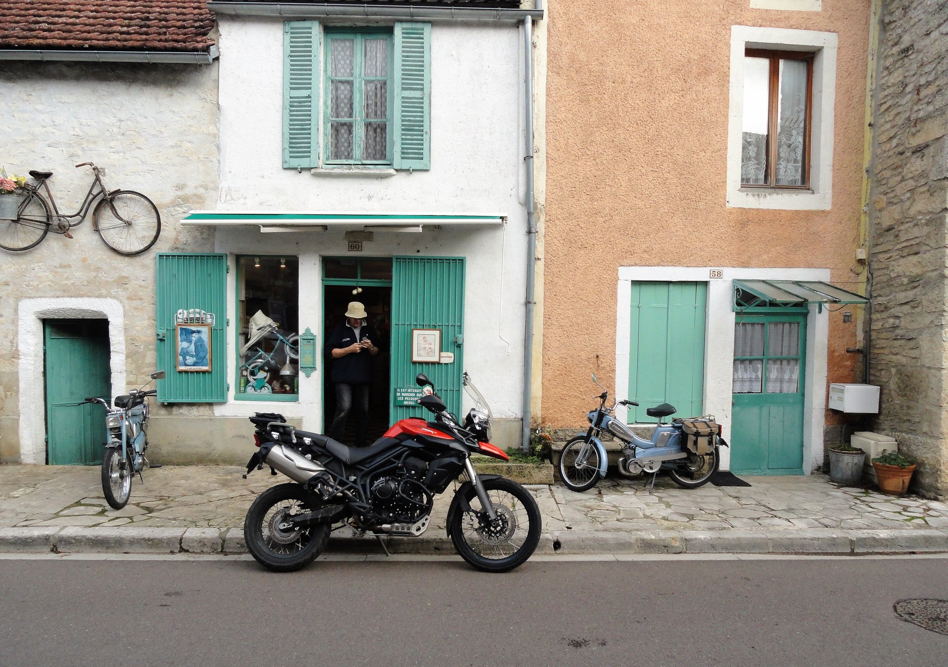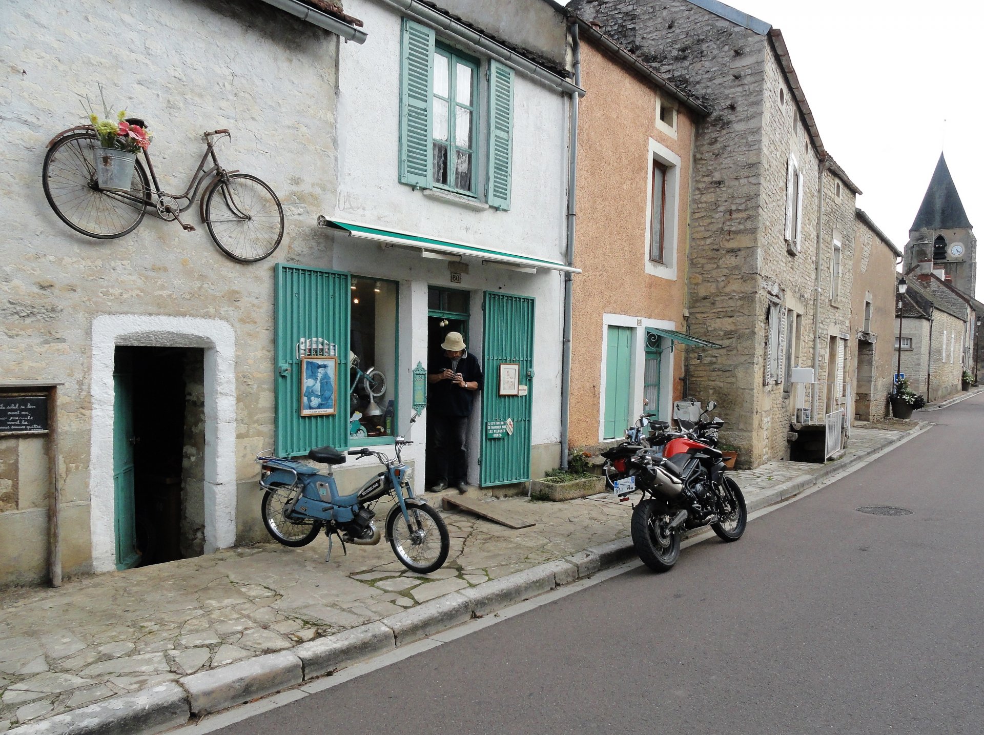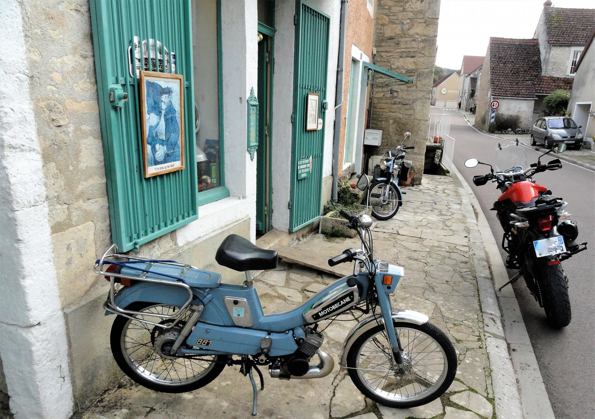 Had a serious session with the physio this morning which did my arm some good so I thought I'd better cancel that out straight away by going riding this afternoon out towards Chablis and Tonnerre first leaft home about 3 ish. Almost caught the curvature of the earth here, or what would be the curvature if it wasn't actually flat of course... 9/10ths cloud cover but not cold, about 16c I think. Chablis Vinyards going golden, shame the light was so poor a horsey farm for Pete and in a small village "Massangis" I nearly missed this but Tigger said "Oh! Tymmeh's Tomos!" But it wasn't, it's Motobecane from 1974 ( i think) and there's another one the other side I spent an hour or so here, this guy doesn't really sell them, he does them up. the motobecane will do about 70kph he reckons and last year he rode it down to the Millau viaduct and back with some mates on similar machines, that would be a hoot! in the vice in his workshop/ front room was the motor from a 1959 Solex his whole workshop looked like it had slipped out of the 60,s and today; The light was fading fast but when he said he used to ride big bikes and still had a Thruxton and a Velocette in the garage out the back I just had to have a peek and was confused to find only one bike... 'turns out to be a Velocette Venom Thruxton (which I didn't know even existed, I thought only triumph did a "thruxton") from 1967 if I remember right. gorgeous machine... but he rather i didn't take pics of it as it's worth quite a lot of money apparently. I still had an hour or so to ride home and it was nearly dark so I didn't take any more pics and got home around 7. My arm now hurts like hell, but it was worth it.