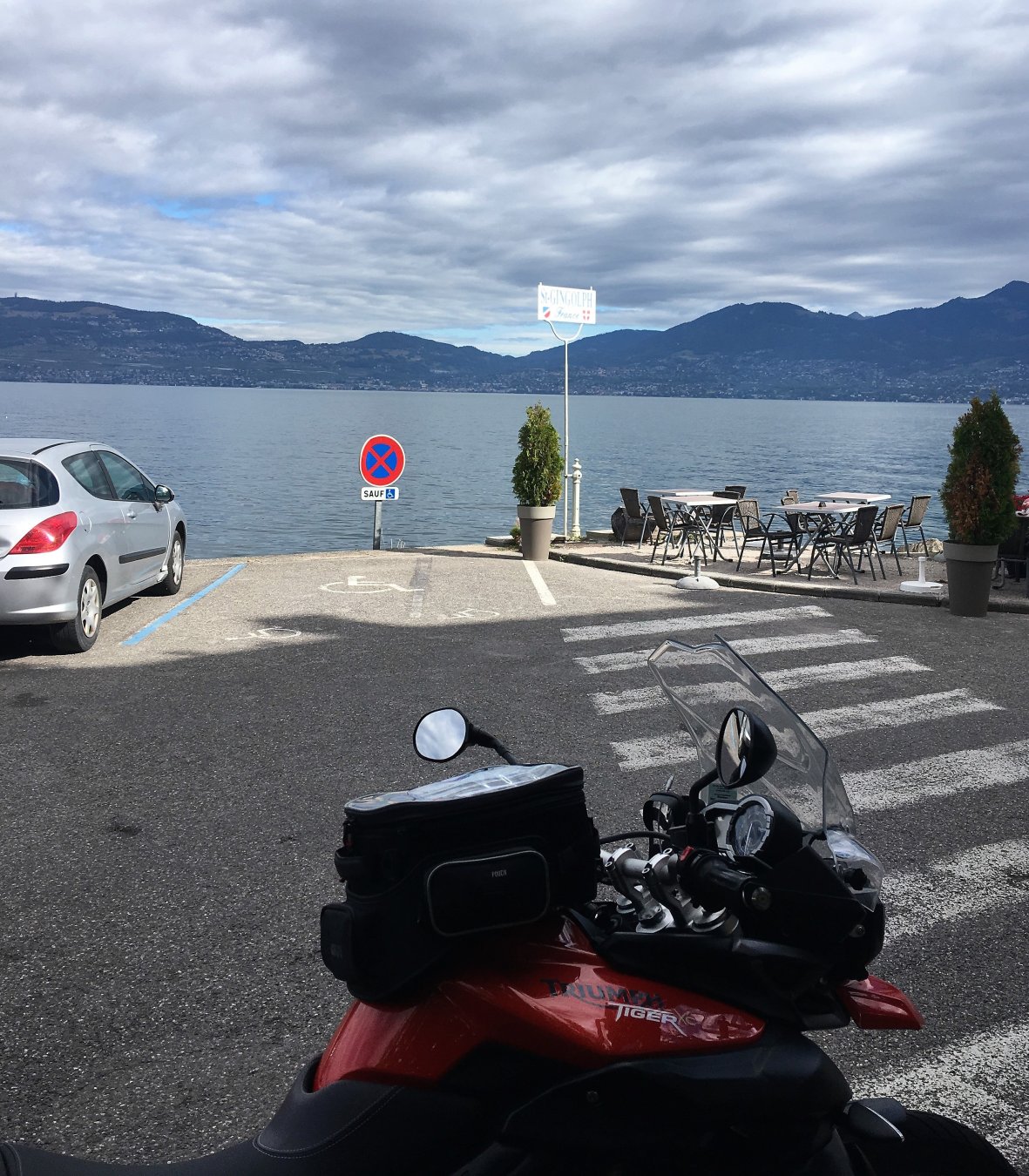 next morning i rode with the group as far as Cure where they turned back westwards and I carried on turning right down the eastern flanc of the Jura towards lac leman ( or lake Geneva as the uneducated call it) I dropped down the hairpins through St Cergue to the lakeshore and along the edge of the lake through geneva and out the other side heading North east alon the french shore and back into Switzerland at St Gingolph where I popped down to the lake edge and took this photo.