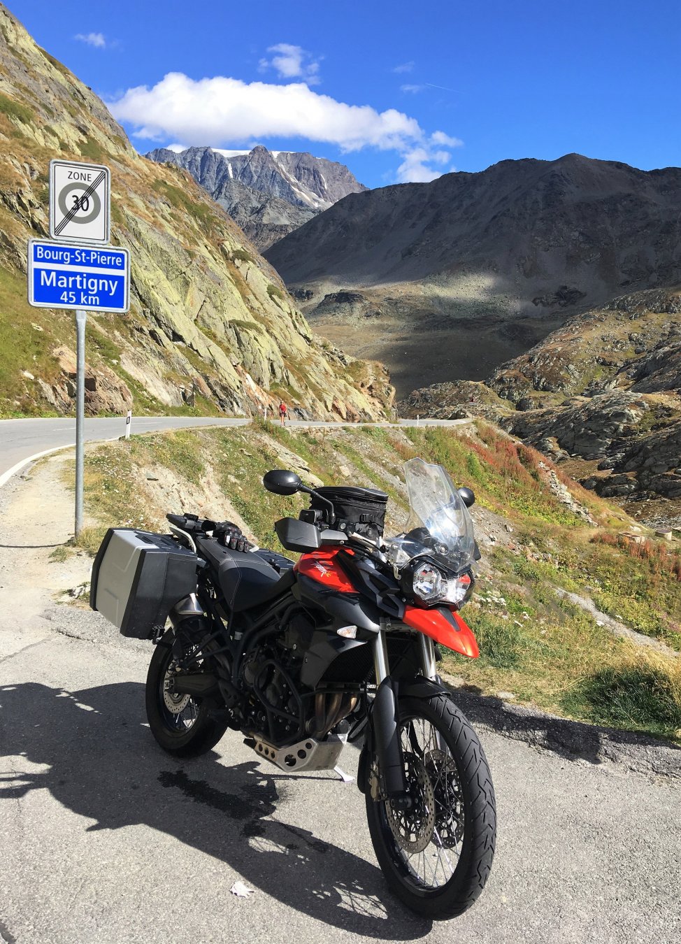 I rapidly withdrew, stopping a little further round the lake for the pic above. I then set off down the south side of the mountain heading for Aosta. I had a lot of fun on the way down but was very much put to shame by a complete nutter on a pushbike who would overtake on the straights ( 70odd km/h) and then get in my way on the hairpins. This is how I discovered that I can lean the Tiger considerably further over into the corners than I would have dared with the tralp ( Oh, and that the bakes are a little more efficient...)