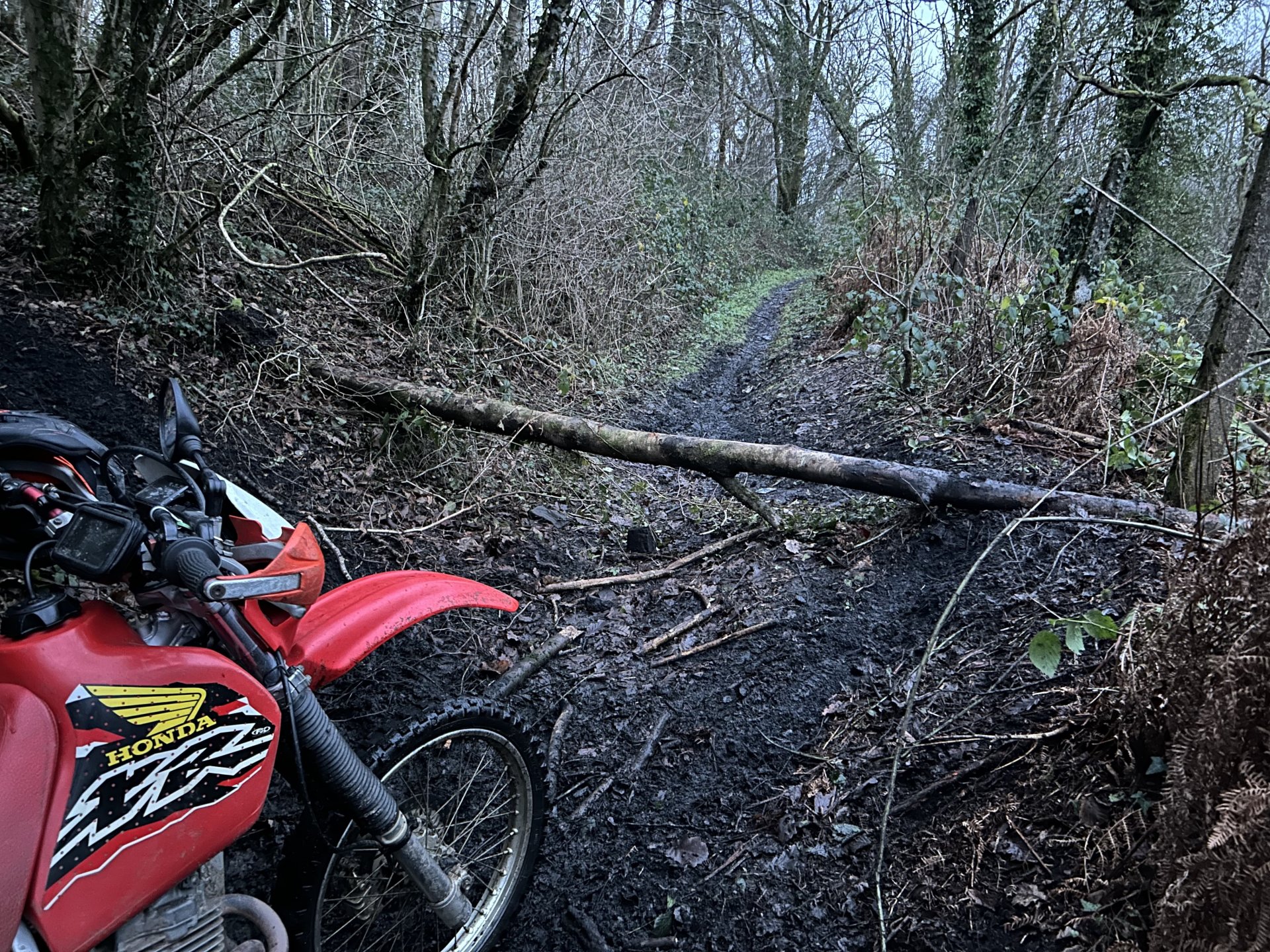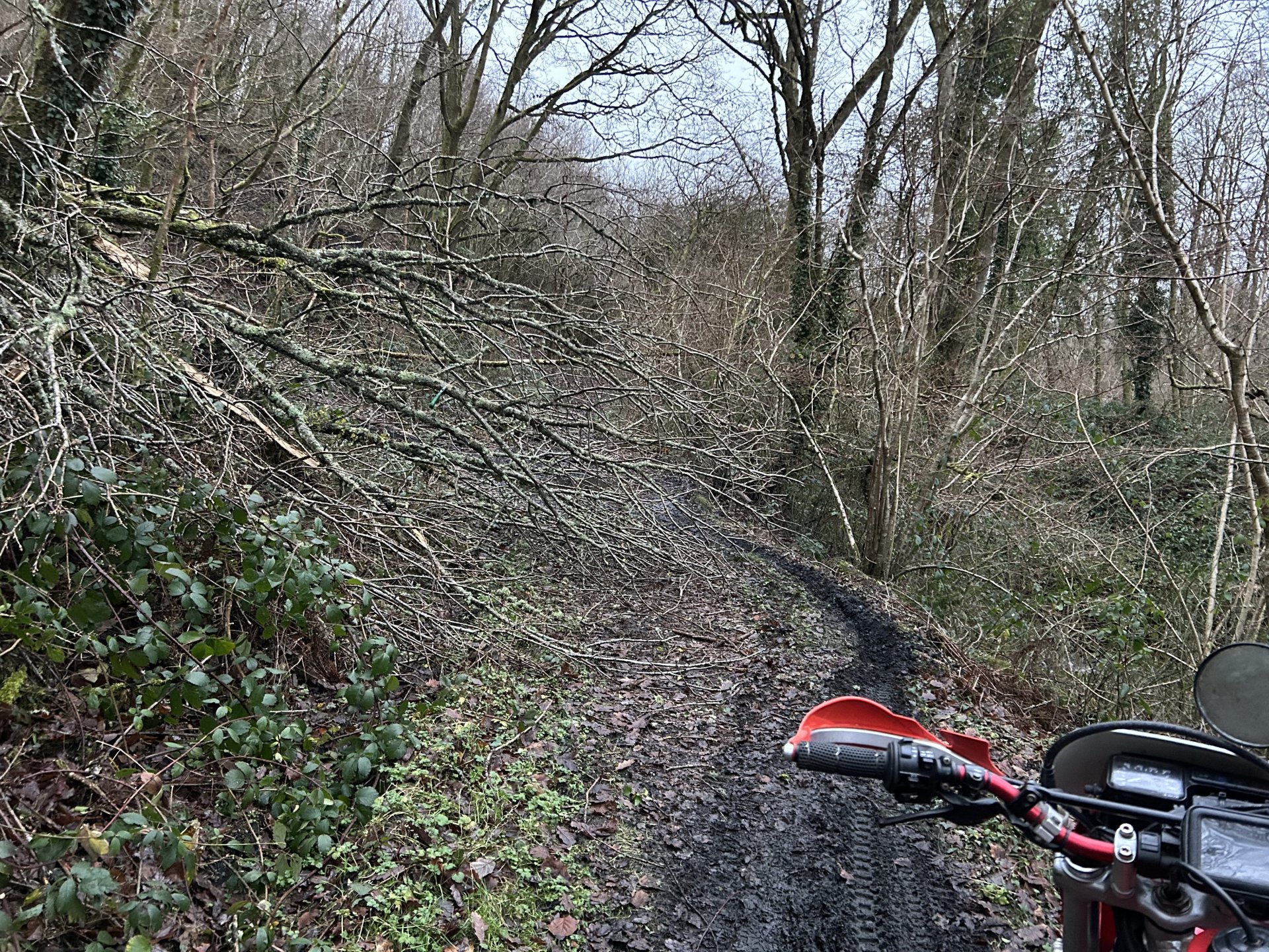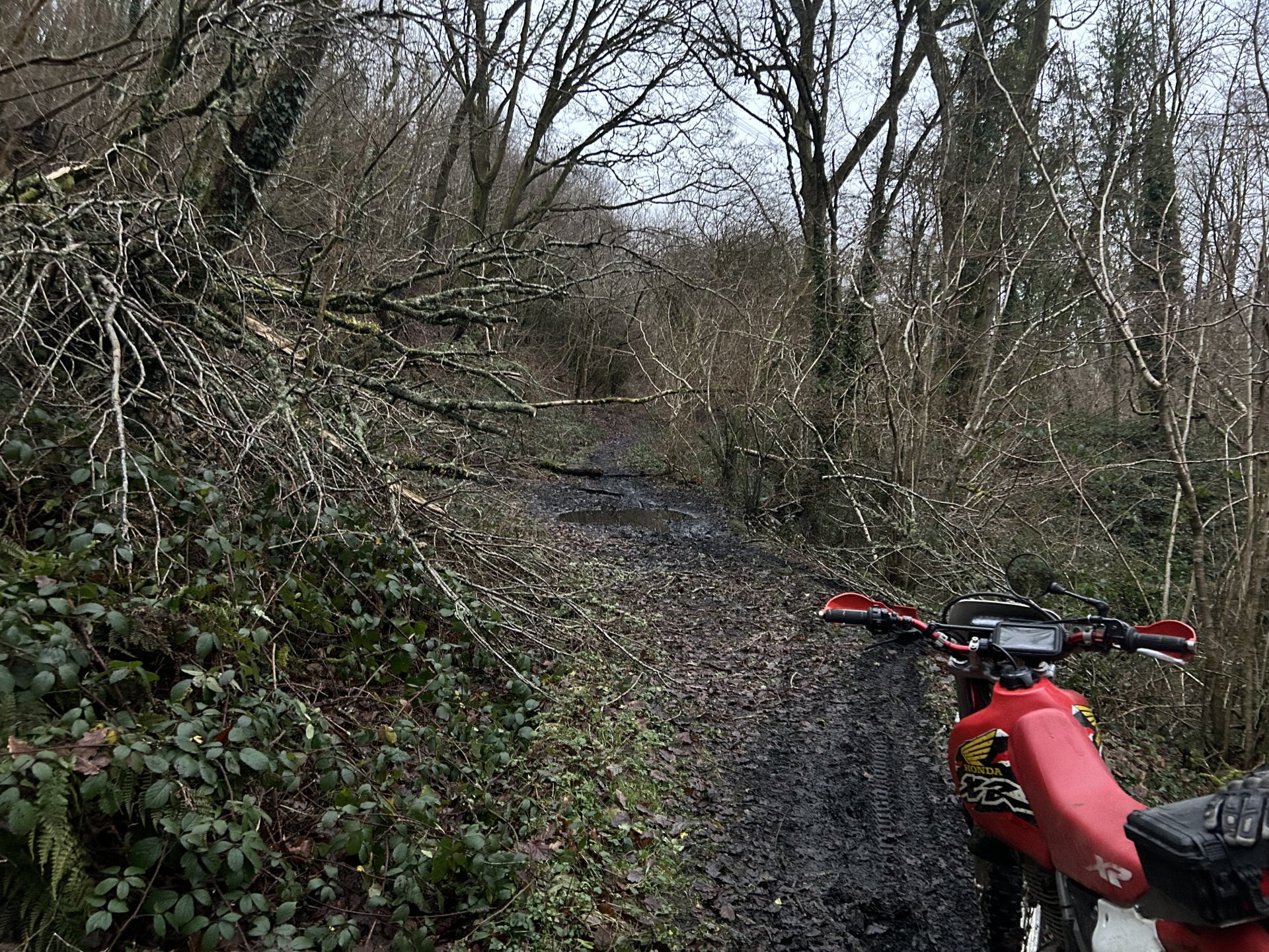 Finally got the lead out my arse and dragged a bike out first time since the 28th of September i'm ashamed to say. It was the XR's turn i wanted to check out a road before i start the process of messaging the council to see if it still has vehicle rights on it, and a plod around some of the local lanes to check for fallen trees that may need clearing The road i was checking out is only a few miles from my home and is called black road the bit i was going to look at was abandoned years ago when they diverted the route it was good on the bike as half way along was always mucky as hell. Considering its been abandoned for so long the tarmac surface is better than the roads still in service although the leaf mulch made it all slippery as hell Unfortunately the mucky bit is now a lake and in passible by bike The road is to the right of this tree and the bank i shall return on the Beta to see if i can pick a route through in the woods on the right From here i had a run through he lanes around Pentyrch which were all cleared by the TRF over the last few weeks and then onto Merthyr where i stopped to clear a spindly branch A few hundred yards on i encountered this a little too large for my folding saw but cleared the thin branches to make it easier to squeeze between them, i shall return with the chainsaw for this one And then there was this i could get around but where the bike tracks are the ground is starting to break away and its a big drop off to the right So my trusty hand saw made short work of it Another few hundred yards and there was another branch down so out with the trusty saw and disaster i snapped the handle That saw has been in my service for many years and seen some action i shall be having a short memorial service for it later in the week LOL After oiking the bike over the log i then came to this lot, its getting dark and i have no saw so had no choice but to turn around and will revisit with the chainsaw another day to clear it. There's a gully after this tree where i repaired the path down to it in the summer it's what i wanted to see after all the rain we've had.