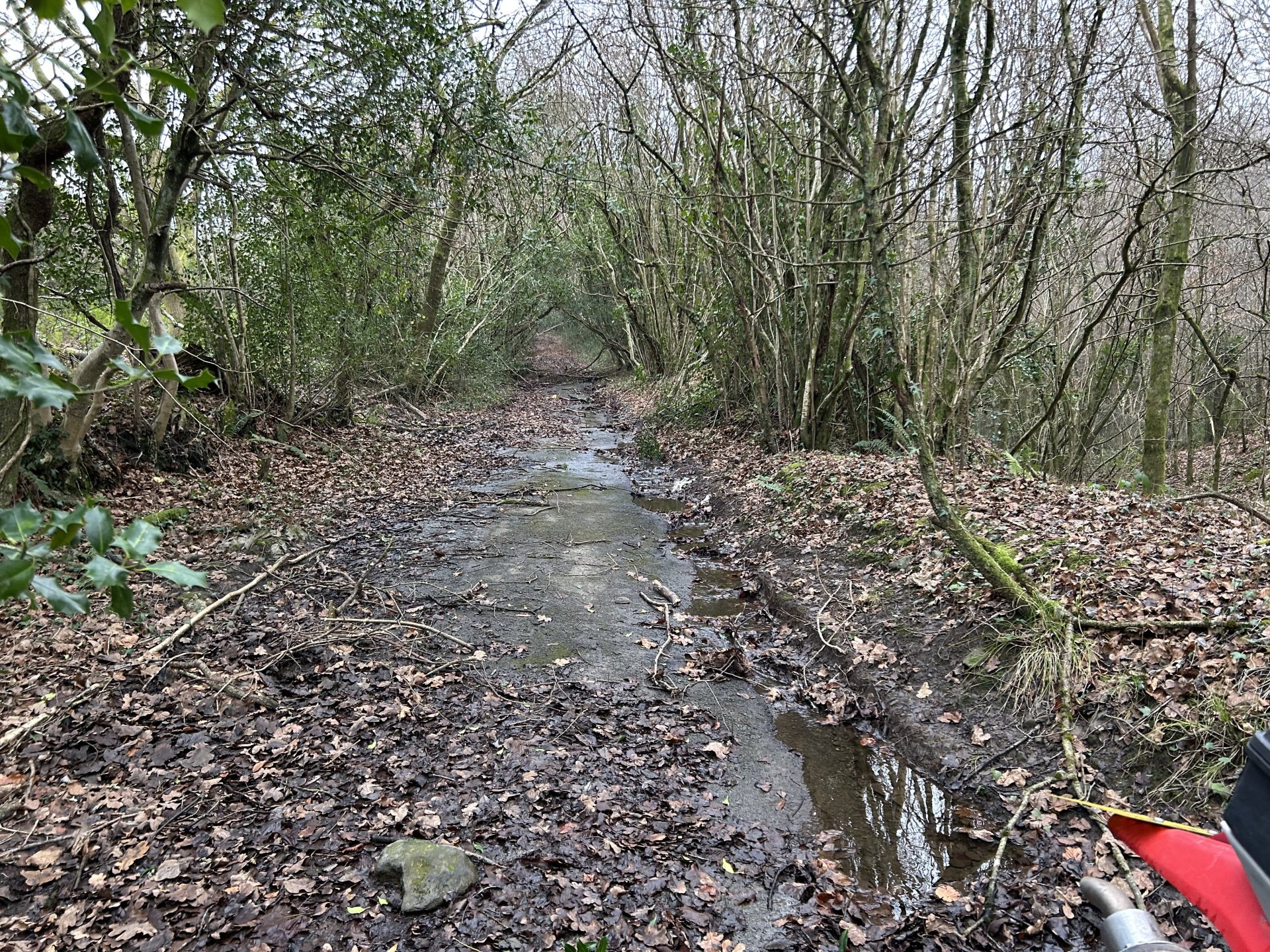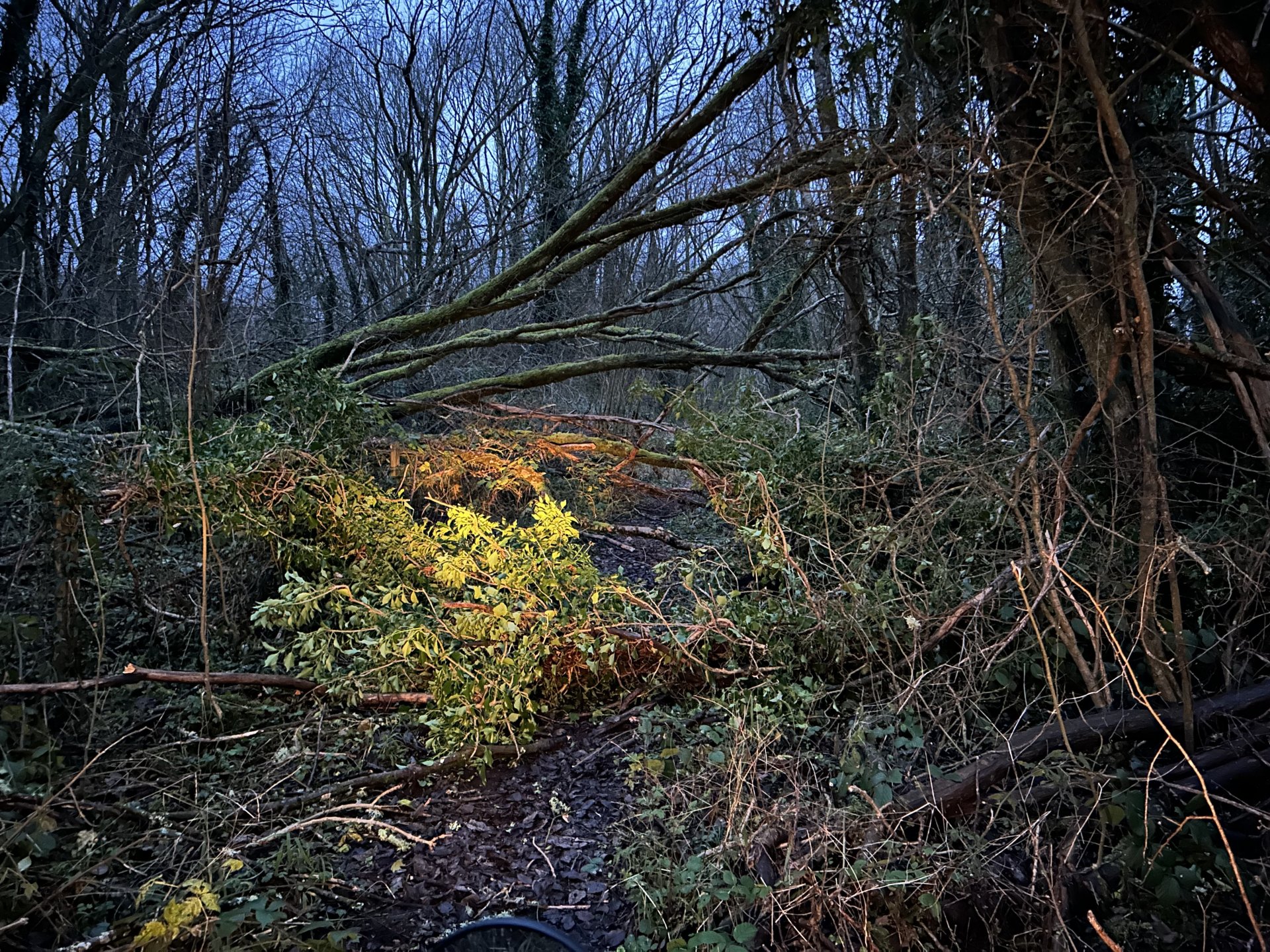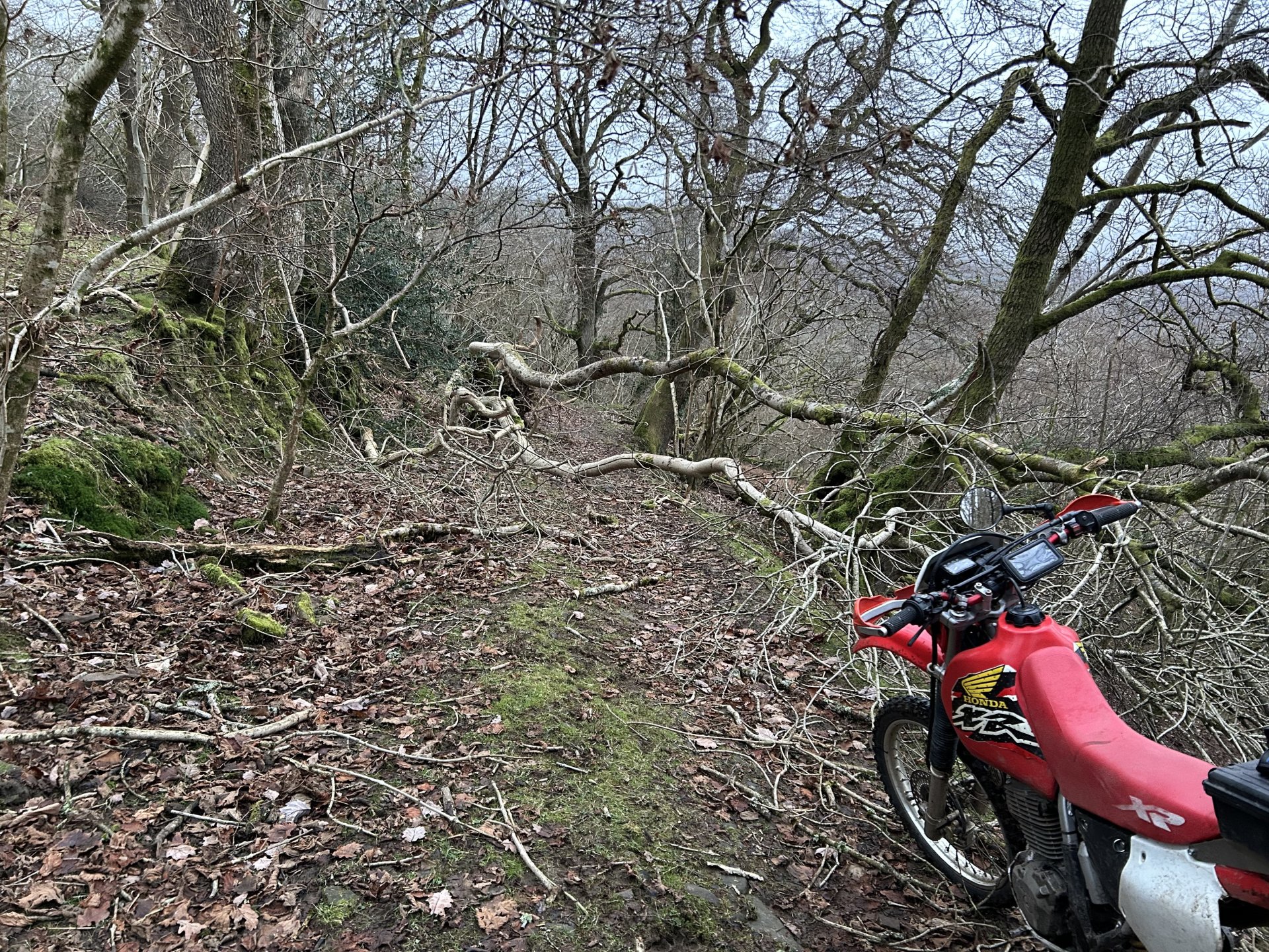 Finally got the lead out my arse and dragged a bike out first time since the 28th of September i'm ashamed to say. It was the XR's turn i wanted to check out a road before i start the process of messaging the council to see if it still has vehicle rights on it, and a plod around some of the local lanes to check for fallen trees that may need clearing The road i was checking out is only a few miles from my home and is called black road the bit i was going to look at was abandoned years ago when they diverted the route it was good on the bike as half way along was always mucky as hell. Considering its been abandoned for so long the tarmac surface is better than the roads still in service although the leaf mulch made it all slippery as hell Unfortunately the mucky bit is now a lake and in passible by bike The road is to the right of this tree and the bank i shall return on the Beta to see if i can pick a route through in the woods on the right From here i had a run through he lanes around Pentyrch which were all cleared by the TRF over the last few weeks and then onto Merthyr where i stopped to clear a spindly branch A few hundred yards on i encountered this a little too large for my folding saw but cleared the thin branches to make it easier to squeeze between them, i shall return with the chainsaw for this one And then there was this i could get around but where the bike tracks are the ground is starting to break away and its a big drop off to the right So my trusty hand saw made short work of it Another few hundred yards and there was another branch down so out with the trusty saw and disaster i snapped the handle That saw has been in my service for many years and seen some action i shall be having a short memorial service for it later in the week LOL After oiking the bike over the log i then came to this lot, its getting dark and i have no saw so had no choice but to turn around and will revisit with the chainsaw another day to clear it. There's a gully after this tree where i repaired the path down to it in the summer it's what i wanted to see after all the rain we've had.