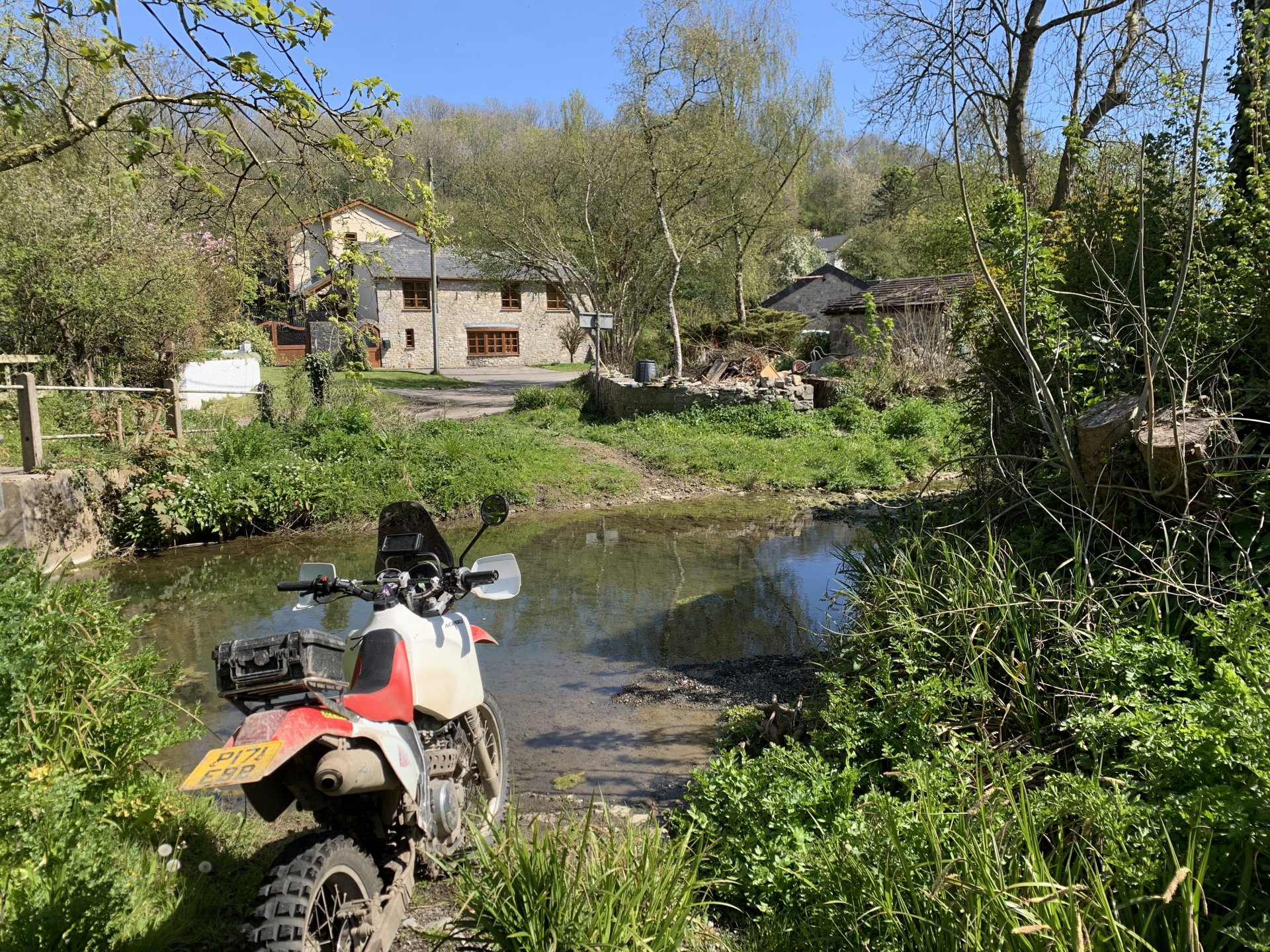 Stopped to say hello to these fellers This one was giving me the eye Had a little more off this one Stopped to have a look at the church in St Nicholas nice to see a lot of the new graves there are of people who died in their 80's and 90's It looks a bit odd because i had to take a panoramic to fit it all in And this is the war memorial just across the green from the church And down to the ehh Downs where they use this to transmit the shit we have on TV And another nice easy lane Onto Wenvoe to look at the next couple of lanes i wanted to check out all nice and easy with no bloody gates Hard to believe this is just outside the big city Cardiff A bit rocky down here Into Llancarfan another beautiful village i chickened out at this ford it looked bloody deep And this one looked easy but it was like riding on ice concrete covered in slime Stopped for a drink and the local plod to check me out when a scene from quadrophenia past by mods everywhere i snapped these when they pulled in for fuel I would have chased after them and kicked them off but i was going this way Found this place in Boverton whata waste i tried to get in but it was a bit too public for me to jump over the fence Had to cut my ride short after the last lane ther was a big log i had to squeeze past and new my footrest would hit it so took my foot off but didn't expect it to catch my gear leaver After that i could only select first and neutral so started limping home but first was soooo slow pulled over to see if i could sort it. While lying on the floor somebody stopped on a Harley it was someone that recognised me from work and of all the people to stop it had to be him. He bought his Harley about a year ago and when he told me i said to him don't expect me to stop if i see you broken down on the side of the road which he had great pleasure in reminding me what a cunt I bent it enough with the little tools i had to get it selecting all the gears so got home ok