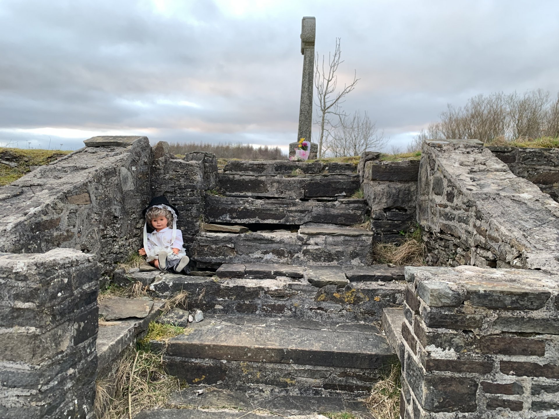 I had a little jaunt on the 650 tonight they have put gates and locked them on my favorite mountain road along with CCTV i'm hoping this is just for the fly tippers. i could get around the gates no problem and didn't cover my number plate as i want to find out if there are any consequences to riding through there as there are no signs saying no vehicles. The first gate was to allow horses through no trouble getting the bike over there This one has a small gate to the left which is unlocked for now And this one at the far end was easy to go around I went home along the ridgeway on the next valley across and stopped in this old cemetery, I've put photos of this up before i think, this is the ruins of the Chapel i approached the steps and when i turned to go up them this bloody doll made me jump a bit i just took some random photos of the grave stones and when i put them on the computer i had a read of them and was saddened to read there were for children after a bit of research i found someone who thinks there was a lot of scarlet fever victims buried here Here's some drone footage i found of the cemetery, Turn the volume up there's a welsh choir singing for you On the way home i noticed the tyre noise had increased quite a lot compared to when i went out which started the alarm bells ringing when i got home just what i thought flt rear which in a way is good because as i was leaving to go out i thought to myself its getting time to turn the rear tyre so that's tomorrows job