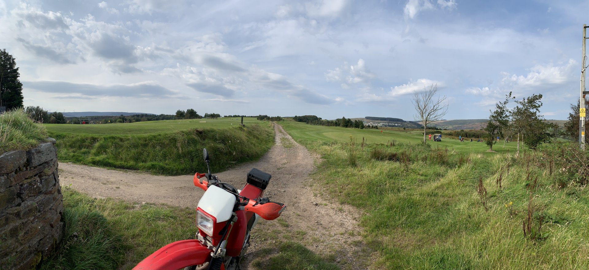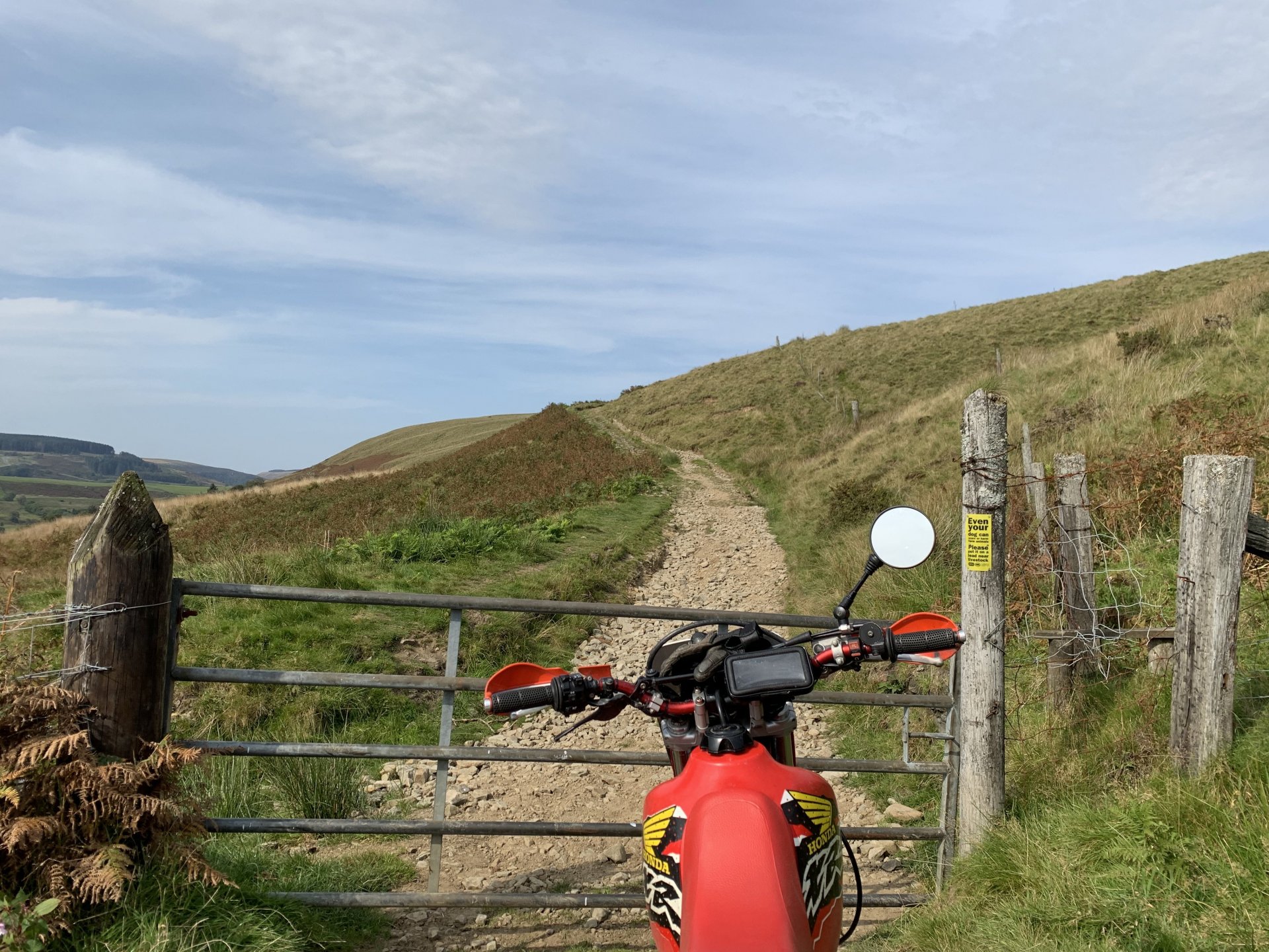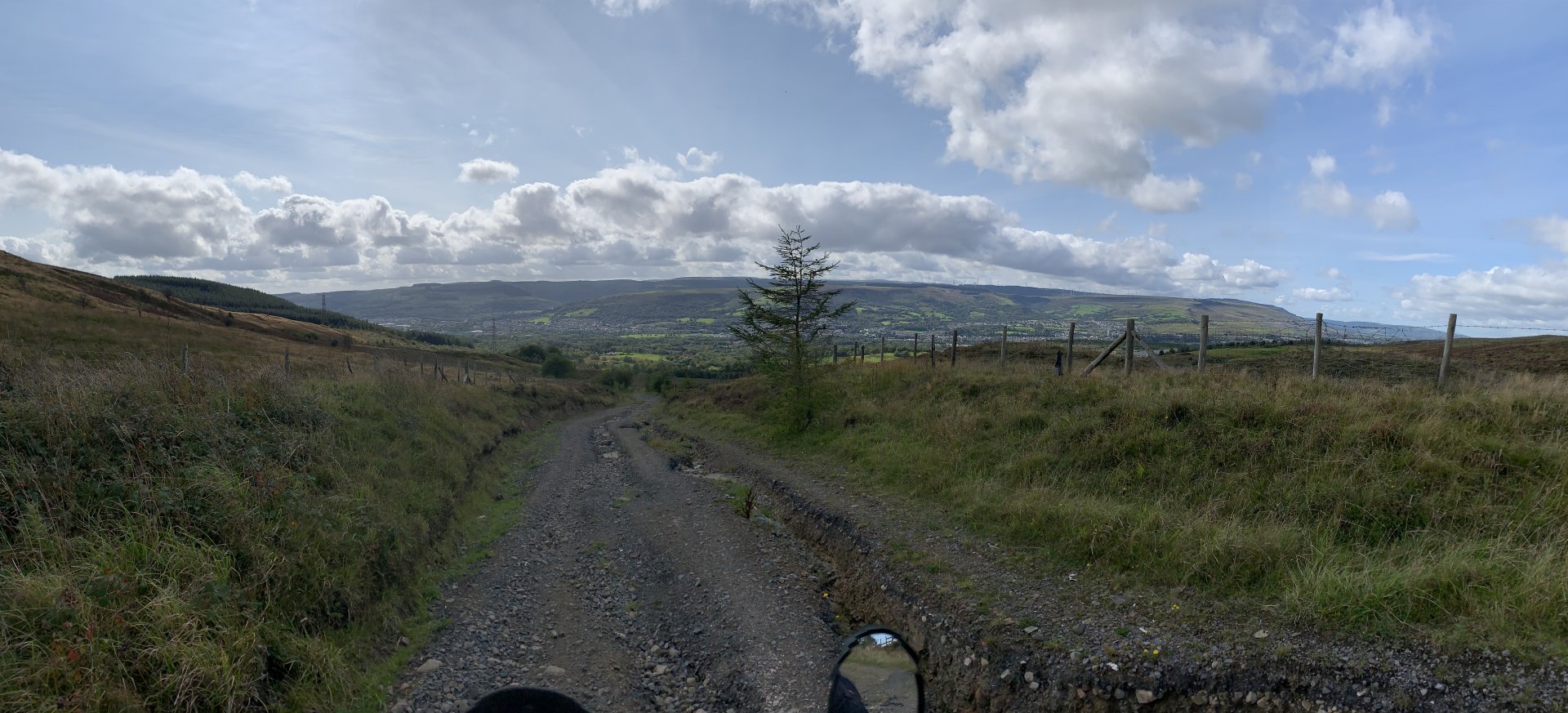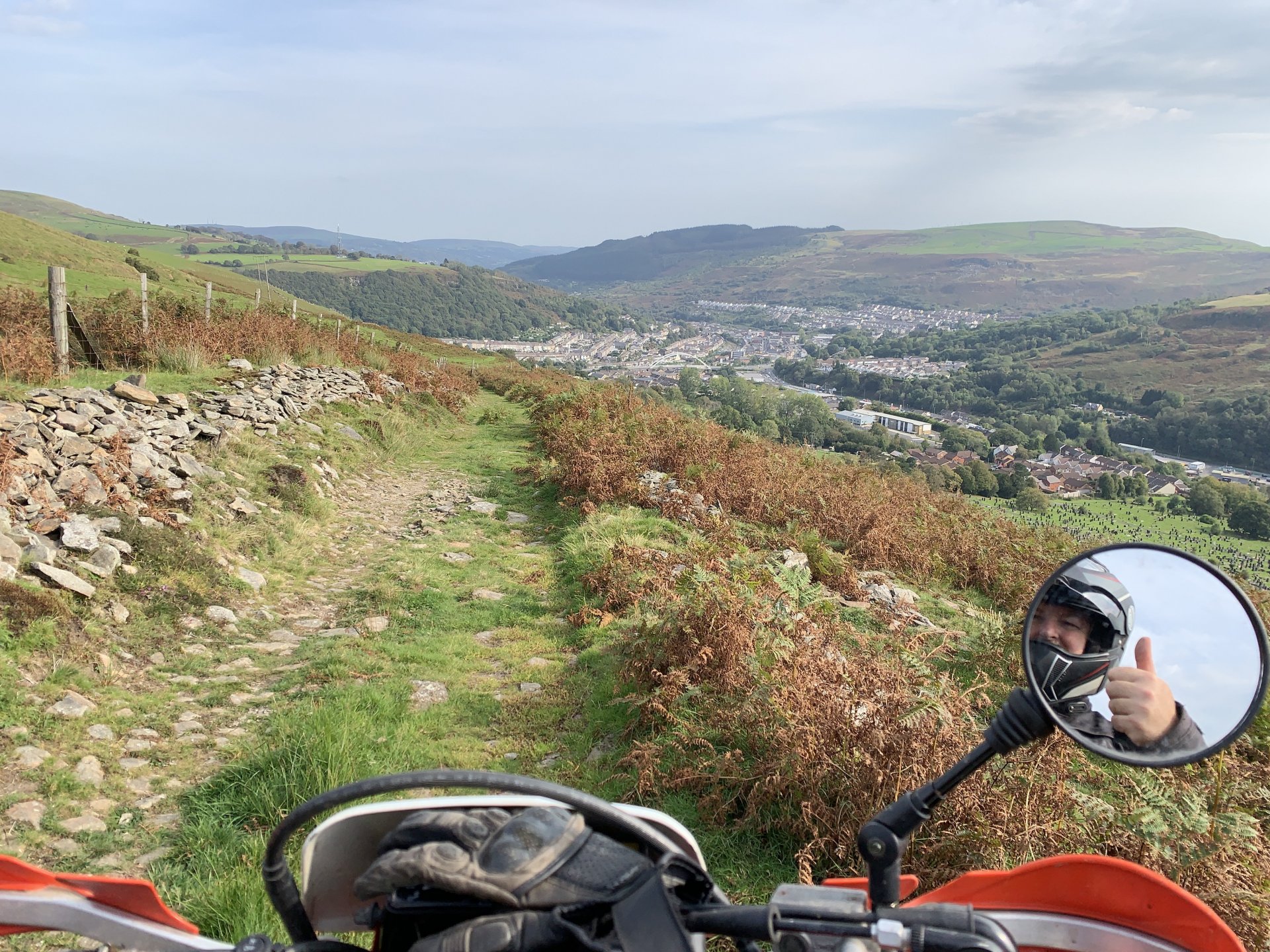 Feeling a bit cheesed off i couldn't use the bike after rebuilding the rear shock this morning due to a new corvid lockdown, but after reading the rules for the area I discovered it was only stopping me from leaving or entering Rhondda Cynon Taff which consists of five valleys so plenty of places to ride without breaking the lockdown rules. I started off going up a lane i haven't been to for years the main route is now blocked by fallen trees so had to go around on this path This is back on the route but i see there are more trees down ahead The bike doesn't feel right its slipping all over the place and i fall off after getting over the fallen tree behind the bike. I decided to have a look ahead before i go to the trouble of negotiating all the fallen trees glad i did the trail is washed out and looked worse further up so made the decision to turn around especially as i was dressed for the winter and it was bloody boiling out The next lane is a few miles further up the valley and the bike performs flawlessly on the road there. At the gate to the lane i decide to reduce the tyre pressures as i know this lane is washed out and tricky in places, looks like i need a new pressure gauge on my compressor i put 15psi in but my mobile pump is showing over 20psi drops the pressure front and rear to about 12psi Reducing the pressures made all the difference the bike feels like it should now no more of that sliding about. I stop at this memorial bench someone has fitted since my last ride up here to admire the view and i also wanted to watch a landrover that was coming up behind me negotiate some of the washed out bits on the way up The view from the bench is great but a bit windy which i didn't mind as it helped me cool down That's Penrhys in the middle distance the shitty in the sky and i didn't spell city wrong there, it used to be a real rough area to live Here comes the Landy I stopped to talk to the landy driver a bit further up, he was doing the same as me with his boy and he shared a video of me getting off and on the bike lol I stalled the bike and when i put my foot down to save it the bloody kick start lever went up my trouser leg and my foot never got to the ground anyhow that's not important lol the next bit was through a bit of forestry not as wet as the last time i was here the next lane i didn't stop for any photos so after that it is up by Penrhys. I like this one because it goes through a golf course and you can see the contempt on some of the golfers faces as you ride through Further on And Heading home only a short ride but really picked me up
