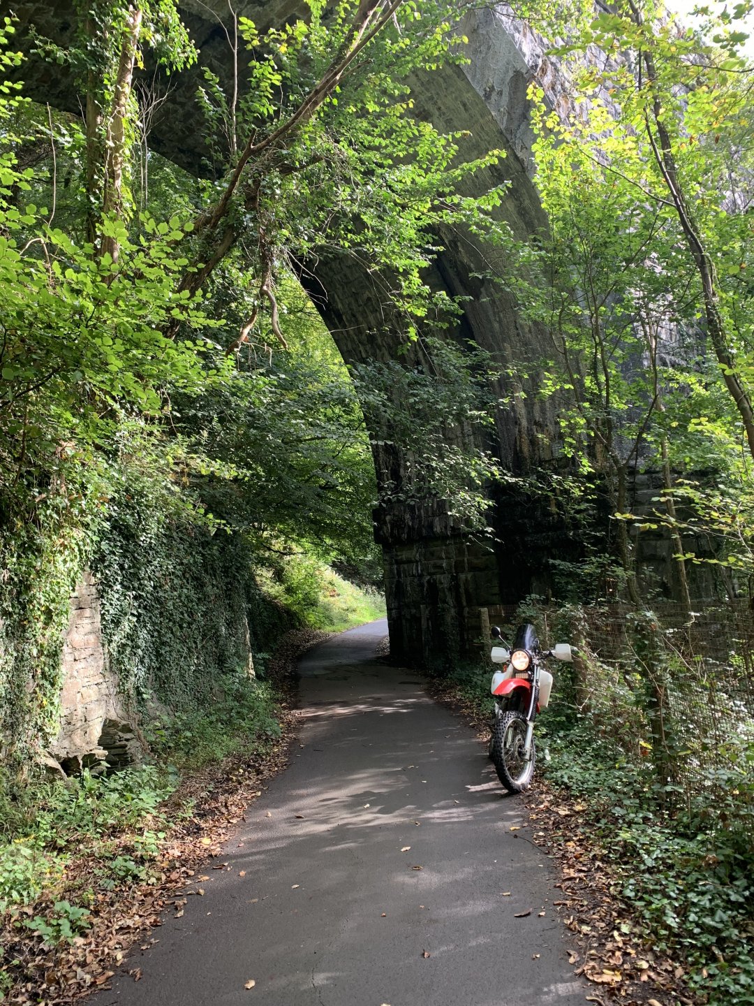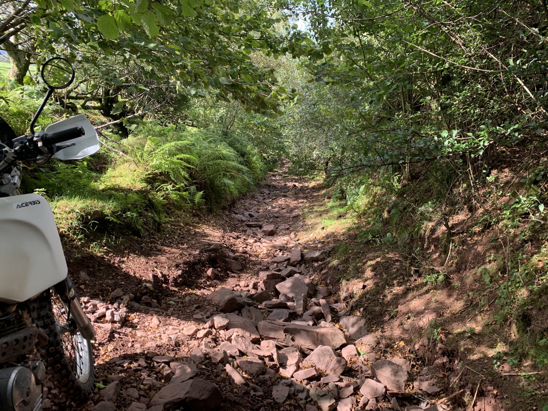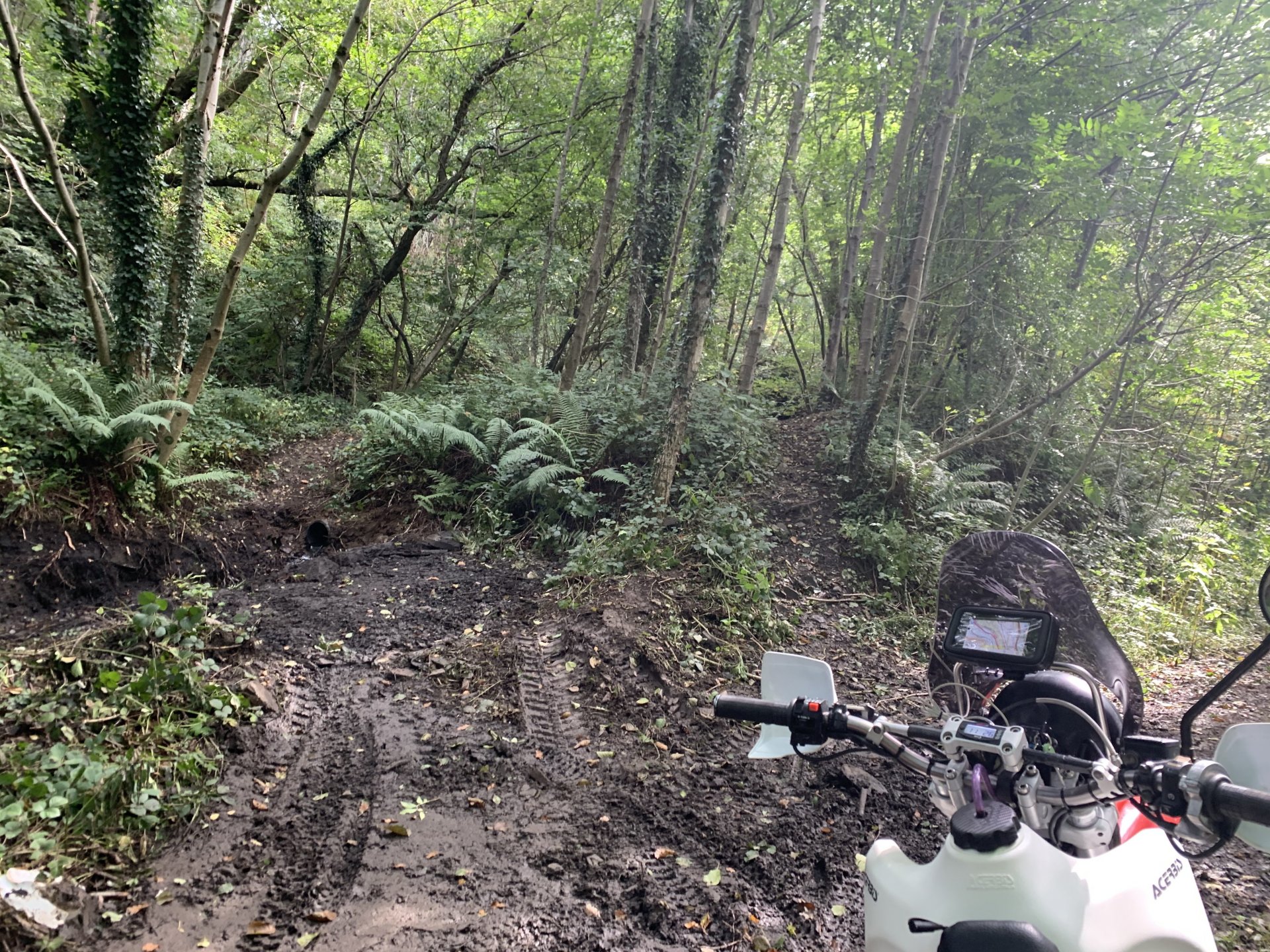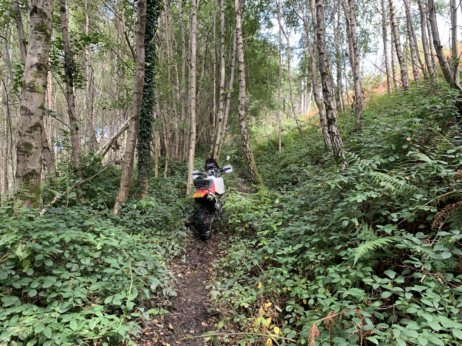 Back to the ride this is a photo of the tunnel entrance where i had to turn around its the group of trees to the left of the pylon Down to a place called Pontygwaith from there to the humpiest hump back bridge i know of Looking into the Taf again Just off the tram road is this, i'm not sure what its purpose was i think a WW2 pill box Looks like some poor bastard spent a night or two in here Good view from the window Back on the tram road its now the Taf trail only those pedal powered heathens allowed on here so only rode in for a couple of photos and then left. I used to ride it all the time before everyone went green On the parish road to methyr now i cant think I've ever seen anyone walking up here but past 3 families on the way everyone's invading my peace since corvid used to be just me the horses and the sheep The black shapes above the brown horse in the distance are solar panels lots of them appearing here now Aberdare in the valley below here This is looking towards Sennybridge one of my many favourite roads This is one of the reasons i came out today I've had a few people ask me about a few lanes on the TET https://transeurotrail.org/ Lots think it's a route suitable for the larger bikes i've been telling people not all of it in the UK is so decided to take a few photos of two i know would be a challenge The start on this one looks ok But soon becomes a flat twins nightmare Bike for scale Quite nice once you get past all that though But soon goes down hill literally LOL Ends in someones garden And the next one isn't much better looks rough from the start This photo and the next show how in my opinion these easily accessible routes on line affect the lanes the second photo i took in 2012 same lane and location On the way home i decided to check out a lane i thought i haven't ridden before The road there was good starts off ok But doesn't last long surprisingly that was all OK to get through Photo to prove i didn't go around When i got here i realised i had ridden this before many years ago and vowed i'd never come back bloody poor memory, getting old sucks LOL Stuck here for a short while but pulling it back a few few feet slipping it into second with lots of gas sorted that. After that it was a bit more hard work before getting stuck again I wasn't far from the main track which goes around this shit but the red dots are supposed to be the vehicle right of way. You will notice by my route i had trouble finding the entrance to this i should have left it lost, i'll be sticking to the gravel next time. Almost there It was home from here along some uninspiring lanes after that And this is why we cut out or remove the front sprocket cover