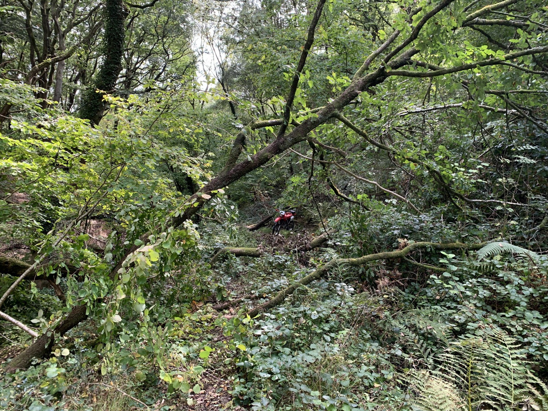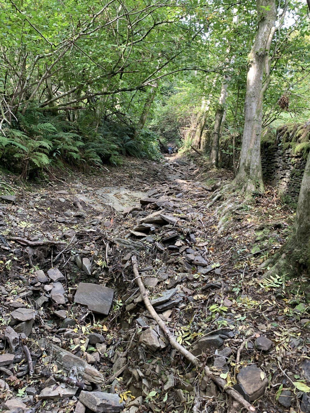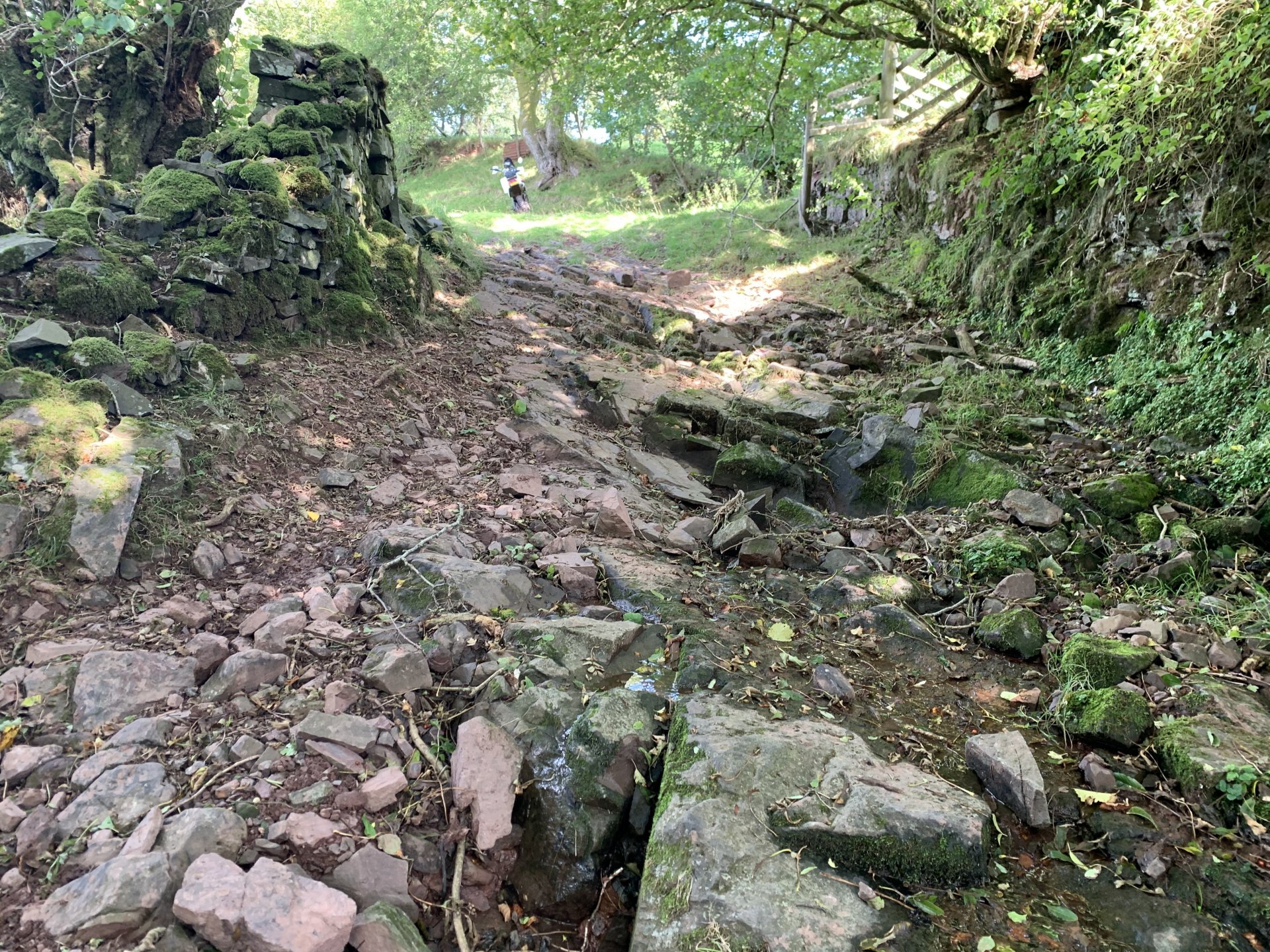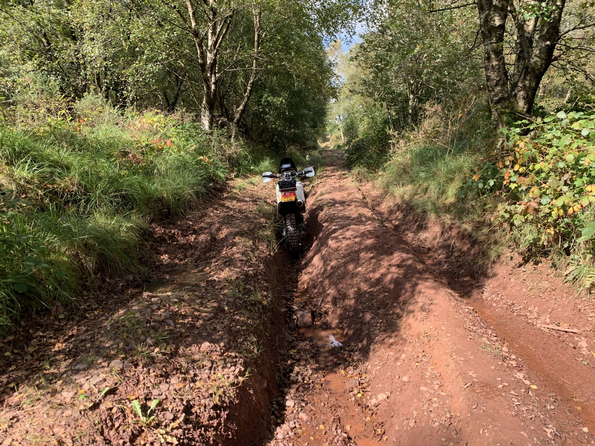 Back to the ride this is a photo of the tunnel entrance where i had to turn around its the group of trees to the left of the pylon Down to a place called Pontygwaith from there to the humpiest hump back bridge i know of Looking into the Taf again Just off the tram road is this, i'm not sure what its purpose was i think a WW2 pill box Looks like some poor bastard spent a night or two in here Good view from the window Back on the tram road its now the Taf trail only those pedal powered heathens allowed on here so only rode in for a couple of photos and then left. I used to ride it all the time before everyone went green On the parish road to methyr now i cant think I've ever seen anyone walking up here but past 3 families on the way everyone's invading my peace since corvid used to be just me the horses and the sheep The black shapes above the brown horse in the distance are solar panels lots of them appearing here now Aberdare in the valley below here This is looking towards Sennybridge one of my many favourite roads This is one of the reasons i came out today I've had a few people ask me about a few lanes on the TET https://transeurotrail.org/ Lots think it's a route suitable for the larger bikes i've been telling people not all of it in the UK is so decided to take a few photos of two i know would be a challenge The start on this one looks ok But soon becomes a flat twins nightmare Bike for scale Quite nice once you get past all that though But soon goes down hill literally LOL Ends in someones garden And the next one isn't much better looks rough from the start This photo and the next show how in my opinion these easily accessible routes on line affect the lanes the second photo i took in 2012 same lane and location On the way home i decided to check out a lane i thought i haven't ridden before The road there was good starts off ok But doesn't last long surprisingly that was all OK to get through Photo to prove i didn't go around When i got here i realised i had ridden this before many years ago and vowed i'd never come back bloody poor memory, getting old sucks LOL Stuck here for a short while but pulling it back a few few feet slipping it into second with lots of gas sorted that. After that it was a bit more hard work before getting stuck again I wasn't far from the main track which goes around this shit but the red dots are supposed to be the vehicle right of way. You will notice by my route i had trouble finding the entrance to this i should have left it lost, i'll be sticking to the gravel next time. Almost there It was home from here along some uninspiring lanes after that And this is why we cut out or remove the front sprocket cover