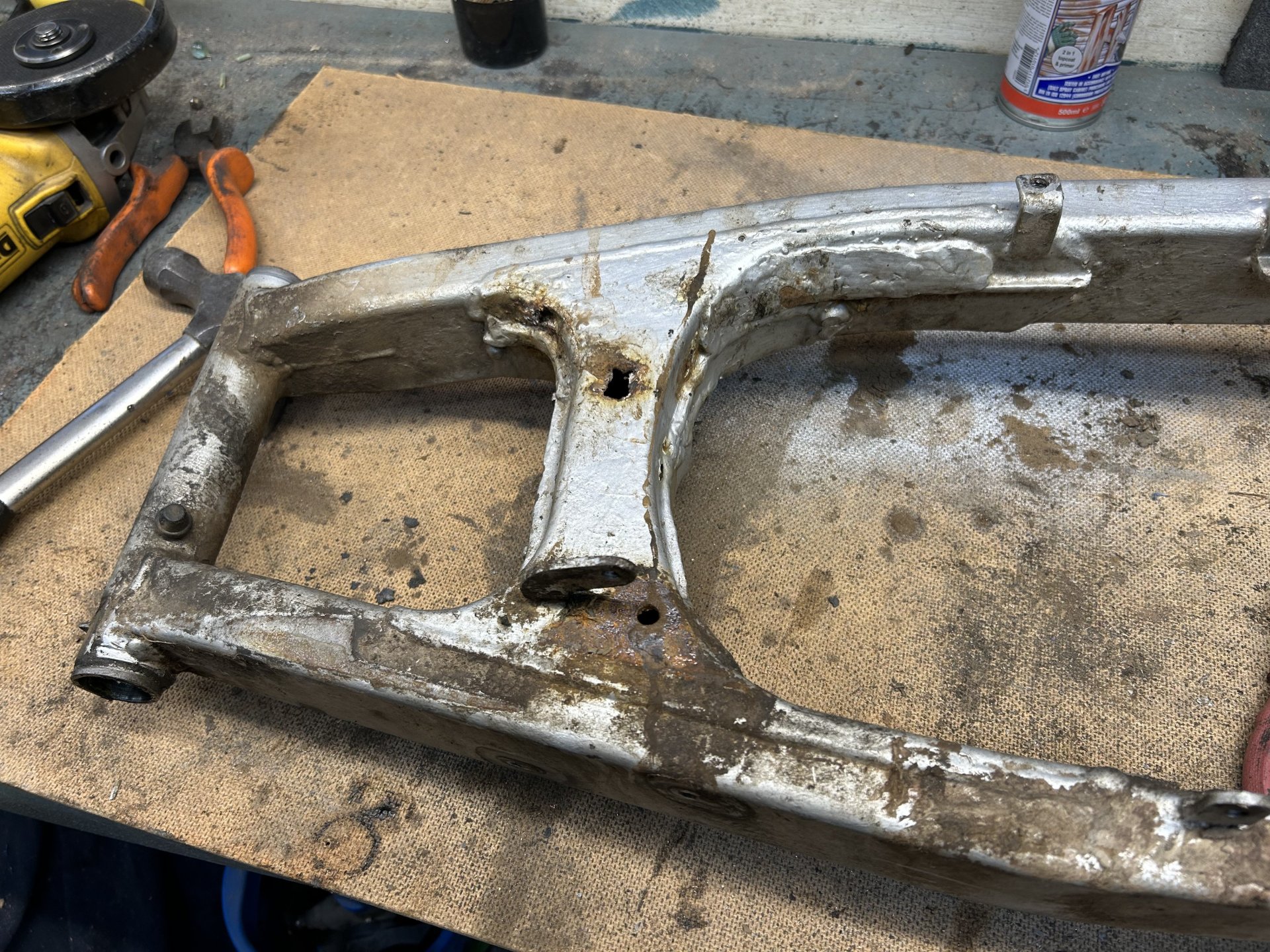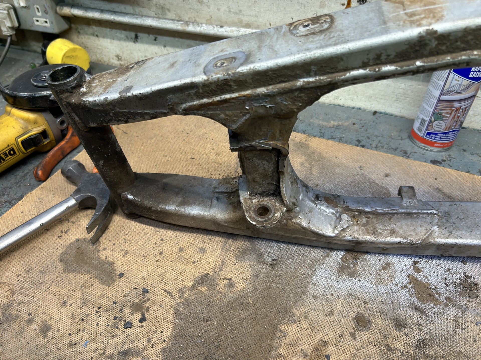 Last night i decided to change the swing arm on the Dog as there's a few holes in it again and i'm fed up of welding it. I 've had a good swing arm kicking around for about 5 years when i took the old one off i remembered why i hadn't changed it sooner, its because one of the bolts is seized in the collar it goes through, when i discovered this years ago the bearings were good so i fitted a grease nipple in there to keep them good. I decided to bite the bullet and cut the mounting bracket off but before i done that i had a look how much a new bolt and collar is in case its some ridiculous price, but not too bad the collar is £9.48 plus vat but the bolt is discontinued Parts 11 and 16 i'm after So the job is to at least save the bolt i put a shit load of heat on it but no joy so ended up welding the collar to a steel plate so i could hold it in the vice and with a large power bar it moved and eventually came out When i'd finished last night and sat down to order the parts i needed i discovered the collar is also discontinued fuck twat fuck i now have a dead dog in my garage if only i knew someone with a lathe