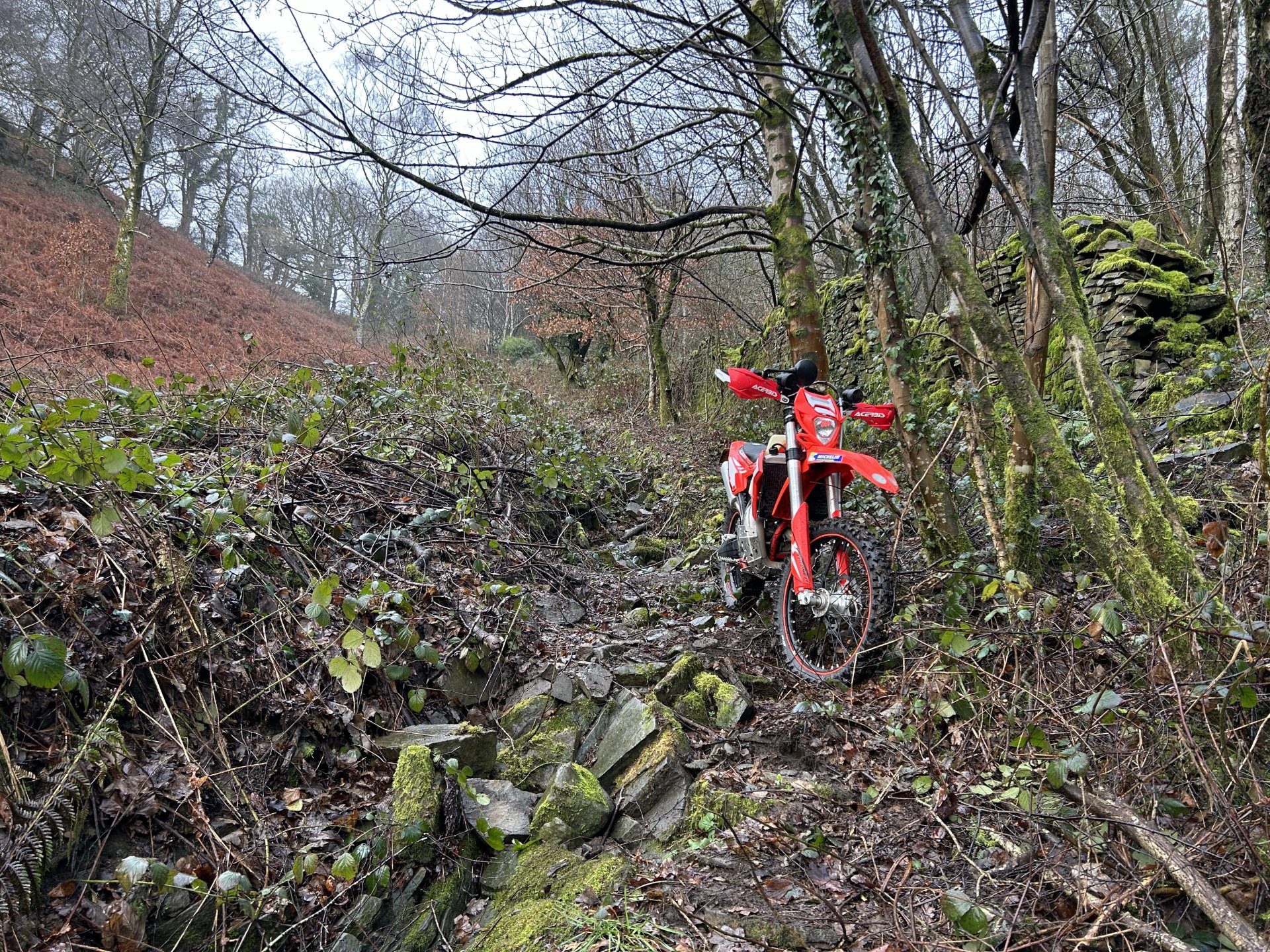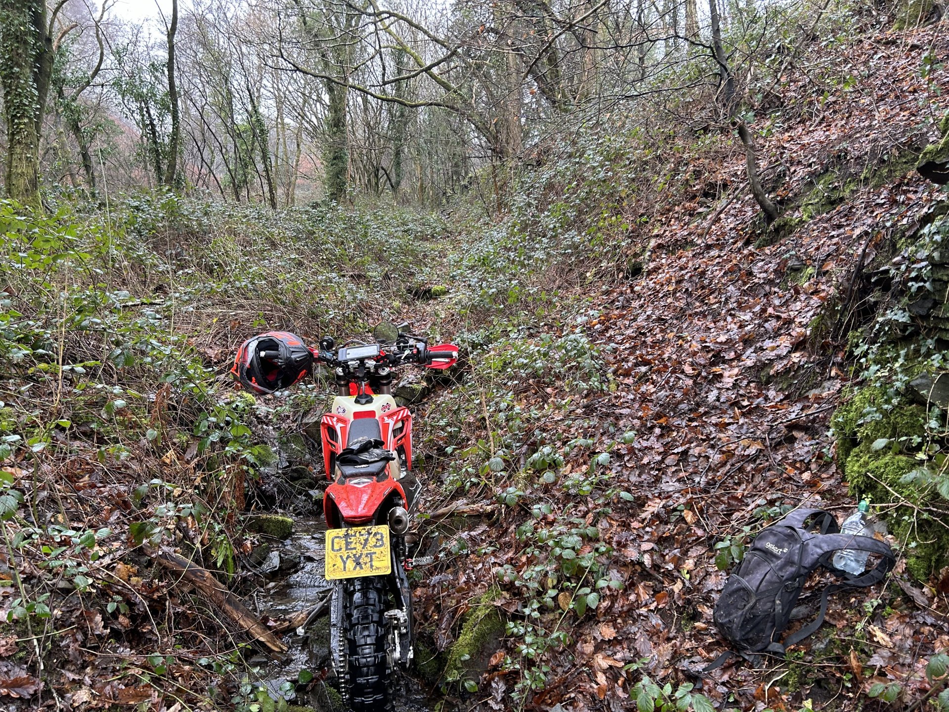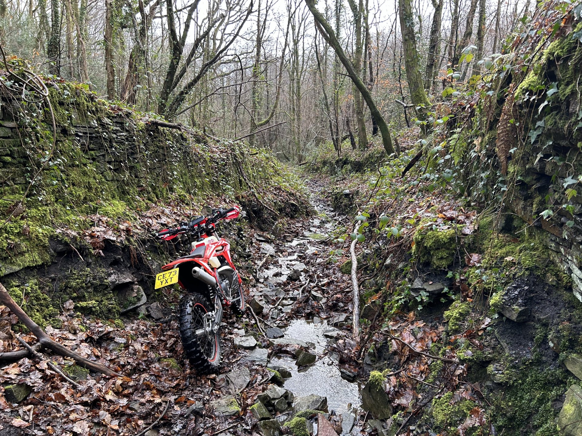 It was raining today so i decided to check on the new lane we got opened as the locals have been kicking off and there would be nobody about, The TRF were clearing it last Thursday so i thought i'd ride down it and then back up not to rub the locals noses in it at the bottom. Going down was hard going mainly because i didn't have the confidence to just let the bike go over the slippery rocks When i got to the bottom i decided fuck going back up as going down had worn me out and proceeded to the exit but found the locals have got the council to put the barrier back up and it was locked. I had no option but to go back up surprisingly the bike found loads of grip on what was the slippery rocks coming down and it was only my poor fitness that was holding me back. I had to stop here for a rest from there up it started getting hard And stopped here for my second heard attack i think i lost my soul in that washout After i got out i decided to head home i was going to be out for a few more hours but i was fucked, i think i really need to do something about my fitness or lack of it