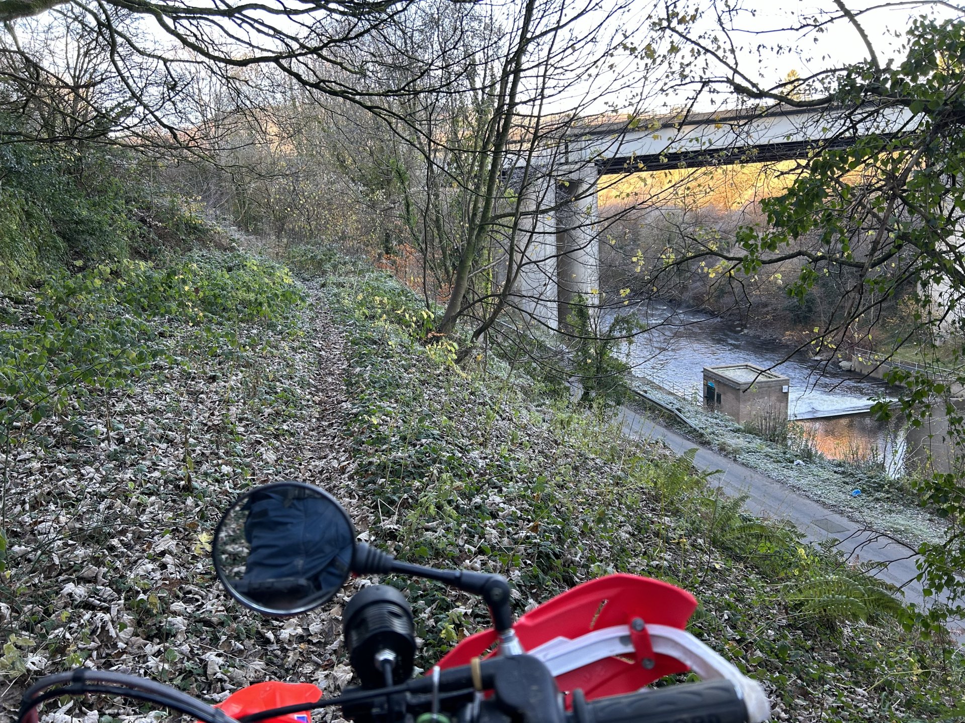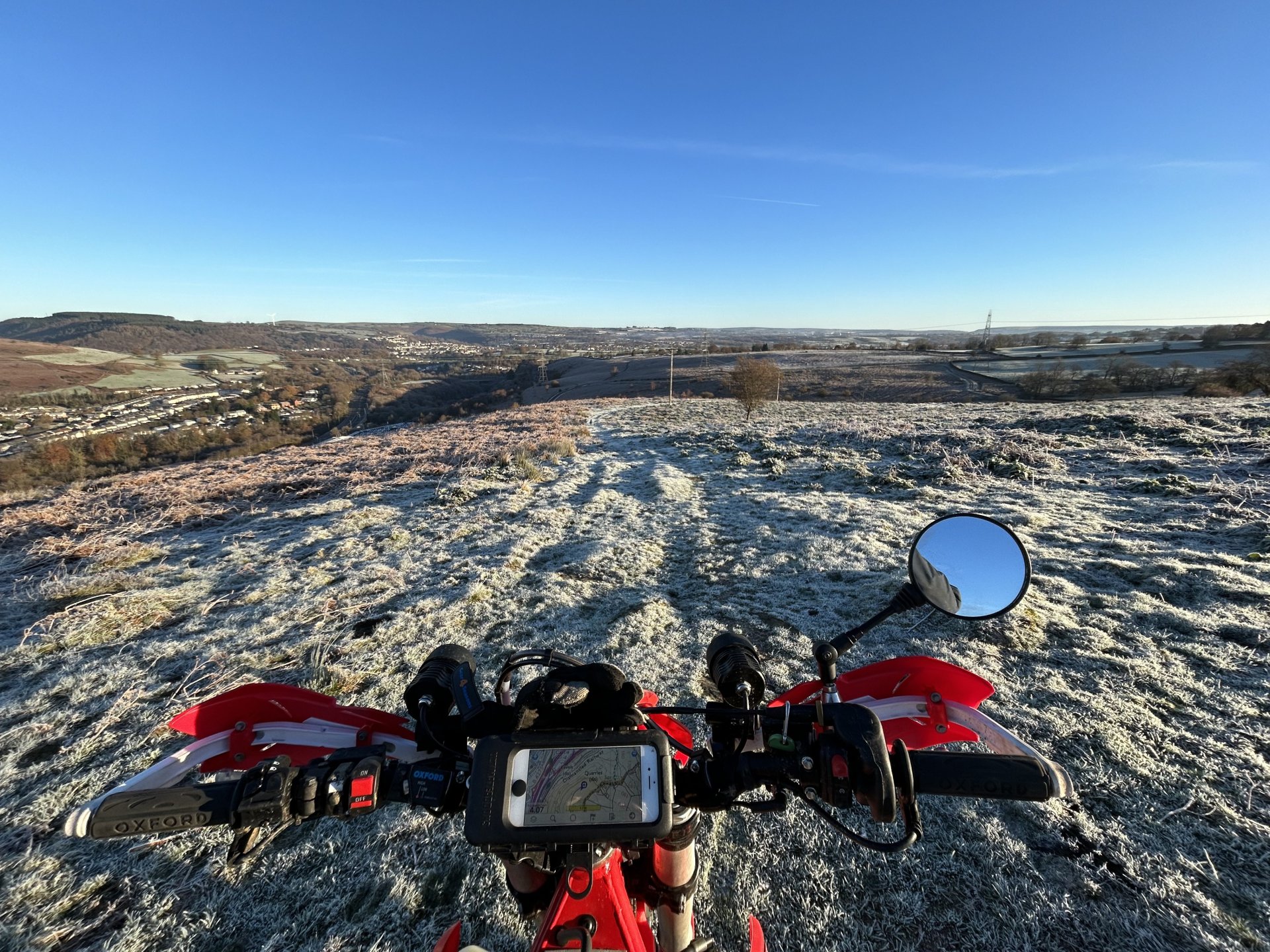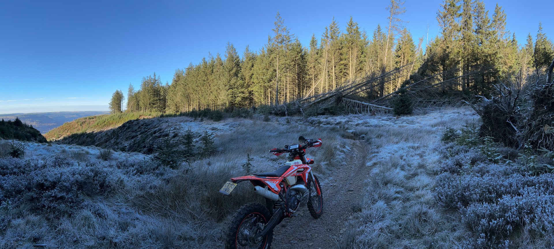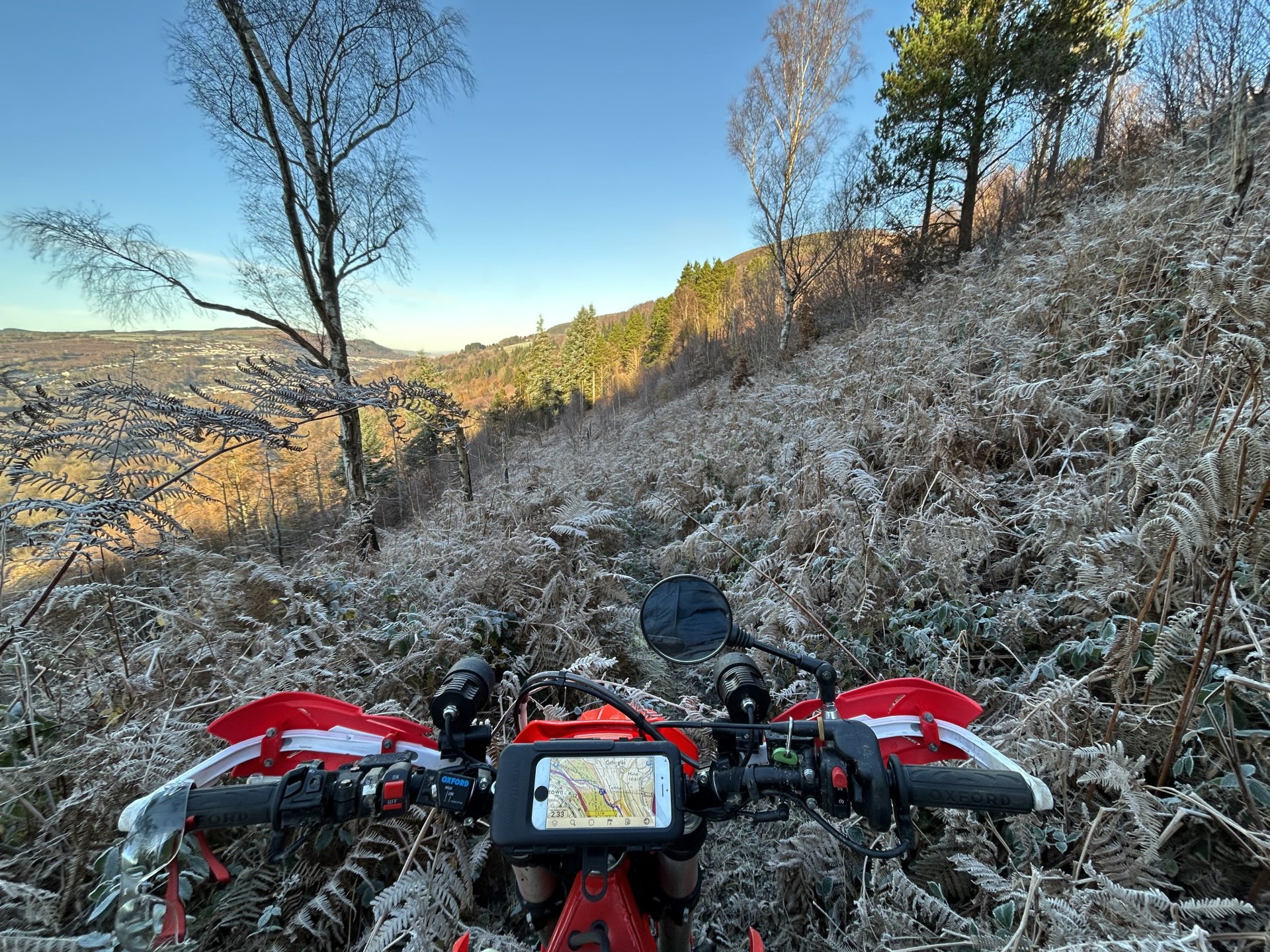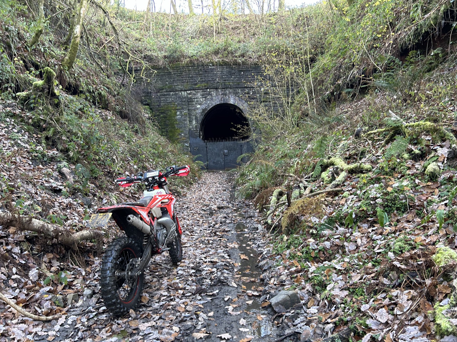 19. In this case the BOAT is a Byway Open to All Traffic, It seems that Merthyr council have been sly dogs and not put one of the byways on the map and nobody knows it exists, that was until they had a sly meeting where they have proposed closing it which meant they had to put it on their page for the public to see and luckily somebody spotted it, so the plan today was to ride up to it and ride it while it's still legal which is a bit ironic because everywhere i rode to get to it isn't legal LOL. Anywho set out around 08:00 this morning, it was quite frosty and was -1.5c but with clear blue sky's and very sunny. I had around 3 miles of road riding before i got off road and after the first mile i was already thinking about turning back to put warmer gear on the heated grips were working overtime trying to keep my hands warm inside my summer enduro gloves but i stuck it out because temperature is a different story when you hit the dirt This is the mountain where i spotted that tetradactyl before LOL This was one of the legal lanes, it felt a bit exposed to the right now that everything is dying back for the winter, the bridge carries the A470, Merthyr to the right and Cardiff to the left I ride up past my parents house and onto trials of my past heading down towards the old Cefn Glas railway tunnel as i have done many times before Further on i have to cut through the forestry to avoid a deep mud hole i didn't fancy riding though it on my own and risk getting stuck, the cold has gone now and i'm feeling quite warm After the forestry it opens out to this moorland, a stretch of land I've hated riding from the age of 16 as it's riddled with ruts hidden by the long grass its quite slow going picking your way through the ruts although I've seen good riders go through here like it's tarmac Back into the forestry and its still frosty in the shade all the water from here on is frozen typical Merthyr weather I end up taking a detour due to get around fallen trees and end up having to negotiate this, something i wasn't comfortable doing on my own and as usual it doesn't look that steep in the photos but believe me it was and i'm now steaming hot and sweaty This is the last time you see my mirror There's a steeper short drop off onto the forest road and i decide to walk the bike down to be safe but i loose my footing when the front wheel drops off the short step and i end up falling down the bank taking my mirror with me when i go back up for the bike it's also taken the Radiator Shroud off where it dragged on the bank knew i should have just ridden down doh! From here there was lots more mud and fallen trees to negotiate and eventually i got onto the Byway i was looking for. The start was nice and easy so i could catch my breath and cool down heading into the sun now An nice drop down into a gully and back up. the trail goes sharp left up to the top left corner of the photo and was similar dropping down to where i am Back on some easy stuff About halfway along i get lost, there's trails going off in all directions and i end up by the Abernant railway tunnel it goes from Merthyr to Abredare and theres rumours their going to reopen it for walking and cycling This is a photo of the inside from stolen from on line, i would have loved to have got in there again its just under a mile and a half long. I went through there on a Honda 400 superdream when i was 17 years old but it's all locked up now with a thick layer of grease on the gates to deter anyone climbing over One of the fallen trees to get over there were quite a few like this on route no real problem for the mighty Beta And this would take me into Bike Park Wales mountain bike center, the fallen leaves from ere on hid lots of slippery rock which got me all hot and sweaty again A bit more road work to get my onto Heol Cymro which is a half mile steep climb covered in loose rock made worse today by the low sun flickering through the trees blinding me From here it was a gentle ride over my mountain to the petrol station for a wash before home You can clearly not see my missing rad shroud here Another good day's riding lit the fire when i got in so it's all toastie in here and i'm now sinking a few pints of Skippy piss chilling out