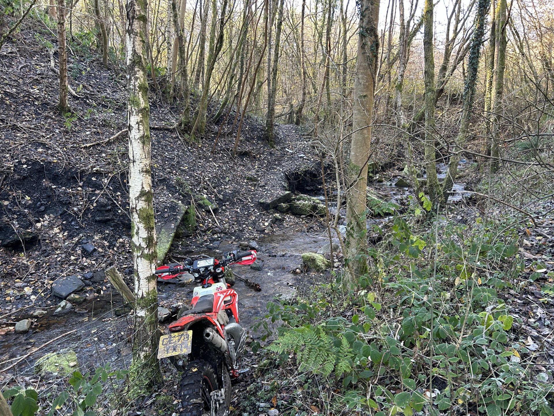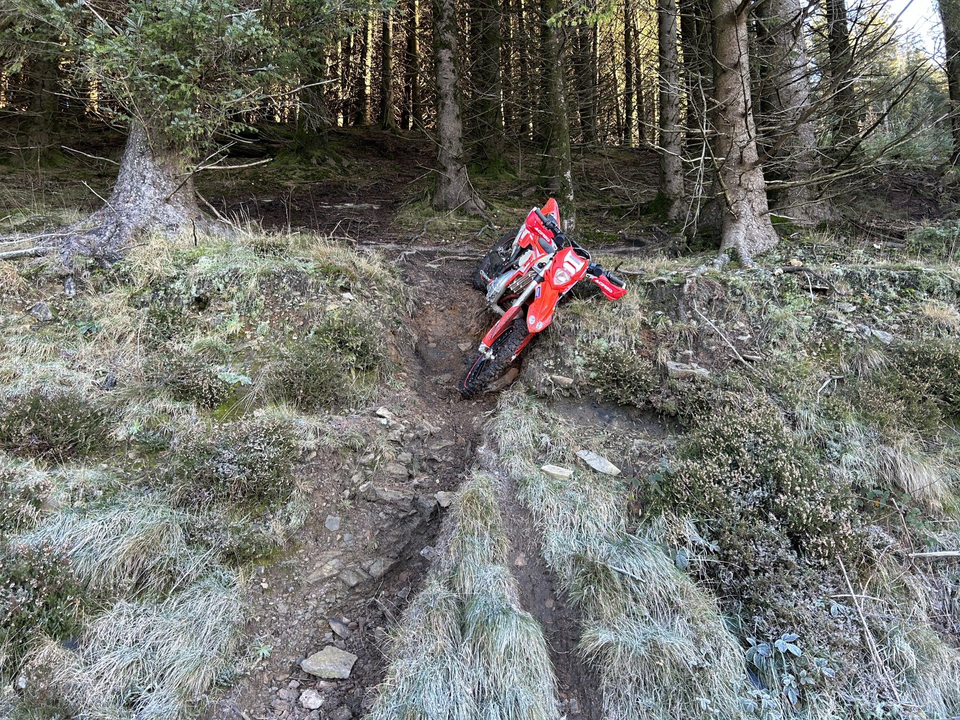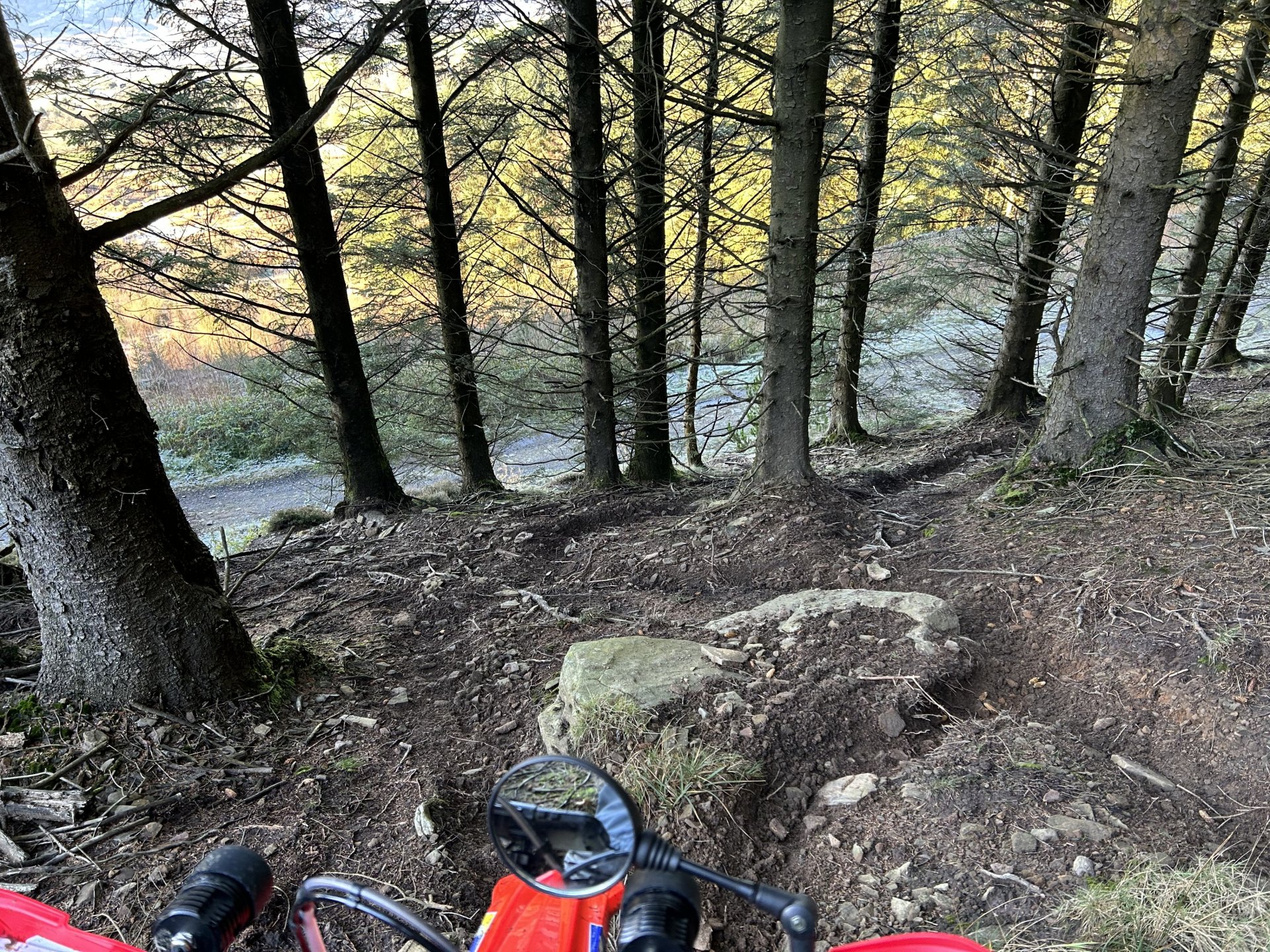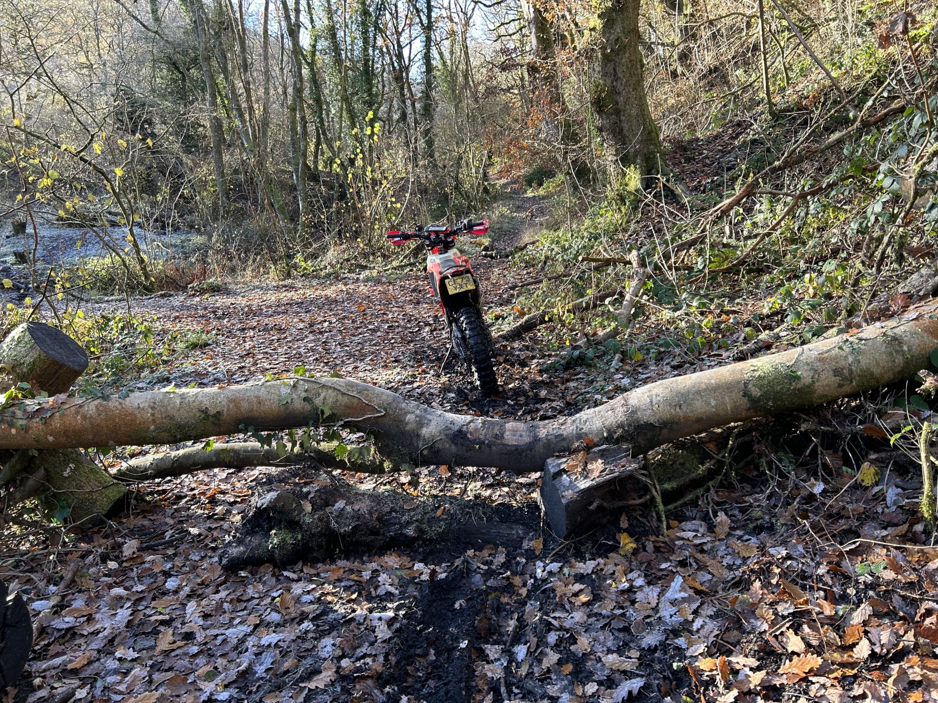 19. In this case the BOAT is a Byway Open to All Traffic, It seems that Merthyr council have been sly dogs and not put one of the byways on the map and nobody knows it exists, that was until they had a sly meeting where they have proposed closing it which meant they had to put it on their page for the public to see and luckily somebody spotted it, so the plan today was to ride up to it and ride it while it's still legal which is a bit ironic because everywhere i rode to get to it isn't legal LOL. Anywho set out around 08:00 this morning, it was quite frosty and was -1.5c but with clear blue sky's and very sunny. I had around 3 miles of road riding before i got off road and after the first mile i was already thinking about turning back to put warmer gear on the heated grips were working overtime trying to keep my hands warm inside my summer enduro gloves but i stuck it out because temperature is a different story when you hit the dirt This is the mountain where i spotted that tetradactyl before LOL This was one of the legal lanes, it felt a bit exposed to the right now that everything is dying back for the winter, the bridge carries the A470, Merthyr to the right and Cardiff to the left I ride up past my parents house and onto trials of my past heading down towards the old Cefn Glas railway tunnel as i have done many times before Further on i have to cut through the forestry to avoid a deep mud hole i didn't fancy riding though it on my own and risk getting stuck, the cold has gone now and i'm feeling quite warm After the forestry it opens out to this moorland, a stretch of land I've hated riding from the age of 16 as it's riddled with ruts hidden by the long grass its quite slow going picking your way through the ruts although I've seen good riders go through here like it's tarmac Back into the forestry and its still frosty in the shade all the water from here on is frozen typical Merthyr weather I end up taking a detour due to get around fallen trees and end up having to negotiate this, something i wasn't comfortable doing on my own and as usual it doesn't look that steep in the photos but believe me it was and i'm now steaming hot and sweaty This is the last time you see my mirror There's a steeper short drop off onto the forest road and i decide to walk the bike down to be safe but i loose my footing when the front wheel drops off the short step and i end up falling down the bank taking my mirror with me when i go back up for the bike it's also taken the Radiator Shroud off where it dragged on the bank knew i should have just ridden down doh! From here there was lots more mud and fallen trees to negotiate and eventually i got onto the Byway i was looking for. The start was nice and easy so i could catch my breath and cool down heading into the sun now An nice drop down into a gully and back up. the trail goes sharp left up to the top left corner of the photo and was similar dropping down to where i am Back on some easy stuff About halfway along i get lost, there's trails going off in all directions and i end up by the Abernant railway tunnel it goes from Merthyr to Abredare and theres rumours their going to reopen it for walking and cycling This is a photo of the inside from stolen from on line, i would have loved to have got in there again its just under a mile and a half long. I went through there on a Honda 400 superdream when i was 17 years old but it's all locked up now with a thick layer of grease on the gates to deter anyone climbing over One of the fallen trees to get over there were quite a few like this on route no real problem for the mighty Beta And this would take me into Bike Park Wales mountain bike center, the fallen leaves from ere on hid lots of slippery rock which got me all hot and sweaty again A bit more road work to get my onto Heol Cymro which is a half mile steep climb covered in loose rock made worse today by the low sun flickering through the trees blinding me From here it was a gentle ride over my mountain to the petrol station for a wash before home You can clearly not see my missing rad shroud here Another good day's riding lit the fire when i got in so it's all toastie in here and i'm now sinking a few pints of Skippy piss chilling out