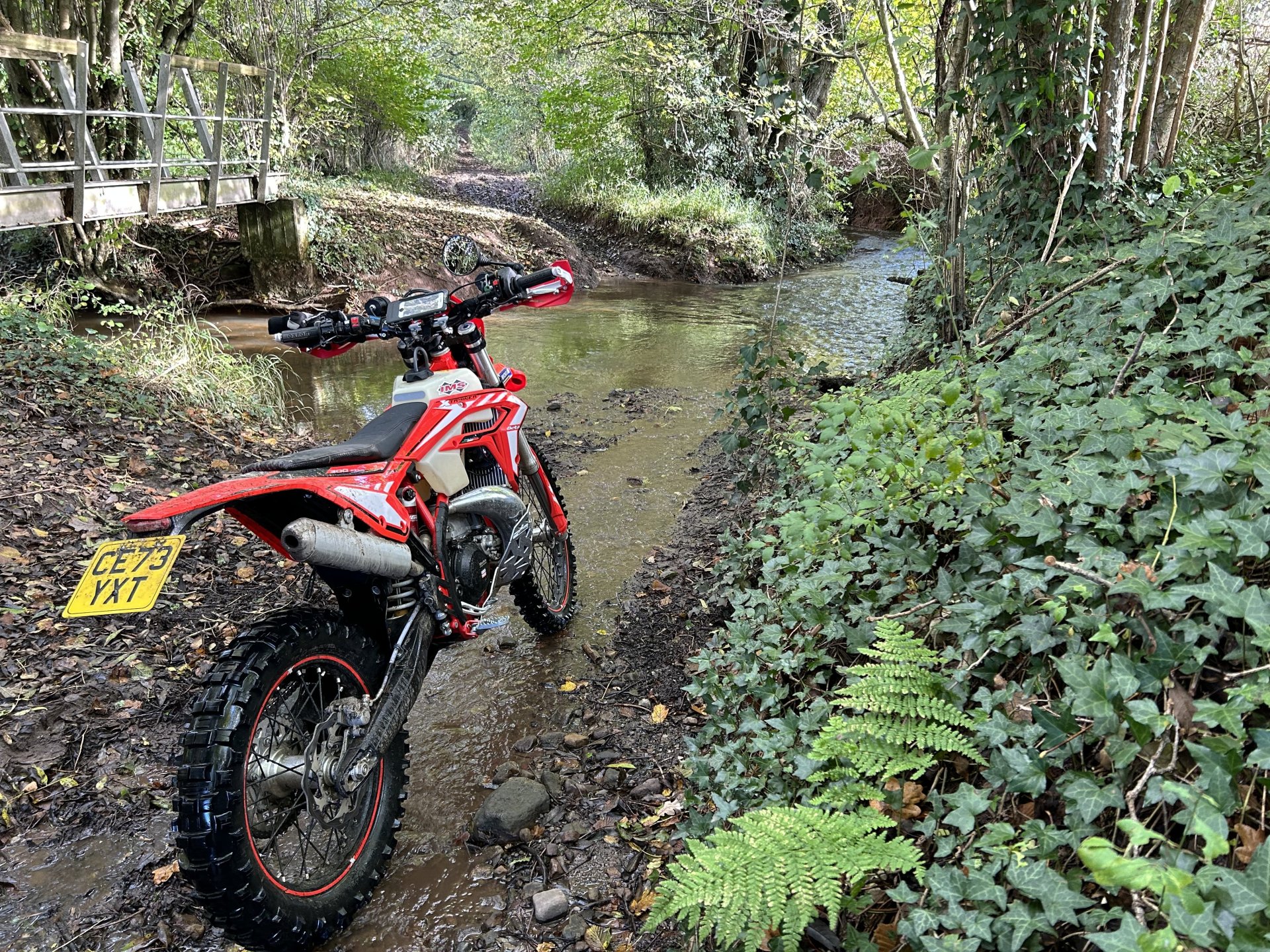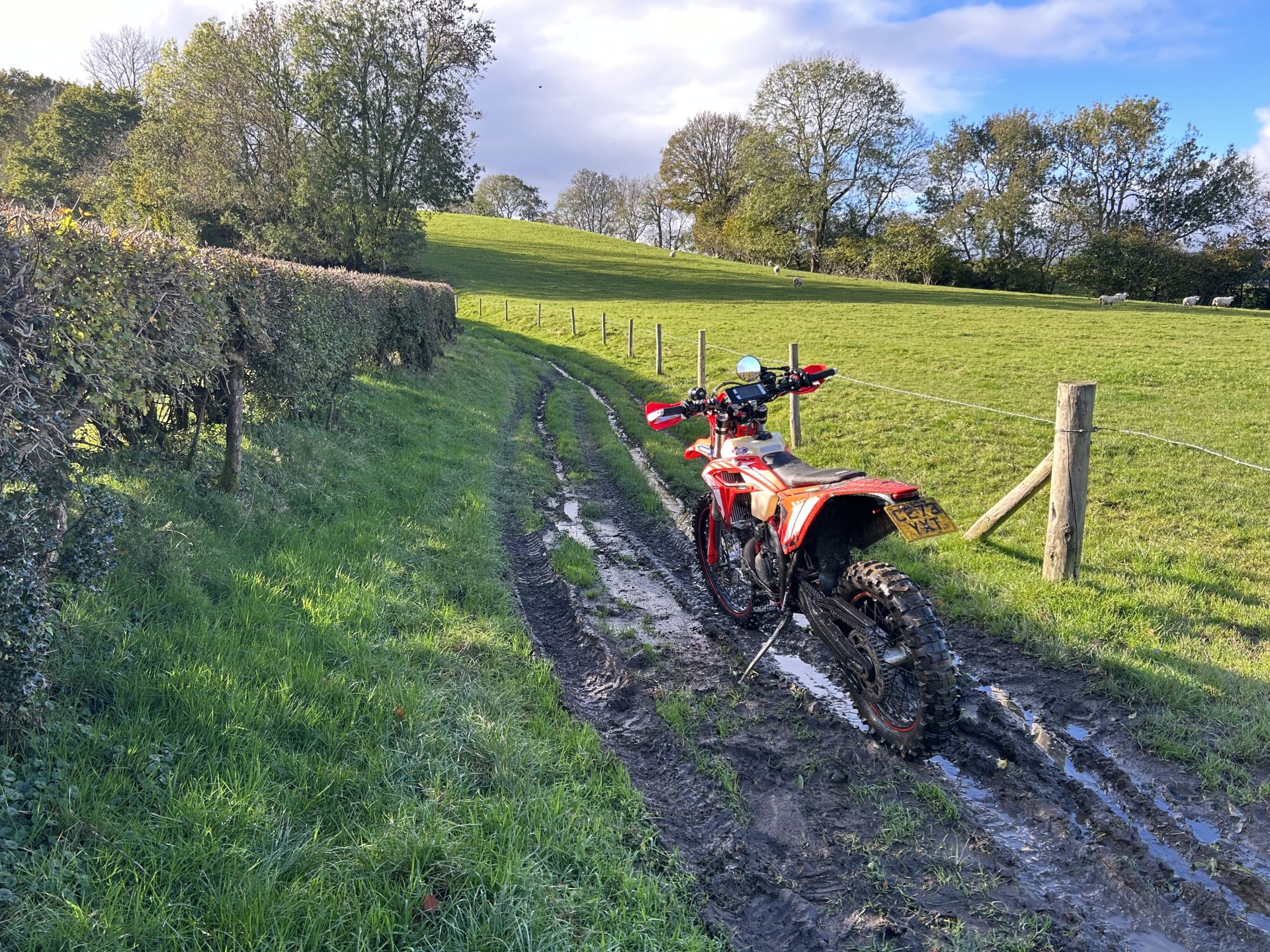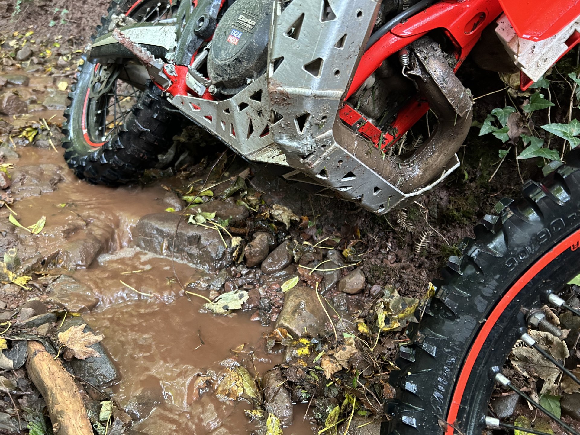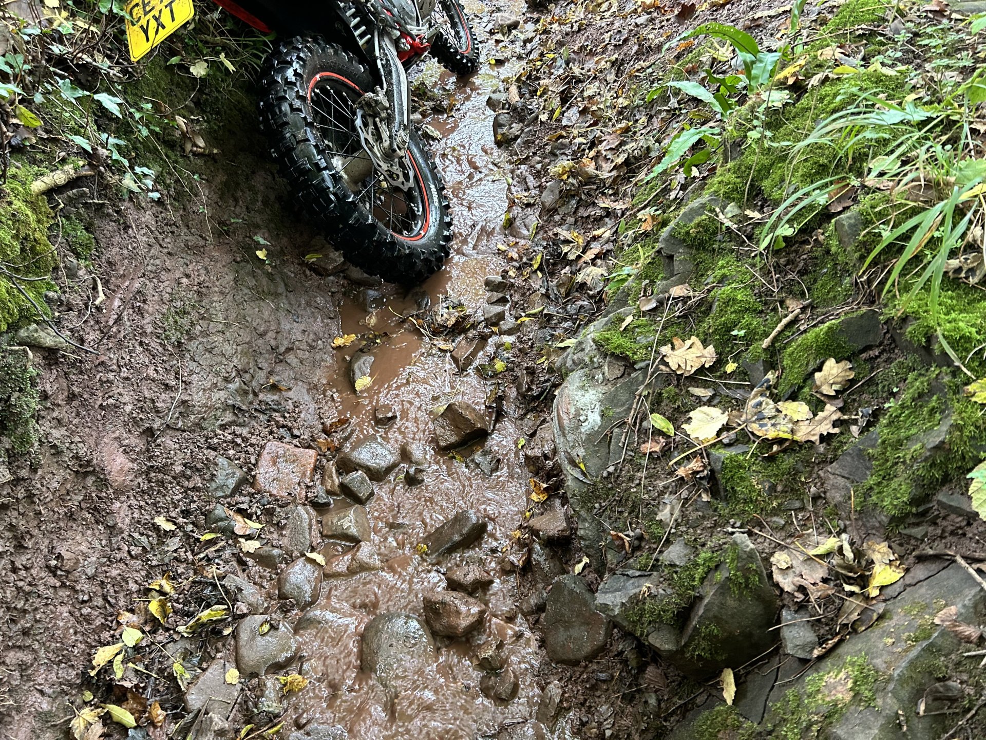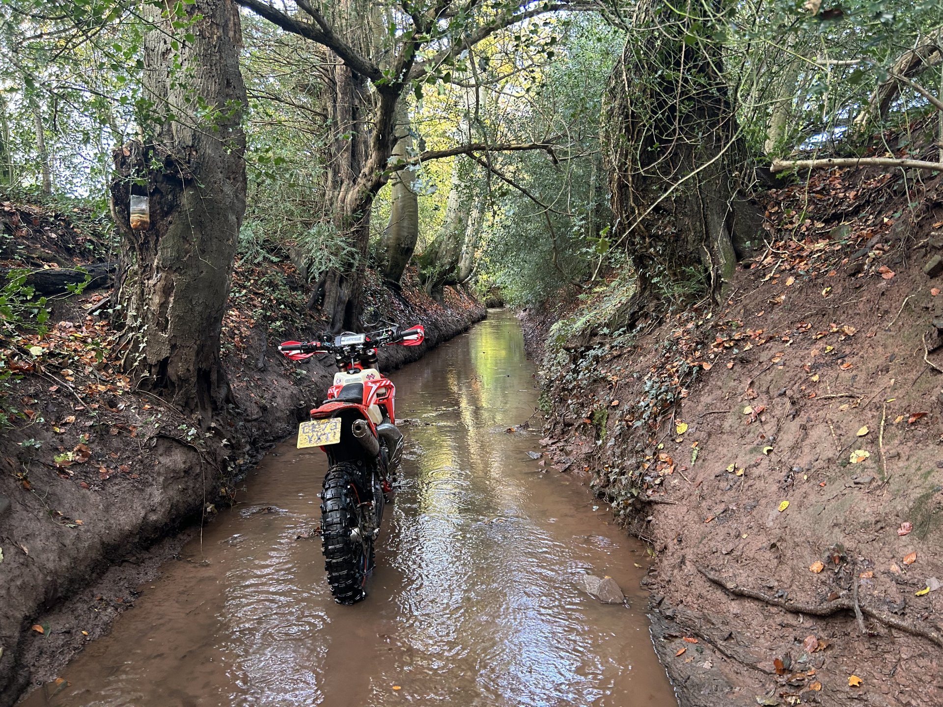 Got out today to try my new seat out ended up the same place as last weekend but with much more time to play with so rode most of the lanes in the area, spent over five hours riding and cannot believe how much difference there is between the stock seat and the seat concepts one, I got home with no monkey butt whatsoever, only regret is i should have gone for the standard height seat instead of the low one there's about 25mm difference between them, the low one is ultra comfy so the standard height one must be like an armchair. Almost every lane had water running along them took some photos of the best of them. The heavens opened in the afternoon but it didn't matter as i was on my way home and everything was soaking anyway. The low sun flickering through the trees and glaring off the water on the roads and trails made riding difficult in places as i couldn't see where i was going, Thoroughly enjoying the new bike even though its the same it rides different just seems easier to ride. Some wet photos of the day. looking down to where i am in the photo above And this is why i have such a heavy pipe guard gave it a hell of a donk on a rock, pipe would have needed blowing out it it wasn't fitted for sure This was last weekends outing but the same lane ridden today, made sure i missed the rock today