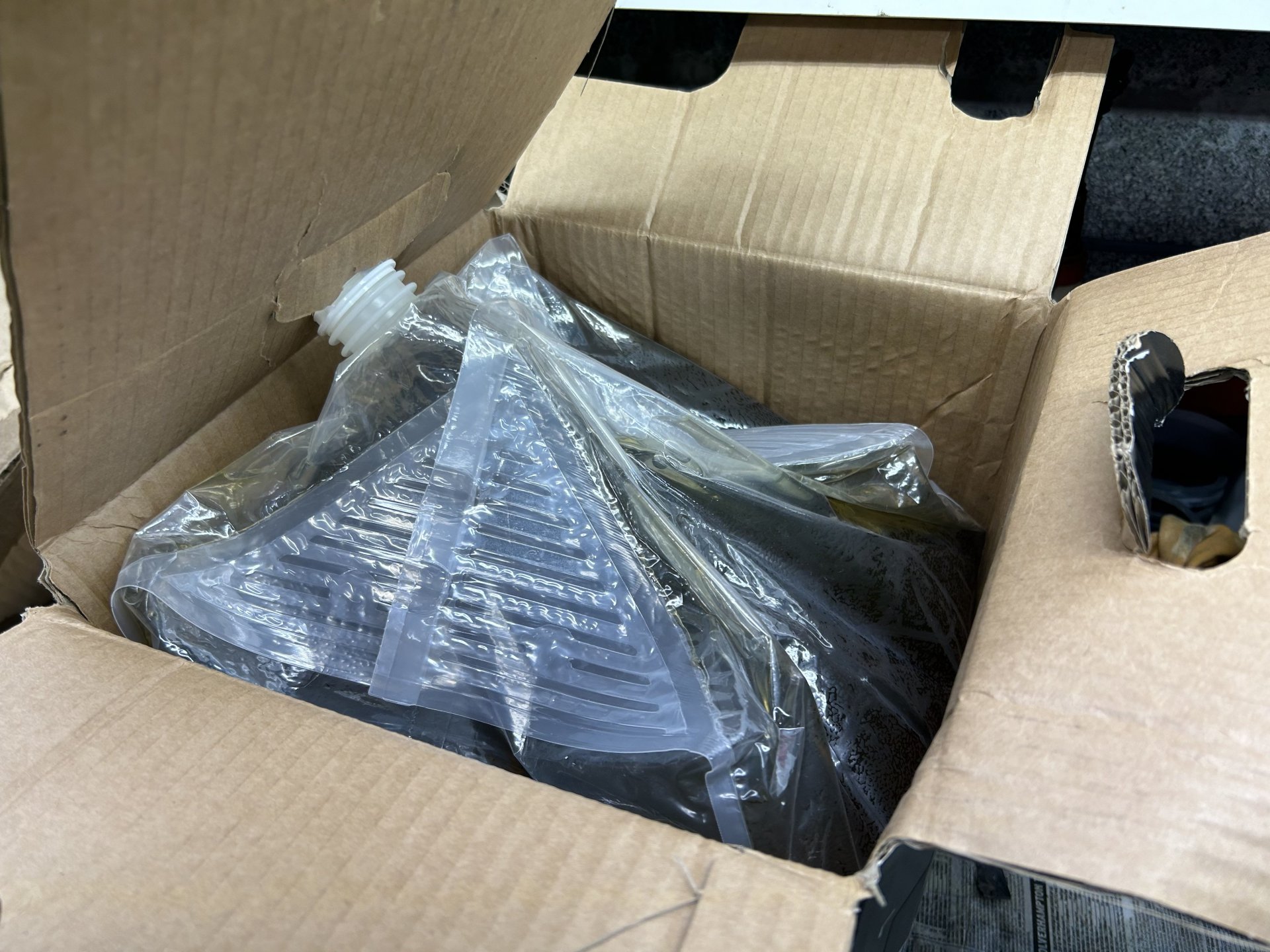 My new box of oil arrived today and had a lucky escape, the delivery guy left it out the garden instead of knocking the door so the box got soaked. I opened the taped up bits with my trusty Stanley knife and found another box inside so opened the top of that with the knife to find a bag of oil in there i was expecting plastic containers lucky i didn't go mad with the knife or i would have had 20L of oil all over the floor not seen it like this before but at just under £6 a litre i'm not complaining All taped back up with the tap pushed through