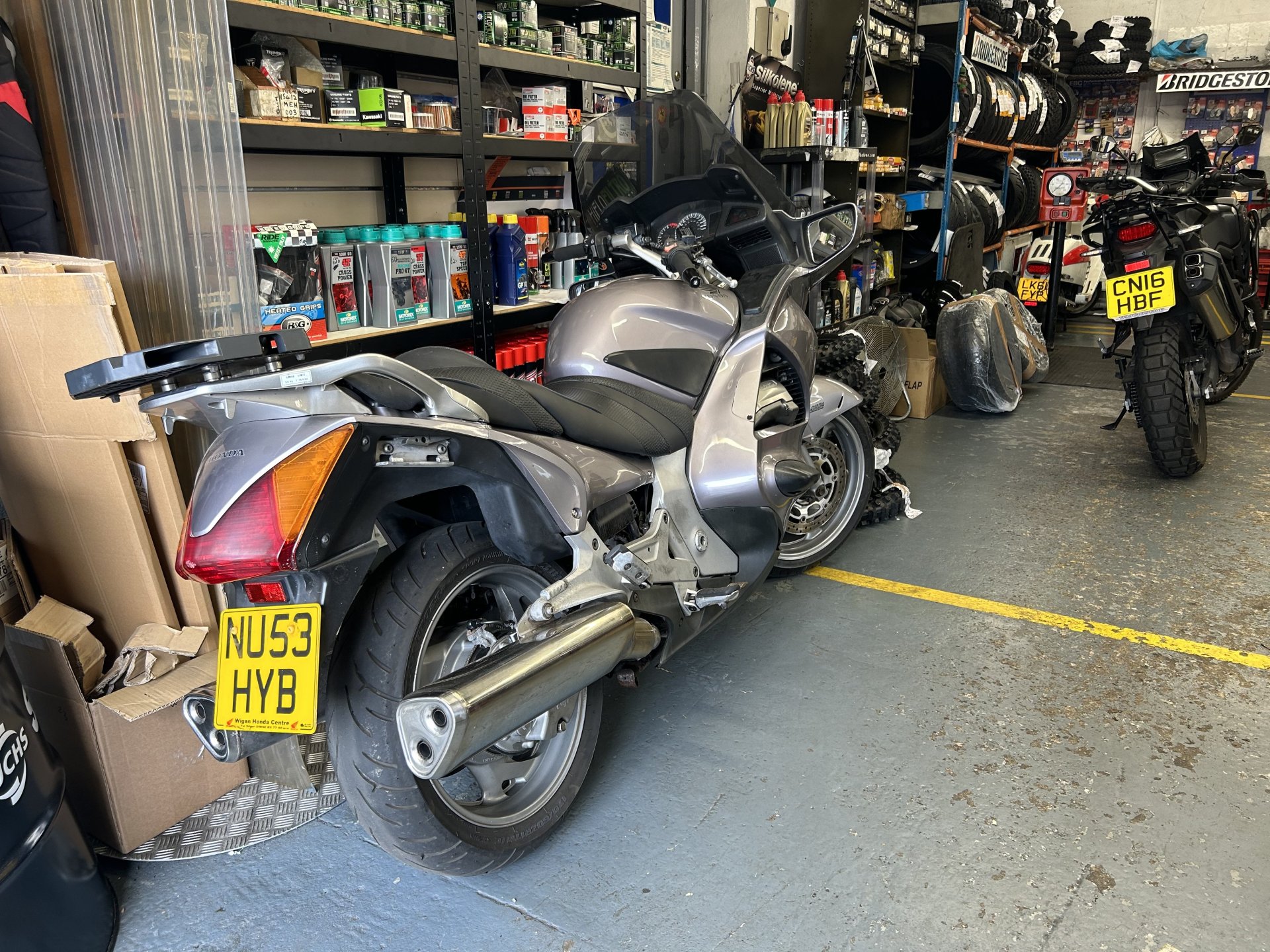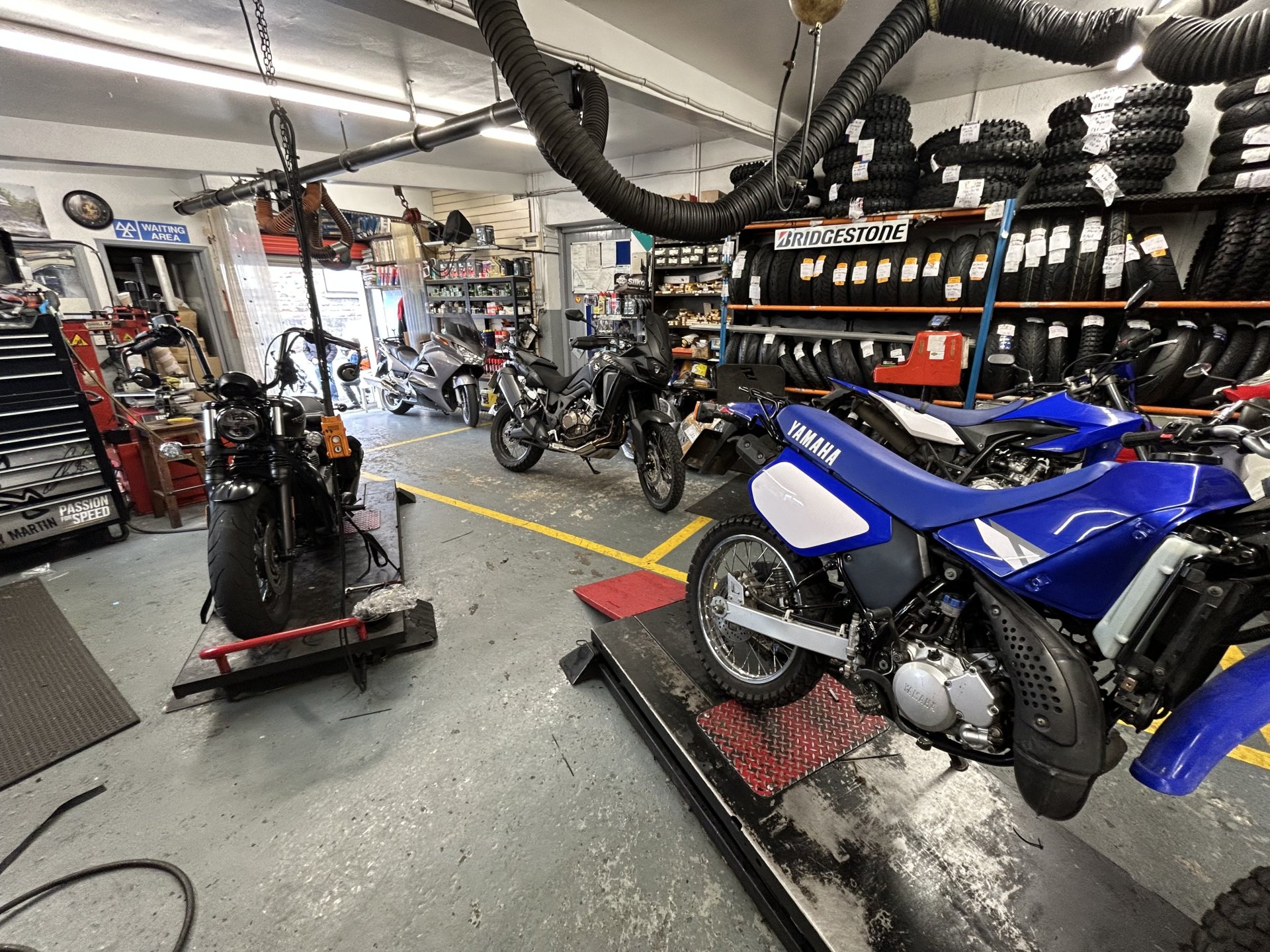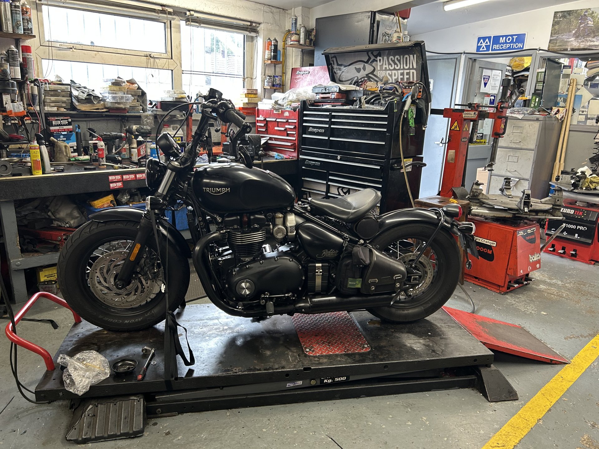 Had the MOT done it's a nice little old school workshop and there's always some old characters hanging around there, the owner Barry was away today so had his side kick go through the bike with a fine tooth comb glad Barry done the MOT on the dog LOL. Something that has just started on the MOT certificates is a notification comes up if there are any recalls that haven't been done on the bike. One came up on mine for a circlip on the center stand i couldn't be arsed to book it in to Honda travel there and back for a £1.50 circlip so never got it done. A few photos from the workshop not much there today