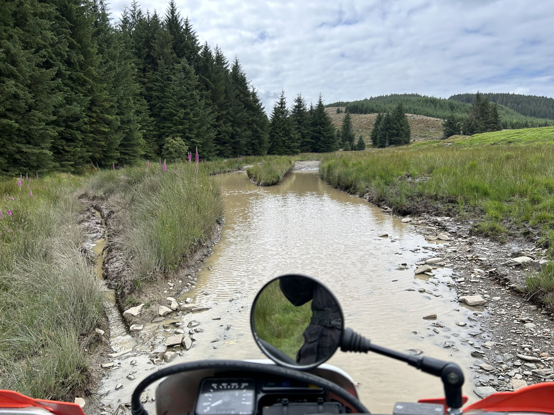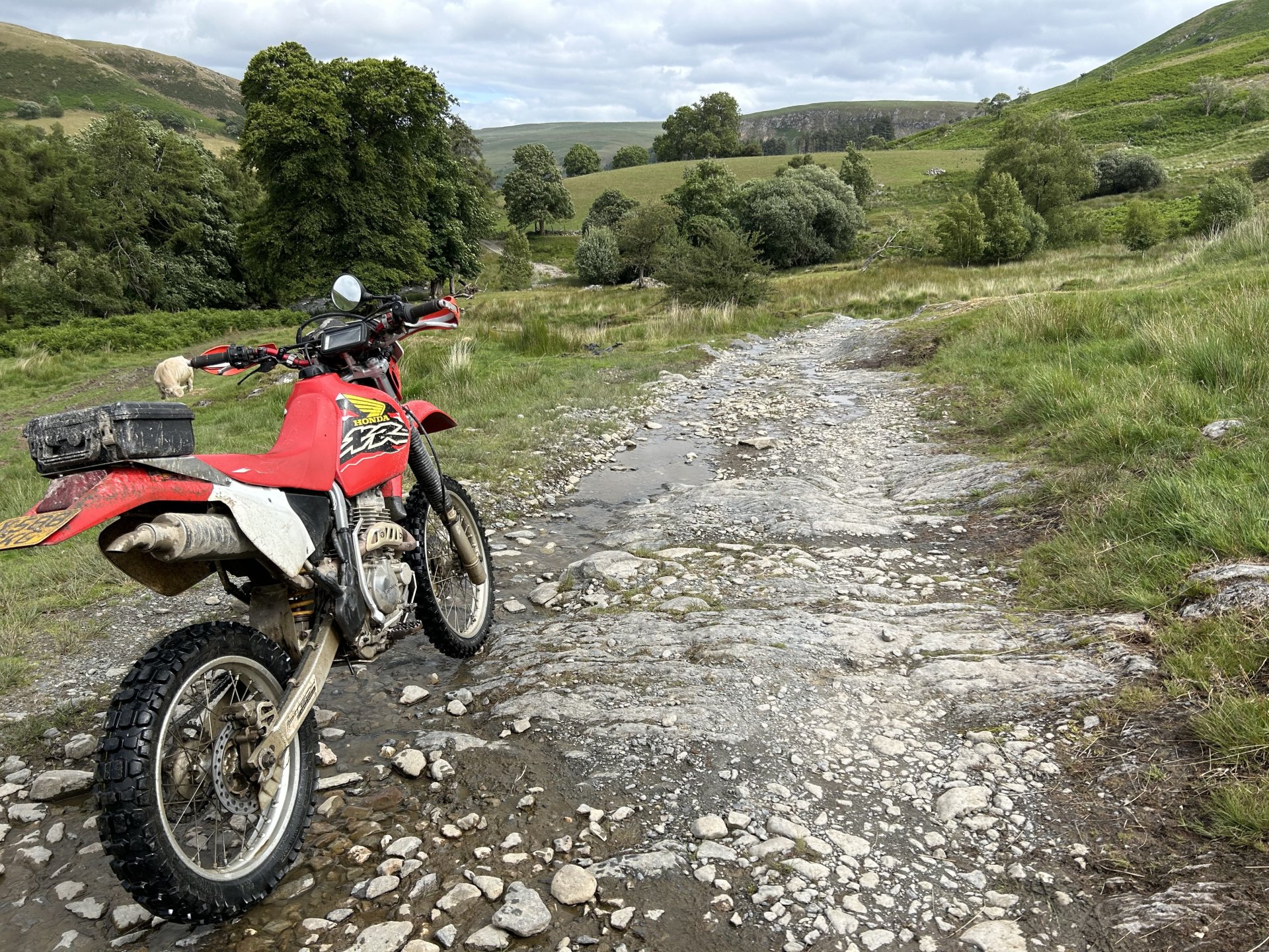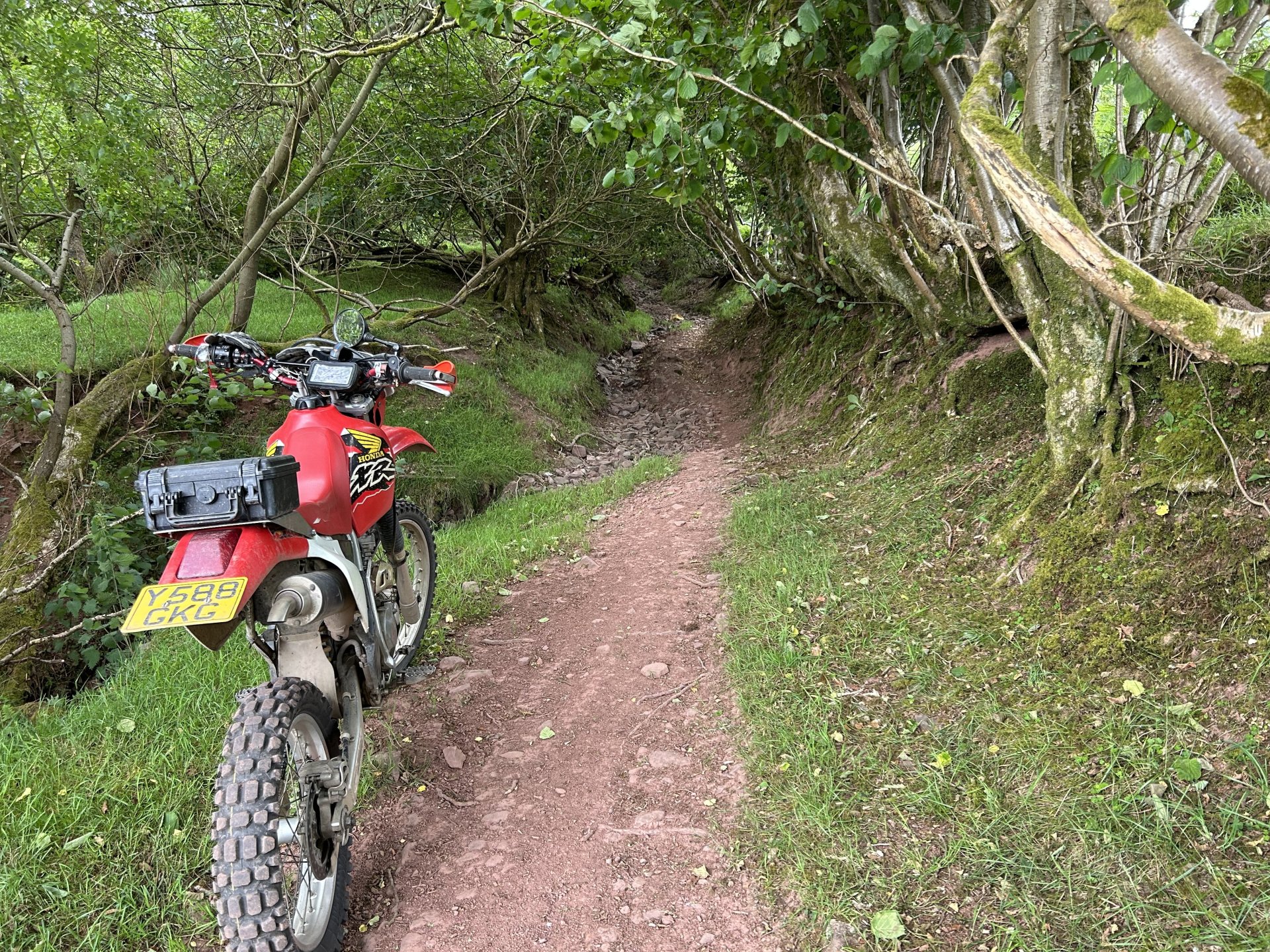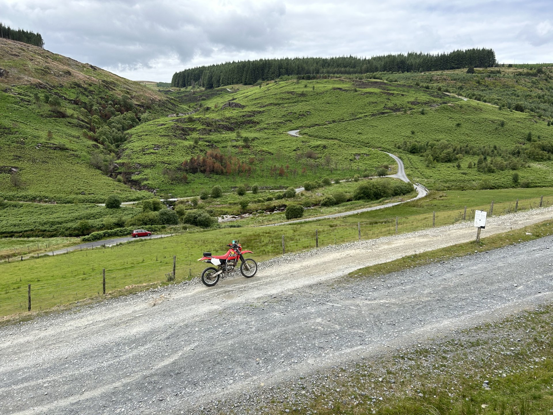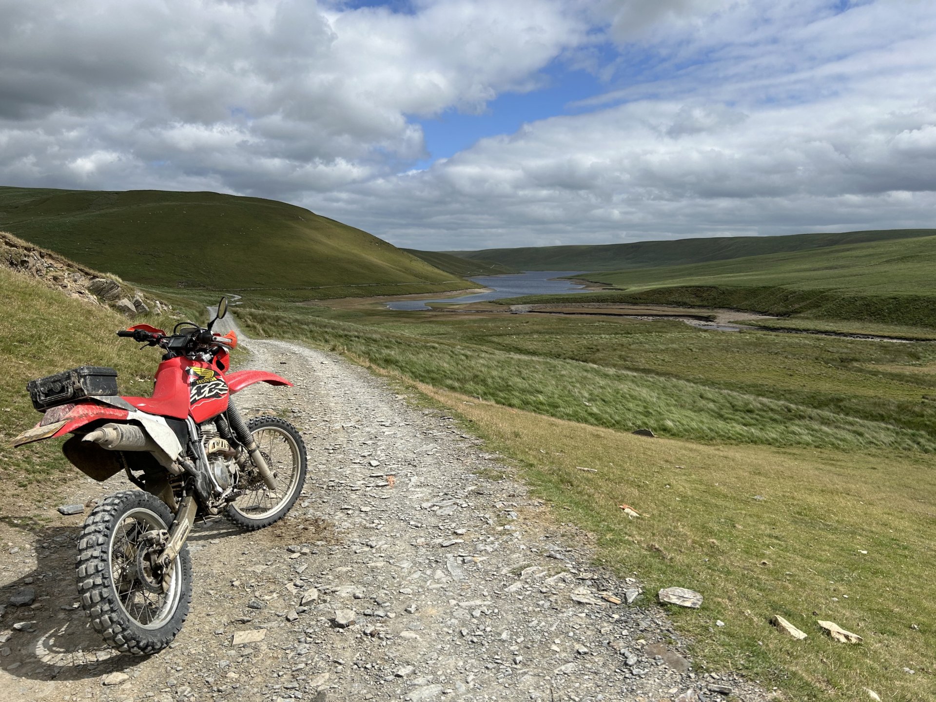 19. Decided to sod the front garden off for today and do my Annual Pilgrimage to Strata Florida Abbey instead. Most of you have seen these places before but if Pete can keep repeating himself them so can i LOL I set off a little late it was 10:30 by the time i was on my way the weather was overcast and cool, i had a nice slow road ride until i hit the road from Ystradfellte to Heol y Senny i always seem to get carried away on that road and it brought me to my first lane of the day where i ended up fixing the gate as it was off its hinges the dopey fucker who fitted it put the bottom hinge upside-down so all the weight is on the top hinge a rough fix it should go in the bodge section but it works fine don't know how long for though. While i was here i found one of those Geocache things it had a £1 coin in there a pack of fag papers and some weed so i nicked the quid and threw the weed i didn't have a pen to sign the register LOL I stopped to open a gate further on and when i turned around the bike was on the floor it had rolled off the stand and ended up breaking the rivet pin on the gear lever so this is what i had been riding with all day it was ok and it didn't make any difference to shifting and i saved the bits before they got lost there's been some tree maintenance on the next lane this was all enclosed, certainly was easier to ride not ducking under low branches Further up it's still overgrown The track goes down to the right in this photo and the easiest way to ride it is straight out into that fecking gate almost pushed my spine out my arsehole when i hit my head on it From here i headed over the firing ranges to Tirabad and through the Crychan Forest onto Cynghordy and this lane which is very wet and mucky though the winter months a lot easier to ride in the dry From here i was onto the Llyn Brianne road another one i seem to speed up on, no photos as the riding was fast and flowing and i didn't want to stop, the top end of Llyn Brianne brings you to the start of Strata Florida in the background is the road to Tregaron another great road When i got back to the bike i spotted a flat fox poor fecker Onto the baptism and there's plenty of water for it the river crossings were straight forward enough it was the puddles that would catch you out when i rode through two of them i knew they were deep because the bike went quiet as i rode though At the furthest point from home here just past Llyn Teifi and onto Claerwen Res Top end of Claerwen Res this kind of track is where the XR excels it is so nice riding it along here. Looking over the dam wall i'm heading for the track on the right of the river But there's another river to cross first i played it safe and swept around to the right straight through almost had me in last time A bit further along after Bobs step A long road ride from here to Talybont on Usk where i headed home over to Trefil and across to Merthyr Talybont Res i'm riding the other way just turned the bike around to take the photo same on the Pontsticill res photo Pontsticill res From here it was over my mountain and home, it was a ride I've needed for a while spent most of it on the pegs because my arse was sore. It was a 172 mile loop. I'm in the middle of changing the oil and filter now ready for the next ride.