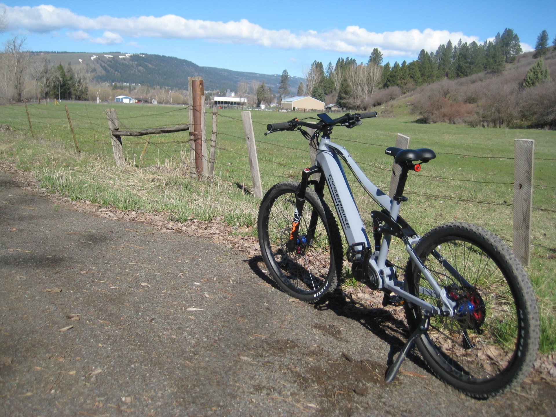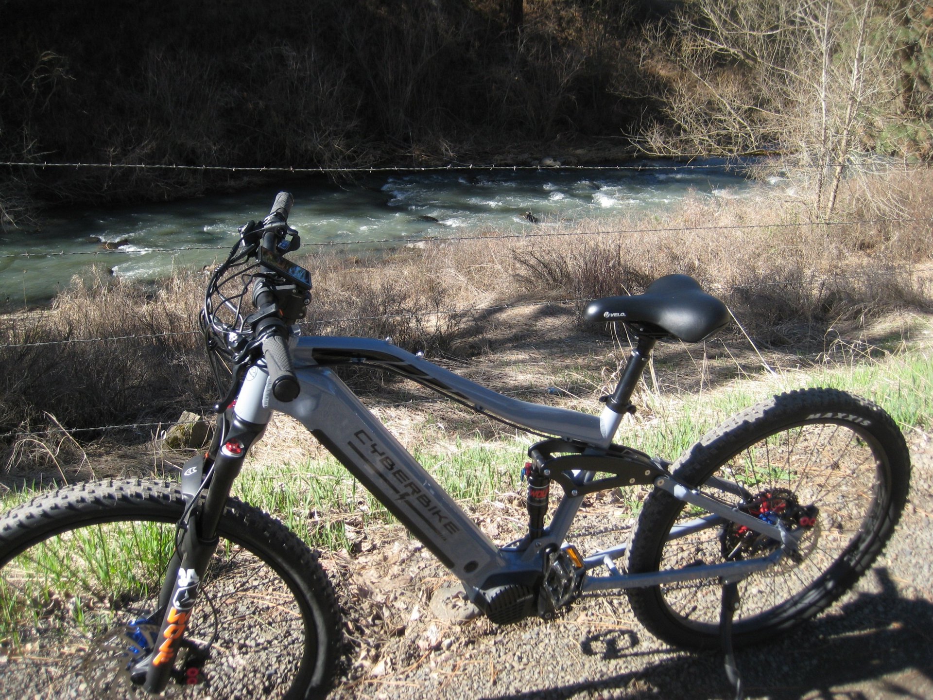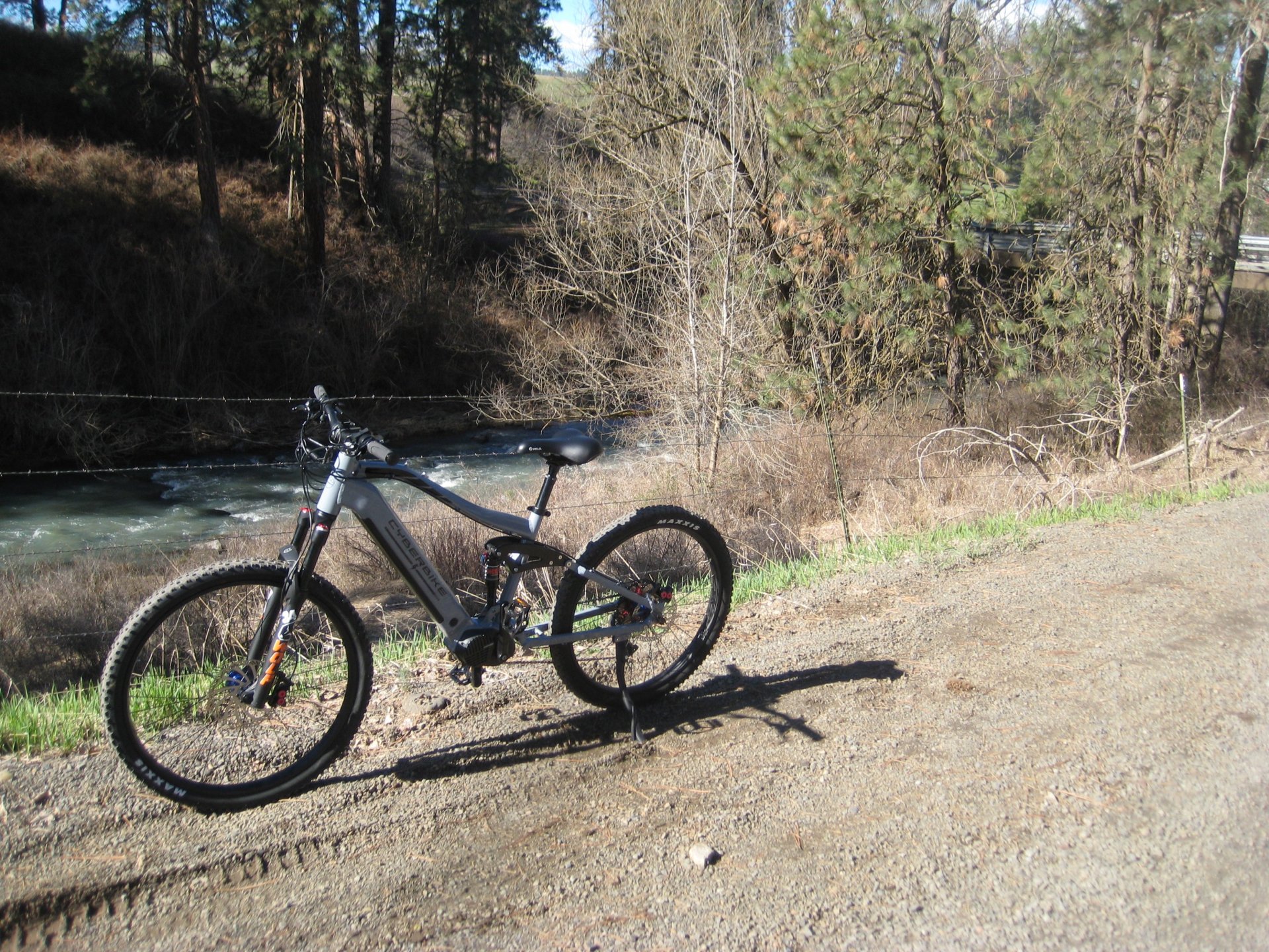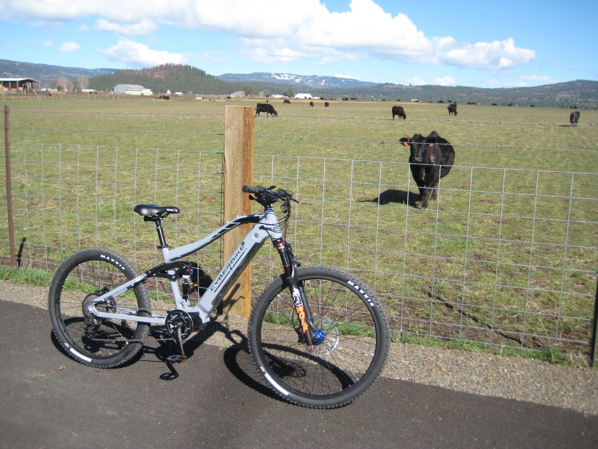 Headed back down towards town....had a stop along Clark creek on the way... Decided to have a closer look @ the Grand Ronde river that runs through an RV park along the way... en route towards that.... River is pretty full from the spring run-off right now.... not to fret there Pete...just remember-- It's NOT your bike!...lol On the way home I rode up north to the end of a new subdivision where there was a field full of dozy cows...1 came over to say Hi...lol Overall, pretty happy with the improved ride quality...but noticed some shifting issues (jumping between 7th & 8th gears)...but the electronic shifter should sort that out.