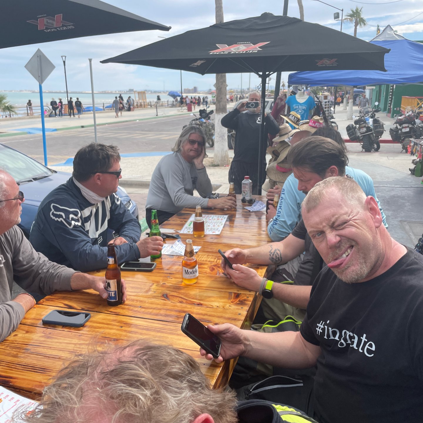 Well, no one died. That's a plus, considering there were 15 of us riding down to get dirty in Baja. Great weather, great friends, and only one "rescue". a good example of the idjits, AKA Agalos, having lunch in San Felipe. Ever seen the commercial where cowboys are herding cats? Well, that is pretty much how these rides go. Fortunately, there is tequila!! Hell, we may even get around to riding bikes....