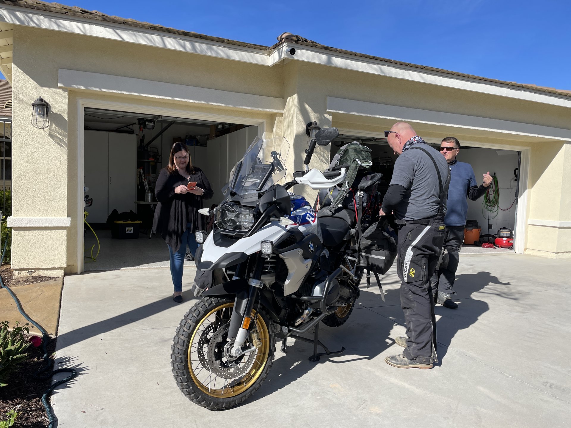 Crude map of the route, just for scale. All told, the trip was about 1800 miles, in 8 days. The goal was to do as much dirt as we could find, and survive. Our last push south was 160 miles of gravel, sand, dirt and rocks. Hence the need for 50 margaritas when we reached Rice and Beans in San Ignacio. Pre-trip: Day 0 With the flyers coming in to Ontario Airport, Gary's house was soon overflowing. This trip started out with a group of about 6-8 riders, but word spread and we peaked at 15. The plan was to meet in Norco Hills, at Gary's, on Friday morning for a shakedown ride (short) south over some great curvy blacktop, finishing up in Tecate. The crossing at Tecate is very low effort, especially compared to the madhouse known as Tijuana. We had a hotel reserved just across the border as I didnt want to hit the newbies with too much the first day. About two thirds of the group had never been south, so they were a little leery. Blame that on the American "news" media, who sell commercial time using sensationalism to the extreme. Rant off. But, first. How to shuffle bikes to Norco. As i was loaning out two of mine, i figured a trailer would be needed. As it turns out, one of our riders from Connecticut arrived in Las Vegas where he was to pickup his own GS from the trucking company, only to find out it hadnt left Philadelphia yet. After the head explosion, I convinced him to take Flames. He rented a car from Vegas and drove to my place. This reduced my headache to just getting one bike south, plus mine, which was accomplished by my brother riding it down. Day 1: At Gary's, the bikes were being packed and prepped. The KTM was ridden down from my place, which meant that Matt hadnt had a chance to pack and prep it. I sold that bike to Gary because i wouldnt take it offroad! Brad Calbert - Skunkwerks Moto. If you are in the midwest and need service on any type of bike, see him. The "cats" before we leave. Damn, thats a lot of bikes!! We headed south over Palomar Mtn, which is a squid staple with all its twisty bits. First flat of the trip honors went to Matt on my KTM. Maybe we could have fixed it quicker if i hadnt left the tool kit out of the bike ? Luckily, we ran in to two guys on KTM's at the top and got the tire fixed. Looked like there was an old tube left in the bike, even tho i had just had new rubber put on. After running the length of Palomar Mountain we stopped at a biker hangout for lunch. We stragglers got there just as the rest of the group was finishing lunch, except Fernando. Fernando was on a Multi-Strada that was making horrendous back fire noises. He finally got it running well enough to head back to San Diego, to drop it off at a shop. The rest of us headed into Baja, just as the sun was setting. Something that always happens, but something we always say we wont do ?