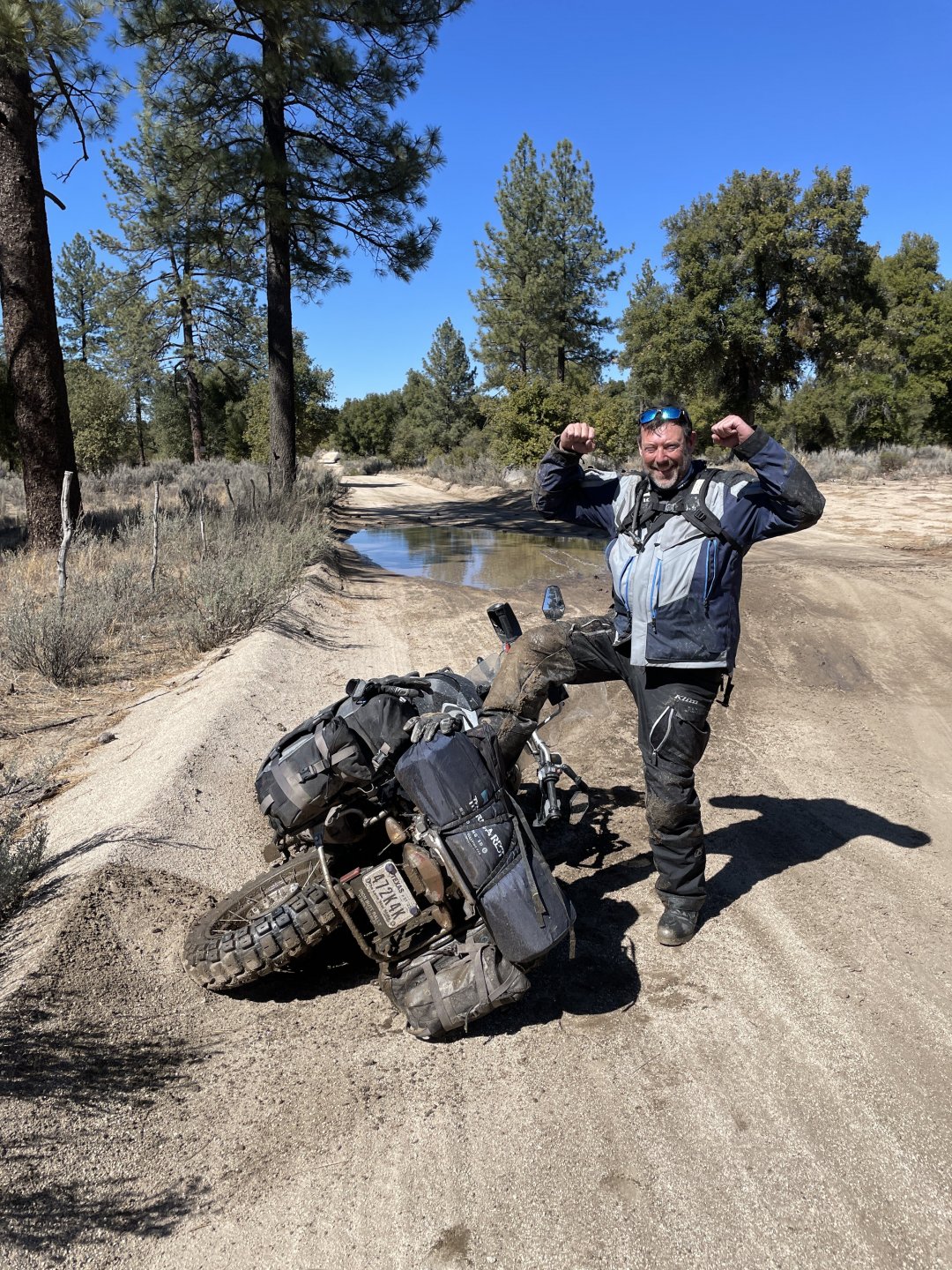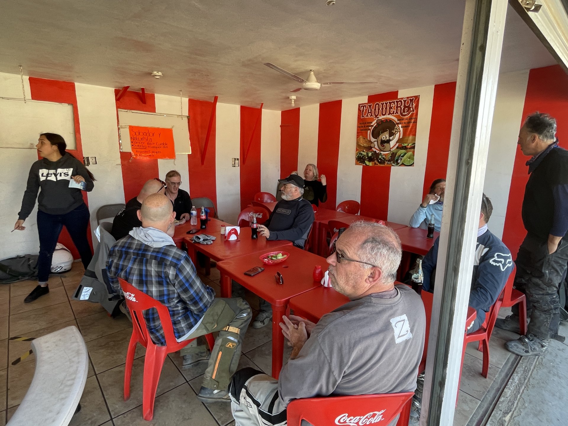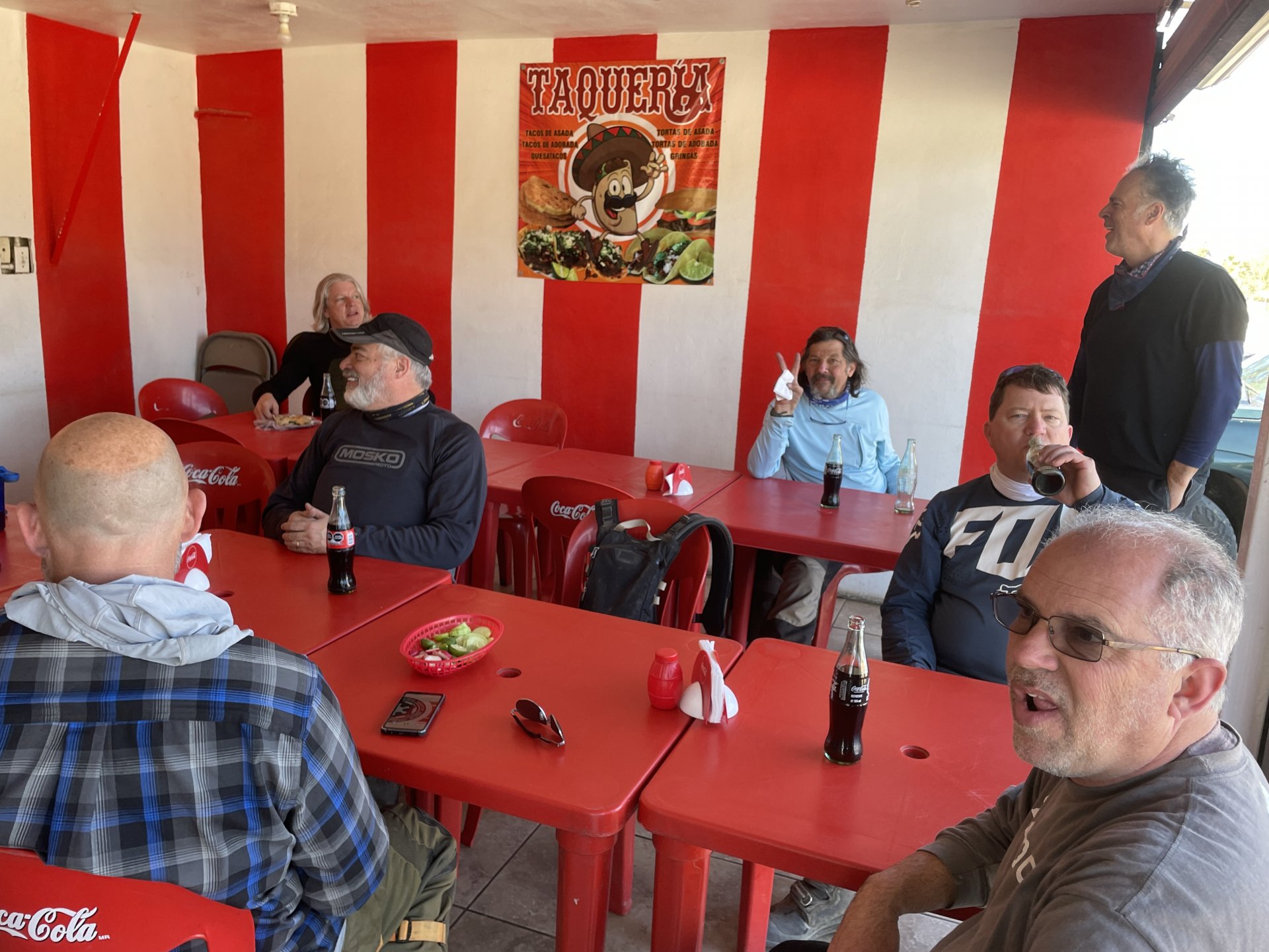 Day 2 - first full day in Mexico. We left Tecate after getting our tourist visas validated (what a cluster!). These may or may not be required, but given how deep into Baja we were headed, we didnt want to chance it. Actually, given that we had so many newbies already freaked out from entering Mexico, i didnt want to add to the angst. The process of validating the visa requires you to hit the immigration office on the Mexican side of the border. Since there is a cost, you have to have the form filled out and then go to the bank kiosk, and then back to Immigration. Or, since it is 2021, you can fill it out online, pay online, and get it emailed to you already approved. Sort of. Remember, its Mexico. So, one would think that doing it all online means it was verified and good. Nope - still have to go to immigration and see the guy. He does his little stampy, stampy thing and then you are out. But, only if you remember to print out both the FMM AND the bank receipt. Which some hadnt. Anyways, an hour later, we were ready to roll east. We turned south of Mexico Hwy 2, in the little town of Luis Echeverria Alvarez, at the beginning of El Compadre Trail. This is a dirt road that runs southerly from Hwy 2, to Hwy 3 by way of Ojos Negros. It isnt a tough dirt road, but can have tough sections depending on the weather. This time thru, we ran into several places with mud puddles and mud, and some little sand. No real incidents, but some fun mud spins. One of our guys was new to offroad, so we were keeping an eye on him. Other than the first mud drop, he appeared to be having a lot of fun in the dirt, until an hour or so in. Crossing one very large water hole, he spun and dumped the bike, tweaking his back a little (found out he has a couple of fused vertebra). An aspirin and he was ready to go again. We finished the trail with a great, late lunch at a little hole in the wall in Ojos Negros. Allen after his big off in the puddle.