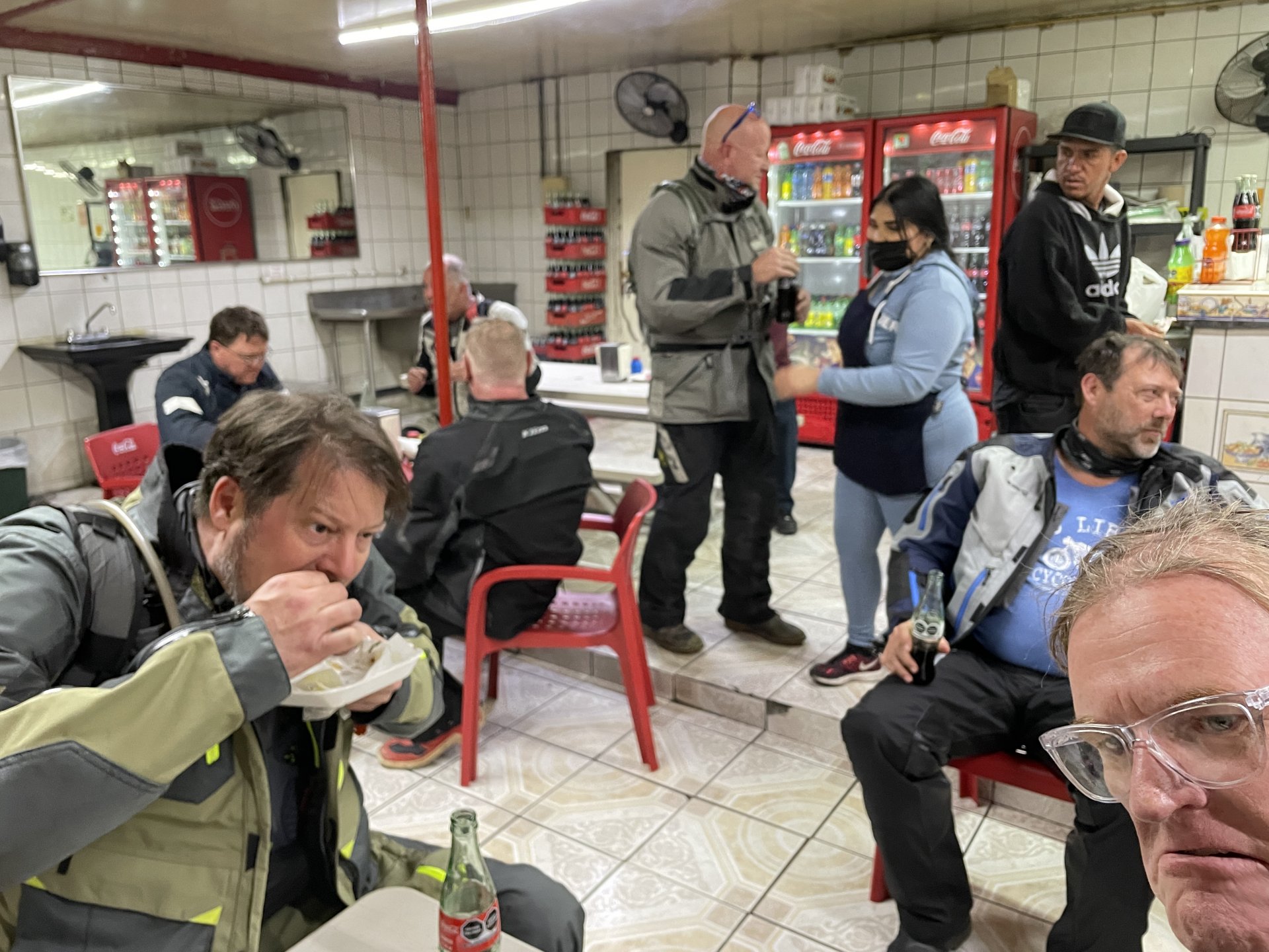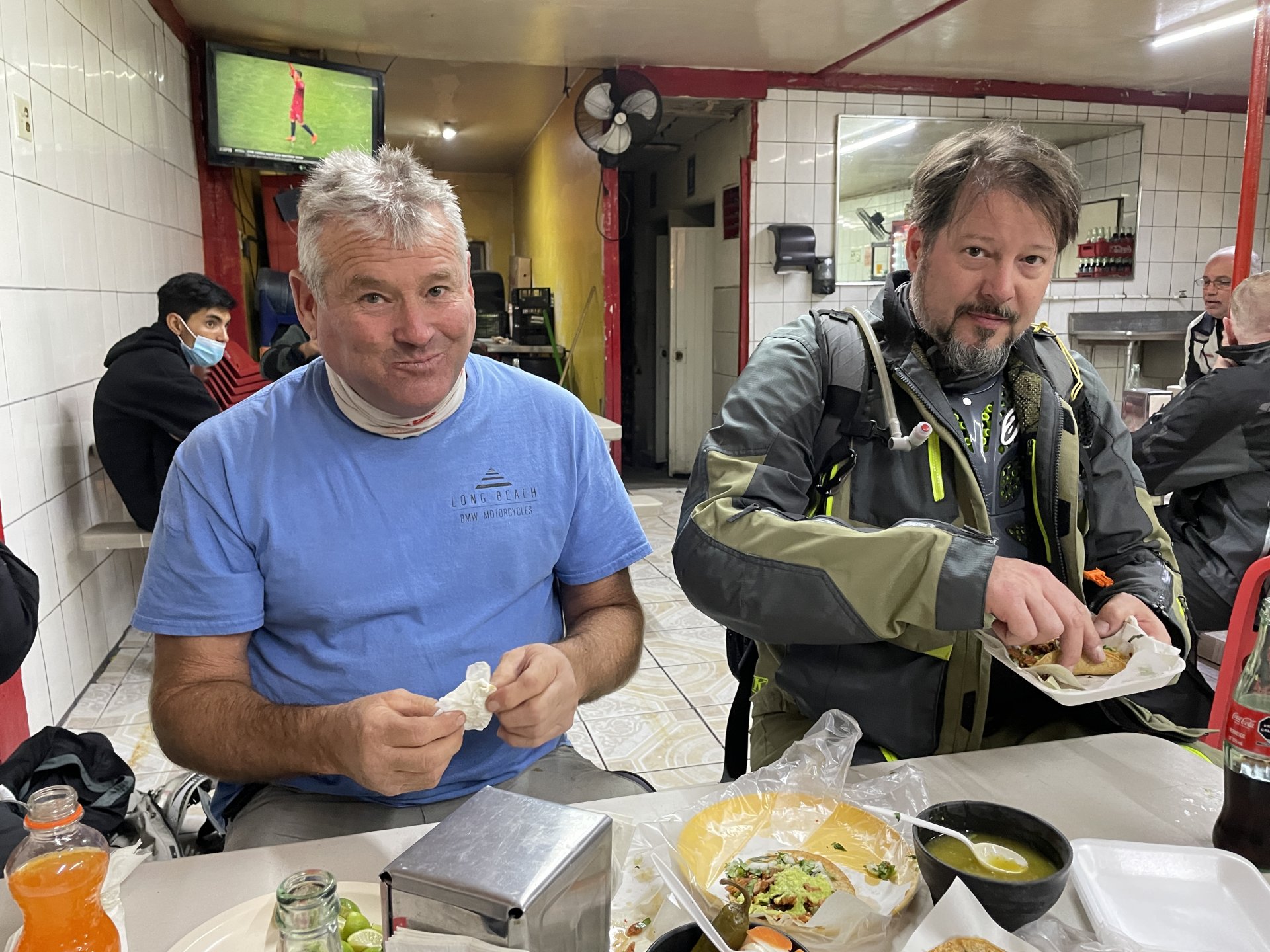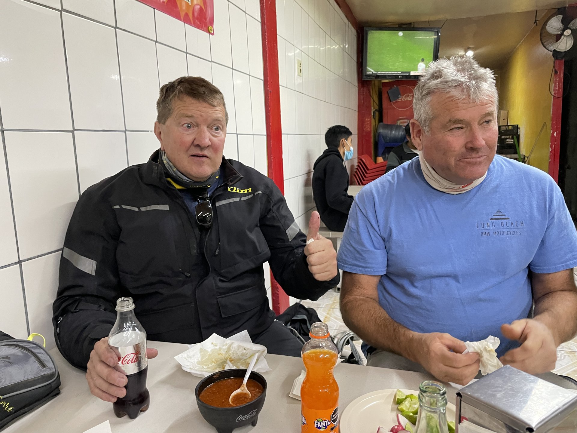 Day 2 - first full day in Mexico. We left Tecate after getting our tourist visas validated (what a cluster!). These may or may not be required, but given how deep into Baja we were headed, we didnt want to chance it. Actually, given that we had so many newbies already freaked out from entering Mexico, i didnt want to add to the angst. The process of validating the visa requires you to hit the immigration office on the Mexican side of the border. Since there is a cost, you have to have the form filled out and then go to the bank kiosk, and then back to Immigration. Or, since it is 2021, you can fill it out online, pay online, and get it emailed to you already approved. Sort of. Remember, its Mexico. So, one would think that doing it all online means it was verified and good. Nope - still have to go to immigration and see the guy. He does his little stampy, stampy thing and then you are out. But, only if you remember to print out both the FMM AND the bank receipt. Which some hadnt. Anyways, an hour later, we were ready to roll east. We turned south of Mexico Hwy 2, in the little town of Luis Echeverria Alvarez, at the beginning of El Compadre Trail. This is a dirt road that runs southerly from Hwy 2, to Hwy 3 by way of Ojos Negros. It isnt a tough dirt road, but can have tough sections depending on the weather. This time thru, we ran into several places with mud puddles and mud, and some little sand. No real incidents, but some fun mud spins. One of our guys was new to offroad, so we were keeping an eye on him. Other than the first mud drop, he appeared to be having a lot of fun in the dirt, until an hour or so in. Crossing one very large water hole, he spun and dumped the bike, tweaking his back a little (found out he has a couple of fused vertebra). An aspirin and he was ready to go again. We finished the trail with a great, late lunch at a little hole in the wall in Ojos Negros. Allen after his big off in the puddle.
